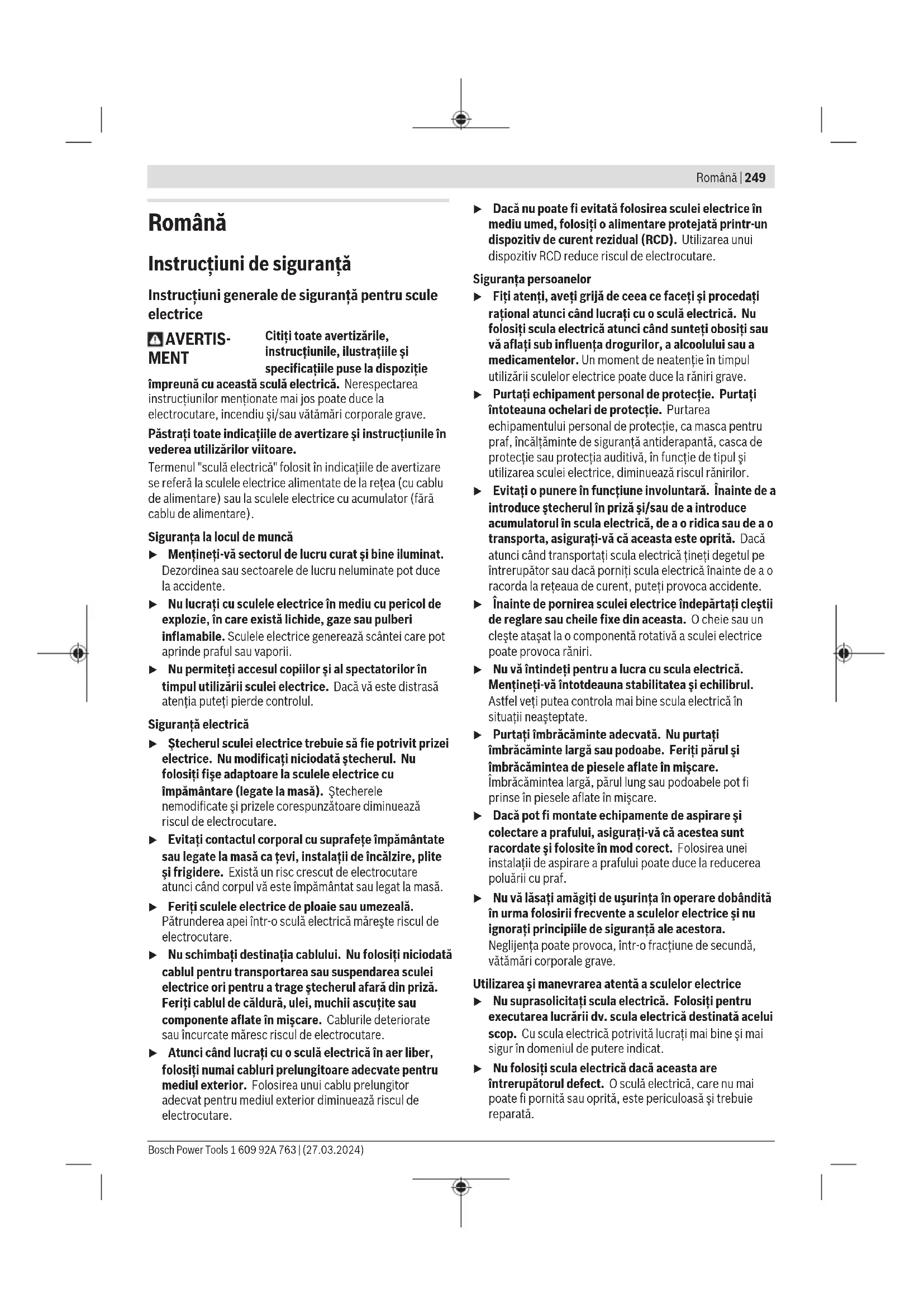 – электр құралына артық жүктеме түскеннен орын алған ақаулар. (Құралға артық жүктеме түсудің шартсыз белгілеріне мыналар жатады: құбылу түсінің пайда болуы немесе электр құралы бөліктері мен түйіндерінің деформациясы немесе қорытылуы, жоғары температура әсерінен электр қозғалтқышындағы сымдар оқшаулағышының қараюы немесе көмірленуі.) Кәдеге жарату Электр құралдар, жабдықтар және бумаларын айналаны қорғайтын кәдеге жаратуға апару қажет. Электр құралдарды үй қоқысына тастамаңыз! Тек қана ЕО елдері үшін: Электр және электрондық ескі құралдар бойынша Еуропа 2012/19/EU ережесі және ұлттық заңдарға сайкес пайдалануға жарамсыз электр құралдары бөлек жиналып, кәдеге жаратылуы қажет. Қате жолмен кәдеге жаратылған ескі электрлік және электрондық құрылғылар қауіпті заттардың болу мүмкіндігіне байланысты қоршаған ортаға және адам денсаулығына зиянды әсер тигізуі мүмкін. 1 609 92A 763 | (27.03.2024) Bosch Power ToolsRomână | 249 Română Instrucţiuni de siguranţă Instrucţiuni generale de siguranţă pentru scule electrice AVERTIS- MENT Citiţi toate avertizările, instrucţiunile, ilustraţiile şi specificaţiile puse la dispoziţie împreună cu această sculă electrică. Nerespectarea instrucţiunilor menţionate mai jos poate duce la electrocutare, incendiu şi/sau vătămări corporale grave. Păstraţi toate indicaţiile de avertizare şi instrucţiunile în vederea utilizărilor viitoare. Termenul "sculă electrică" folosit în indicaţiile de avertizare se referă la sculele electrice alimentate de la reţea (cu cablu de alimentare) sau la sculele electrice cu acumulator (fără cablu de alimentare). Siguranţa la locul de muncă u Menţineţi‑vă sectorul de lucru curat şi bine iluminat. Dezordinea sau sectoarele de lucru neluminate pot duce la accidente. u Nu lucraţi cu sculele electrice în mediu cu pericol de explozie, în care există lichide, gaze sau pulberi inflamabile. Sculele electrice generează scântei care pot aprinde praful sau vaporii. u Nu permiteţi accesul copiilor şi al spectatorilor în timpul utilizării sculei electrice. Dacă vă este distrasă atenţia puteţi pierde controlul. Siguranţă electrică u Ştecherul sculei electrice trebuie să fie potrivit prizei electrice. Nu modificaţi niciodată ştecherul. Nu folosiţi fişe adaptoare la sculele electrice cu împământare (legate la masă). Ştecherele nemodificate şi prizele corespunzătoare diminuează riscul de electrocutare. u Evitaţi contactul corporal cu suprafeţe împământate sau legate la masă ca ţevi, instalaţii de încălzire, plite şi frigidere. Există un risc crescut de electrocutare atunci când corpul vă este împământat sau legat la masă. u Feriţi sculele electrice de ploaie sau umezeală. Pătrunderea apei într‑o sculă electrică măreşte riscul de electrocutare. u Nu schimbaţi destinaţia cablului. Nu folosiţi niciodată cablul pentru transportarea sau suspendarea sculei electrice ori pentru a trage ştecherul afară din priză. Feriţi cablul de căldură, ulei, muchii ascuţite sau componente aflate în mişcare. Cablurile deteriorate sau încurcate măresc riscul de electrocutare. u Atunci când lucraţi cu o sculă electrică în aer liber, folosiţi numai cabluri prelungitoare adecvate pentru mediul exterior. Folosirea unui cablu prelungitor adecvat pentru mediul exterior diminuează riscul de electrocutare. u Dacă nu poate fi evitată folosirea sculei electrice în mediu umed, folosiţi o alimentare protejată printr-un dispozitiv de curent rezidual (RCD). Utilizarea unui dispozitiv RCD reduce riscul de electrocutare. Siguranţa persoanelor u Fiţi atenţi, aveţi grijă de ceea ce faceţi şi procedaţi raţional atunci când lucraţi cu o sculă electrică. Nu folosiţi scula electrică atunci când sunteţi obosiţi sau vă aflaţi sub influenţa drogurilor, a alcoolului sau a medicamentelor. Un moment de neatenţie în timpul utilizării sculelor electrice poate duce la răniri grave. u Purtaţi echipament personal de protecţie. Purtaţi întoteauna ochelari de protecţie. Purtarea echipamentului personal de protecţie, ca masca pentru praf, încălţăminte de siguranţă antiderapantă, casca de protecţie sau protecţia auditivă, în funcţie de tipul şi utilizarea sculei electrice, diminuează riscul rănirilor. u Evitaţi o punere în funcţiune involuntară. Înainte de a introduce ştecherul în priză şi/sau de a introduce acumulatorul în scula electrică, de a o ridica sau de a o transporta, asiguraţi‑vă că aceasta este oprită. Dacă atunci când transportaţi scula electrică ţineţi degetul pe întrerupător sau dacă porniţi scula electrică înainte de a o racorda la reţeaua de curent, puteţi provoca accidente. u Înainte de pornirea sculei electrice îndepărtaţi cleştii de reglare sau cheile fixe din aceasta. O cheie sau un cleşte ataşat la o componentă rotativă a sculei electrice poate provoca răniri. u Nu vă întindeţi pentru a lucra cu scula electrică. Menţineţi-vă întotdeauna stabilitatea şi echilibrul. Astfel veţi putea controla mai bine scula electrică în situaţii neaşteptate. u Purtaţi îmbrăcăminte adecvată. Nu purtaţi îmbrăcăminte largă sau podoabe. Feriţi p