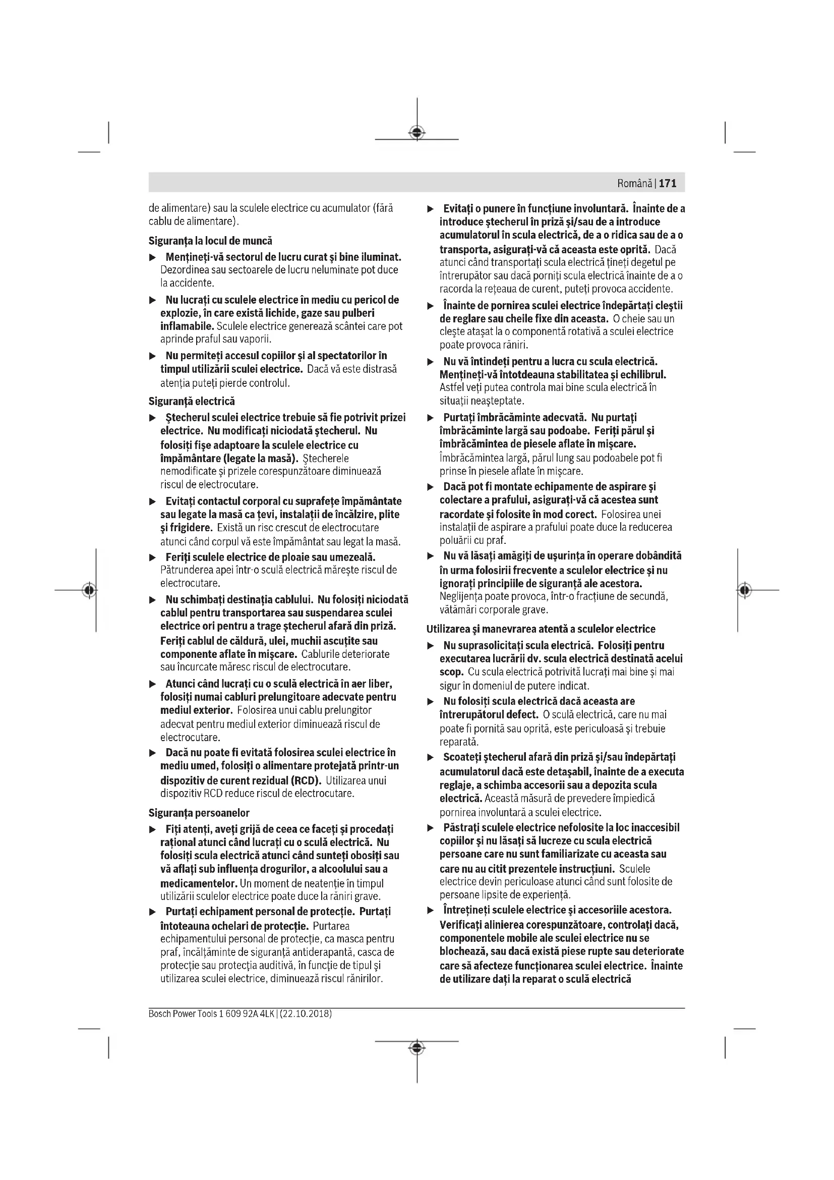 Бұл литий-иондық аккумуляторлар қауіпті тауарларға қойылатын талаптарға сай болуы керек. Пайдаланушы аккумуляторларды көшеде қосымша құжаттарсыз тасымалдай алады. Үшінші тұлғалар (мысалы, әуе көлігі немесе жіберу) орамаға және маркаларға қойылатын арнайы талаптарды сақтау керек. Жіберуге дайындау кезінде қауіпті жүктерді тасымалдау маманымен хабарласу керек. Аккумуляторды корпусы зақымдалған болса ғана жіберіңіз. Ашық түйіспелерді желімдеңіз және аккумуляторды орамада қозғалмайтындай ораңыз. Қажет болса, қосымша ұлттық ережелерді сақтаңыз. Кәдеге жарату Электр құралдарды, аккумуляторларды, керек-жарақтарды және орау материалдарын экологиялық тұрғыдан дұрыс утилизациялауға тапсыру керек. Электр құралдарды және аккумуляторларды/батареяларды үй қоқысына тастамаңыз! Тек қана ЕО елдері үшін: Еуропа 2012/19/EU ережесі бойынша жарамсыз электр құралдары және Еуропа 2006/66/EC ережесі бойынша зақымдалған немесе ескі аккумулятор/батареялар бөлек жиналып кәдеге жаратылуы қажет. Аккумуляторлар/батареялар: Литий-иондық: Тасымалдау бөліміндегі нұсқауларды орындаңыз (қараңыз „Тасымалдау“, Бет170). Română Instrucţiuni de siguranţă Instrucţiuni generale de siguranţă pentru scule electrice AVERTISMENT Citiţi toate avertizările, instrucţiunile, ilustraţiile şi specificaţiile puse la dispoziţie împreună cu această sculă electrică. Nerespectarea instrucţiunilor menţionate mai jos poate duce la electrocutare, incendiu şi/sau vătămări corporale grave. Păstraţi toate indicaţiile de avertizare şi instrucţiunile în vederea utilizărilor viitoare. Termenul "sculă electrică" folosit în indicaţiile de avertizare se referă la sculele electrice alimentate de la reţea (cu cablude alimentare) sau la sculele electrice cu acumulator (fără cablu de alimentare). Siguranţa la locul de muncă u Menţineţi‑vă sectorul de lucru curat şi bine iluminat. Dezordinea sau sectoarele de lucru neluminate pot duce la accidente. u Nu lucraţi cu sculele electrice în mediu cu pericol de explozie, în care există lichide, gaze sau pulberi inflamabile. Sculele electrice generează scântei care pot aprinde praful sau vaporii. u Nu permiteţi accesul copiilor şi al spectatorilor în timpul utilizării sculei electrice. Dacă vă este distrasă atenţia puteţi pierde controlul. Siguranţă electrică u Ştecherul sculei electrice trebuie să fie potrivit prizei electrice. Nu modificaţi niciodată ştecherul. Nu folosiţi fişe adaptoare la sculele electrice cu împământare (legate la masă). Ştecherele nemodificate şi prizele corespunzătoare diminuează riscul de electrocutare. u Evitaţi contactul corporal cu suprafeţe împământate sau legate la masă ca ţevi, instalaţii de încălzire, plite şi frigidere. Există un risc crescut de electrocutare atunci când corpul vă este împământat sau legat la masă. u Feriţi sculele electrice de ploaie sau umezeală. Pătrunderea apei într‑o sculă electrică măreşte riscul de electrocutare. u Nu schimbaţi destinaţia cablului. Nu folosiţi niciodată cablul pentru transportarea sau suspendarea sculei electrice ori pentru a trage ştecherul afară din priză. Feriţi cablul de căldură, ulei, muchii ascuţite sau componente aflate în mişcare. Cablurile deteriorate sau încurcate măresc riscul de electrocutare. u Atunci când lucraţi cu o sculă electrică în aer liber, folosiţi numai cabluri prelungitoare adecvate pentru mediul exterior. Folosirea unui cablu prelungitor adecvat pentru mediul exterior diminuează riscul de electrocutare. u Dacă nu poate fi evitată folosirea sculei electrice în mediu umed, folosiţi o alimentare protejată printr-un dispozitiv de curent rezidual (RCD). Utilizarea unui dispozitiv RCD reduce riscul de electrocutare. Siguranţa persoanelor u Fiţi atenţi, aveţi grijă de ceea ce faceţi şi procedaţi raţional atunci când lucraţi cu o sculă electrică. Nu folosiţi scula electrică atunci când sunteţi obosiţi sau vă aflaţi sub influenţa drogurilor, a alcoolului sau a medicamentelor. Un moment de neatenţie în timpul utilizării sculelor electrice poate duce la răniri grave. u Purtaţi echipament personal de protecţie. Purtaţi întoteauna ochelari de protecţie. Purtarea echipamentului personal de protecţie, ca masca pentru praf, încălţăminte de siguranţă antiderapantă, casca de protecţie sau protecţia auditivă, în funcţie de tipul şi utilizarea sculei electrice, diminuează riscul rănirilor. u Evitaţi o punere în funcţiune involuntară. Înainte de a introduce ştecherul în priză şi/sau de a introduce acumulatorul în scula electrică, de a o ridica sau de a o transporta, asiguraţi‑vă că aceasta este oprită. Dacă atunci când transportaţi scula electrică ţineţi degetul pe întrerupător sau dacă porniţi scula electrică înainte de a o racorda la reţeaua de curent, puteţi provoca accidente. u Înainte de pornirea sculei electrice îndepărtaţi cleştii de reglare sau cheile fixe din aceasta. O cheie sau un cleşte ataşat la o 