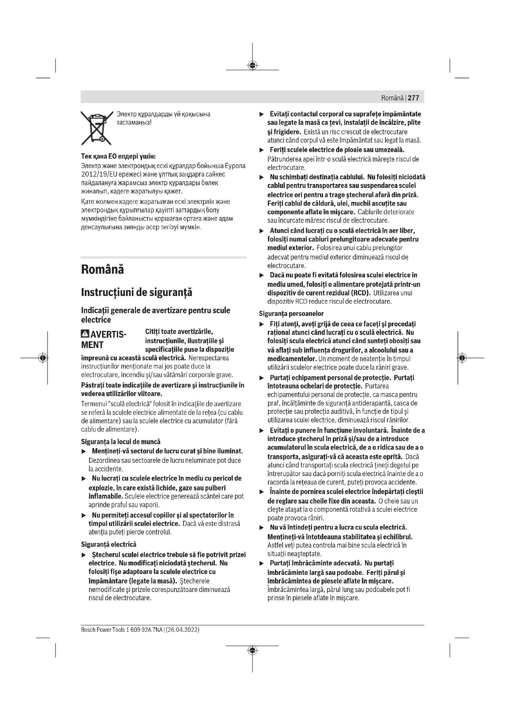 – электр құралына артық жүктеме түскеннен орын алған ақаулар. (Құралға артық жүктеме түсудің шартсыз белгілеріне мыналар жатады: құбылу түсінің пайда болуы немесе электр құралы бөліктері мен түйіндерінің деформациясы немесе қорытылуы, жоғары температура әсерінен электр қозғалтқышындағы сымдар оқшаулағышының қараюы немесе көмірленуі.) Кәдеге жарату Электр құралдар, жабдықтар және бумаларын айналаны қорғайтын кәдеге жаратуға апару қажет. 1 609 92A 7NA | (26.04.2022) Bosch Power ToolsRomână | 277 Электр құралдарды үй қоқысына тастамаңыз! Тек қана ЕО елдері үшін: Электр және электрондық ескі құралдар бойынша Еуропа 2012/19/EU ережесі және ұлттық заңдарға сайкес пайдалануға жарамсыз электр құралдары бөлек жиналып, кәдеге жаратылуы қажет. Қате жолмен кәдеге жаратылған ескі электрлік және электрондық құрылғылар қауіпті заттардың болу мүмкіндігіне байланысты қоршаған ортаға және адам денсаулығына зиянды әсер тигізуі мүмкін. Română Instrucţiuni de siguranţă Indicaţii generale de avertizare pentru scule electrice AVERTIS- MENT Citiţi toate avertizările, instrucţiunile, ilustraţiile şi specificaţiile puse la dispoziţie împreună cu această sculă electrică. Nerespectarea instrucţiunilor menţionate mai jos poate duce la electrocutare, incendiu şi/sau vătămări corporale grave. Păstraţi toate indicaţiile de avertizare şi instrucţiunile în vederea utilizărilor viitoare. Termenul "sculă electrică" folosit în indicaţiile de avertizare se referă la sculele electrice alimentate de la reţea (cu cablu de alimentare) sau la sculele electrice cu acumulator (fără cablu de alimentare). Siguranţa la locul de muncă u Menţineţi‑vă sectorul de lucru curat şi bine iluminat. Dezordinea sau sectoarele de lucru neluminate pot duce la accidente. u Nu lucraţi cu sculele electrice în mediu cu pericol de explozie, în care există lichide, gaze sau pulberi inflamabile. Sculele electrice generează scântei care pot aprinde praful sau vaporii. u Nu permiteţi accesul copiilor şi al spectatorilor în timpul utilizării sculei electrice. Dacă vă este distrasă atenţia puteţi pierde controlul. Siguranţă electrică u Ştecherul sculei electrice trebuie să fie potrivit prizei electrice. Nu modificaţi niciodată ştecherul. Nu folosiţi fişe adaptoare la sculele electrice cu împământare (legate la masă). Ştecherele nemodificate şi prizele corespunzătoare diminuează riscul de electrocutare. u Evitaţi contactul corporal cu suprafeţe împământate sau legate la masă ca ţevi, instalaţii de încălzire, plite şi frigidere. Există un risc crescut de electrocutare atunci când corpul vă este împământat sau legat la masă. u Feriţi sculele electrice de ploaie sau umezeală. Pătrunderea apei într‑o sculă electrică măreşte riscul de electrocutare. u Nu schimbaţi destinaţia cablului. Nu folosiţi niciodată cablul pentru transportarea sau suspendarea sculei electrice ori pentru a trage ştecherul afară din priză. Feriţi cablul de căldură, ulei, muchii ascuţite sau componente aflate în mişcare. Cablurile deteriorate sau încurcate măresc riscul de electrocutare. u Atunci când lucraţi cu o sculă electrică în aer liber, folosiţi numai cabluri prelungitoare adecvate pentru mediul exterior. Folosirea unui cablu prelungitor adecvat pentru mediul exterior diminuează riscul de electrocutare. u Dacă nu poate fi evitată folosirea sculei electrice în mediu umed, folosiţi o alimentare protejată printr-un dispozitiv de curent rezidual (RCD). Utilizarea unui dispozitiv RCD reduce riscul de electrocutare. Siguranţa persoanelor u Fiţi atenţi, aveţi grijă de ceea ce faceţi şi procedaţi raţional atunci când lucraţi cu o sculă electrică. Nu folosiţi scula electrică atunci când sunteţi obosiţi sau vă aflaţi sub influenţa drogurilor, a alcoolului sau a medicamentelor. Un moment de neatenţie în timpul utilizării sculelor electrice poate duce la răniri grave. u Purtaţi echipament personal de protecţie. Purtaţi întoteauna ochelari de protecţie. Purtarea echipamentului personal de protecţie, ca masca pentru praf, încălţăminte de siguranţă antiderapantă, casca de protecţie sau protecţia auditivă, în funcţie de tipul şi utilizarea sculei electrice, diminuează riscul rănirilor. u Evitaţi o punere în funcţiune involuntară. Înainte de a introduce ştecherul în priză şi/sau de a introduce acumulatorul în scula electrică, de a o ridica sau de a o transporta, asiguraţi‑vă că aceasta este oprită. Dacă atunci când transportaţi scula electrică ţineţi degetul pe întrerupător sau dacă porniţi scula electrică înainte de a o racorda la reţeaua de curent, puteţi provoca accidente. u Înainte de pornirea sculei electrice îndepărtaţi cleştii de reglare sau cheile fixe din aceasta. O cheie sau un cleşte ataşat la o componentă rotativă a sculei electrice poate provoca răniri. u Nu vă întindeţi pentru a lucra cu scula electrică. Menţineţi-vă întotdeauna stabilitatea şi echilibrul. Astfel veţi putea controla mai bine scula electrică în situaţii neaşteptate. u Purtaţi îmbrăcăminte adecvată. Nu purtaţi îmbrăcăminte largă sau podoabe. Feriţi păru