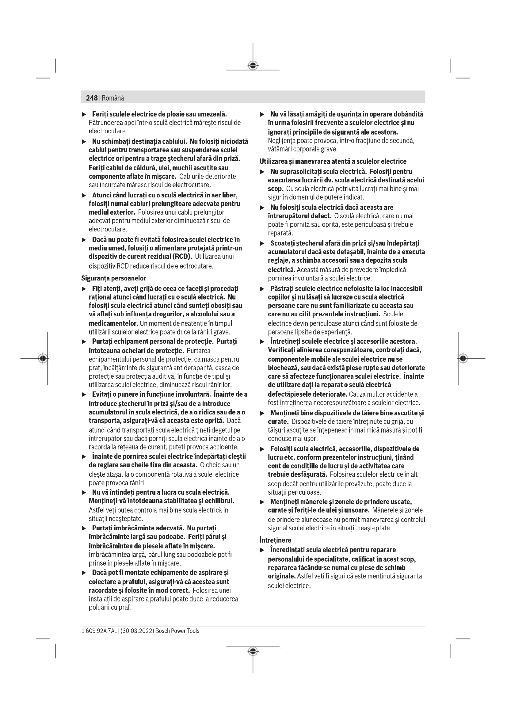 – электр құралына артық жүктеме түскеннен орын алған ақаулар. (Құралға артық жүктеме түсудің шартсыз белгілеріне мыналар жатады: құбылу түсінің пайда болуы немесе электр құралы бөліктері мен түйіндерінің деформациясы немесе қорытылуы, жоғары температура әсерінен электр қозғалтқышындағы сымдар оқшаулағышының қараюы немесе көмірленуі.) Кәдеге жарату Электр құралдар, жабдықтар және бумаларын айналаны қорғайтын кәдеге жаратуға апару қажет. Электр құралдарды үй қоқысына тастамаңыз! Тек қана ЕО елдері үшін: Электр және электрондық ескі құралдар бойынша Еуропа 2012/19/EU ережесі және ұлттық заңдарға сайкес пайдалануға жарамсыз электр құралдары бөлек жиналып, кәдеге жаратылуы қажет. Қате жолмен кәдеге жаратылған ескі электрлік және электрондық құрылғылар қауіпті заттардың болу мүмкіндігіне байланысты қоршаған ортаға және адам денсаулығына зиянды әсер тигізуі мүмкін. Română Instrucţiuni de siguranţă Instrucţiuni generale de siguranţă pentru scule electrice AVERTIS- MENT Citiţi toate avertizările, instrucţiunile, ilustraţiile şi specificaţiile puse la dispoziţie împreună cu această sculă electrică. Nerespectarea instrucţiunilor menţionate mai jos poate duce la electrocutare, incendiu şi/sau vătămări corporale grave. Păstraţi toate indicaţiile de avertizare şi instrucţiunile în vederea utilizărilor viitoare. Termenul "sculă electrică" folosit în indicaţiile de avertizare se referă la sculele electrice alimentate de la reţea (cu cablu de alimentare) sau la sculele electrice cu acumulator (fără cablu de alimentare). Siguranţa la locul de muncă u Menţineţi‑vă sectorul de lucru curat şi bine iluminat. Dezordinea sau sectoarele de lucru neluminate pot duce la accidente. u Nu lucraţi cu sculele electrice în mediu cu pericol de explozie, în care există lichide, gaze sau pulberi inflamabile. Sculele electrice generează scântei care pot aprinde praful sau vaporii. u Nu permiteţi accesul copiilor şi al spectatorilor în timpul utilizării sculei electrice. Dacă vă este distrasă atenţia puteţi pierde controlul. Siguranţă electrică u Ştecherul sculei electrice trebuie să fie potrivit prizei electrice. Nu modificaţi niciodată ştecherul. Nu folosiţi fişe adaptoare la sculele electrice cu împământare (legate la masă). Ştecherele nemodificate şi prizele corespunzătoare diminuează riscul de electrocutare. u Evitaţi contactul corporal cu suprafeţe împământate sau legate la masă ca ţevi, instalaţii de încălzire, plite şi frigidere. Există un risc crescut de electrocutare atunci când corpul vă este împământat sau legat la masă. Bosch Power Tools 1 609 92A 7AL | (30.03.2022)248 | Română u Feriţi sculele electrice de ploaie sau umezeală. Pătrunderea apei într‑o sculă electrică măreşte riscul de electrocutare. u Nu schimbaţi destinaţia cablului. Nu folosiţi niciodată cablul pentru transportarea sau suspendarea sculei electrice ori pentru a trage ştecherul afară din priză. Feriţi cablul de căldură, ulei, muchii ascuţite sau componente aflate în mişcare. Cablurile deteriorate sau încurcate măresc riscul de electrocutare. u Atunci când lucraţi cu o sculă electrică în aer liber, folosiţi numai cabluri prelungitoare adecvate pentru mediul exterior. Folosirea unui cablu prelungitor adecvat pentru mediul exterior diminuează riscul de electrocutare. u Dacă nu poate fi evitată folosirea sculei electrice în mediu umed, folosiţi o alimentare protejată printr-un dispozitiv de curent rezidual (RCD). Utilizarea unui dispozitiv RCD reduce riscul de electrocutare. Siguranţa persoanelor u Fiţi atenţi, aveţi grijă de ceea ce faceţi şi procedaţi raţional atunci când lucraţi cu o sculă electrică. Nu folosiţi scula electrică atunci când sunteţi obosiţi sau vă aflaţi sub influenţa drogurilor, a alcoolului sau a medicamentelor. Un moment de neatenţie în timpul utilizării sculelor electrice poate duce la răniri grave. u Purtaţi echipament personal de protecţie. Purtaţi întoteauna ochelari de protecţie. Purtarea echipamentului personal de protecţie, ca masca pentru praf, încălţăminte de siguranţă antiderapantă, casca de protecţie sau protecţia auditivă, în funcţie de tipul şi utilizarea sculei electrice, diminuează riscul rănirilor. u Evitaţi o punere în funcţiune involuntară. Înainte de a introduce ştecherul în priză şi/sau de a introduce acumulatorul în scula electrică, de a o ridica sau de a o transporta, asiguraţi‑vă că aceasta este oprită. Dacă atunci când transportaţi scula electrică ţineţi degetul pe întrerupător sau dacă porniţi scula electrică înainte de a o racorda la reţeaua de curent, puteţi provoca accidente. u Înainte de pornirea sculei electrice îndepărtaţi cleştii de reglare sau cheile fixe din aceasta. O cheie sau un cleşte ataşat la o componentă rotativă a sculei electrice poate provoca răniri. u Nu vă întindeţi pentru a lucra cu scula electrică. Menţineţi-vă întotdeauna stabilitatea şi echilibrul. Astfel veţi putea controla mai bine scula electrică în situaţii neaşteptate. u Purtaţi îmbrăcăminte adecvată. Nu purtaţi îmbrăcăminte largă sau podoabe. Feriţi p