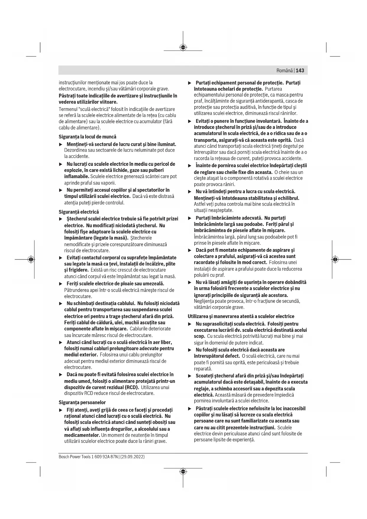 Ұсынылған литий-иондық аккумуляторлар қауіпті тауарларға қойылатын талаптарға бағынады. Пайдаланушы аккумуляторларды көшеде қосымша құжаттарсыз тасымалдай алады. Үшінші тұлғалар (мысалы, әуе көлігі немесе жіберу) орамаға және маркаларға қойылатын арнайы талаптарды сақтау керек. Жіберуге дайындау кезінде қауіпті жүктерді тасымалдау маманымен хабарласу керек. Аккумуляторды корпусы зақымдалған болса ғана жіберіңіз. Ашық түйіспелерді желімдеңіз және аккумуляторды орамада қозғалмайтындай ораңыз. Қажет болса, қосымша ұлттық ережелерді сақтаңыз. Кәдеге жарату Электр құралдарды, аккумуляторларды, керек-жарақтарды және орау материалдарын экологиялық тұрғыдан дұрыс утилизациялауға тапсыру керек. Электр құралдарды және аккумуляторларды/батареяларды үй қоқысына тастамаңыз! Тек қана ЕО елдері үшін: Ескі электрлік және электрондық құрылғылар туралы 2012/19/EU еуропалық директивасы және оның ұлттық заңнамада қолданылуы бойынша пайдалануға бұдан былай жарамсыз электрлік құралдарды және 2006/66/ ЕC еуропалық директивасы бойынша зақымдалған немесе ескірген аккумуляторларды/батареяларды бөлек жинап, қоршаған орта үшін қауіпсіз жолмен қайта өңдеуге жіберу қажет. Қате жолмен кәдеге жаратылған ескі электрлік және электрондық құрылғылар қауіпті заттардың болу мүмкіндігіне байланысты қоршаған ортаға және адам денсаулығына зиянды әсер тигізуі мүмкін. Аккумуляторлар/батареялар: Литий-иондық: Тасымалдау бөліміндегі нұсқауларды орындаңыз (қараңыз „Тасымалдау“, Бет142). Română Instrucţiuni de siguranţă Instrucţiuni generale de siguranţă pentru scule electrice AVERTIS- MENT Citiţi toate avertizările, instrucţiunile, ilustraţiile şi specificaţiile puse la dispoziţie împreună cu această sculă electrică. Nerespectarea 1 609 92A 87N | (29.09.2022) Bosch Power ToolsRomână | 143 instrucţiunilor menţionate mai jos poate duce la electrocutare, incendiu şi/sau vătămări corporale grave. Păstraţi toate indicaţiile de avertizare şi instrucţiunile în vederea utilizărilor viitoare. Termenul "sculă electrică" folosit în indicaţiile de avertizare se referă la sculele electrice alimentate de la reţea (cu cablu de alimentare) sau la sculele electrice cu acumulator (fără cablu de alimentare). Siguranţa la locul de muncă u Menţineţi‑vă sectorul de lucru curat şi bine iluminat. Dezordinea sau sectoarele de lucru neluminate pot duce la accidente. u Nu lucraţi cu sculele electrice în mediu cu pericol de explozie, în care există lichide, gaze sau pulberi inflamabile. Sculele electrice generează scântei care pot aprinde praful sau vaporii. u Nu permiteţi accesul copiilor şi al spectatorilor în timpul utilizării sculei electrice. Dacă vă este distrasă atenţia puteţi pierde controlul. Siguranţă electrică u Ştecherul sculei electrice trebuie să fie potrivit prizei electrice. Nu modificaţi niciodată ştecherul. Nu folosiţi fişe adaptoare la sculele electrice cu împământare (legate la masă). Ştecherele nemodificate şi prizele corespunzătoare diminuează riscul de electrocutare. u Evitaţi contactul corporal cu suprafeţe împământate sau legate la masă ca ţevi, instalaţii de încălzire, plite şi frigidere. Există un risc crescut de electrocutare atunci când corpul vă este împământat sau legat la masă. u Feriţi sculele electrice de ploaie sau umezeală. Pătrunderea apei într‑o sculă electrică măreşte riscul de electrocutare. u Nu schimbaţi destinaţia cablului. Nu folosiţi niciodată cablul pentru transportarea sau suspendarea sculei electrice ori pentru a trage ştecherul afară din priză. Feriţi cablul de căldură, ulei, muchii ascuţite sau componente aflate în mişcare. Cablurile deteriorate sau încurcate măresc riscul de electrocutare. u Atunci când lucraţi cu o sculă electrică în aer liber, folosiţi numai cabluri prelungitoare adecvate pentru mediul exterior. Folosirea unui cablu prelungitor adecvat pentru mediul exterior diminuează riscul de electrocutare. u Dacă nu poate fi evitată folosirea sculei electrice în mediu umed, folosiţi o alimentare protejată printr-un dispozitiv de curent rezidual (RCD). Utilizarea unui dispozitiv RCD reduce riscul de electrocutare. Siguranţa persoanelor u Fiţi atenţi, aveţi grijă de ceea ce faceţi şi procedaţi raţional atunci când lucraţi cu o sculă electrică. Nu folosiţi scula electrică atunci când sunteţi obosiţi sau vă aflaţi sub influenţa drogurilor, a alcoolului sau a medicamentelor. Un moment de neatenţie în timpul utilizării sculelor electrice poate duce la răniri grave. u Purtaţi echipament personal de protecţie. Purtaţi întoteauna ochelari de protecţie. Purtarea echipamentului personal de protecţie, ca masca pentru p