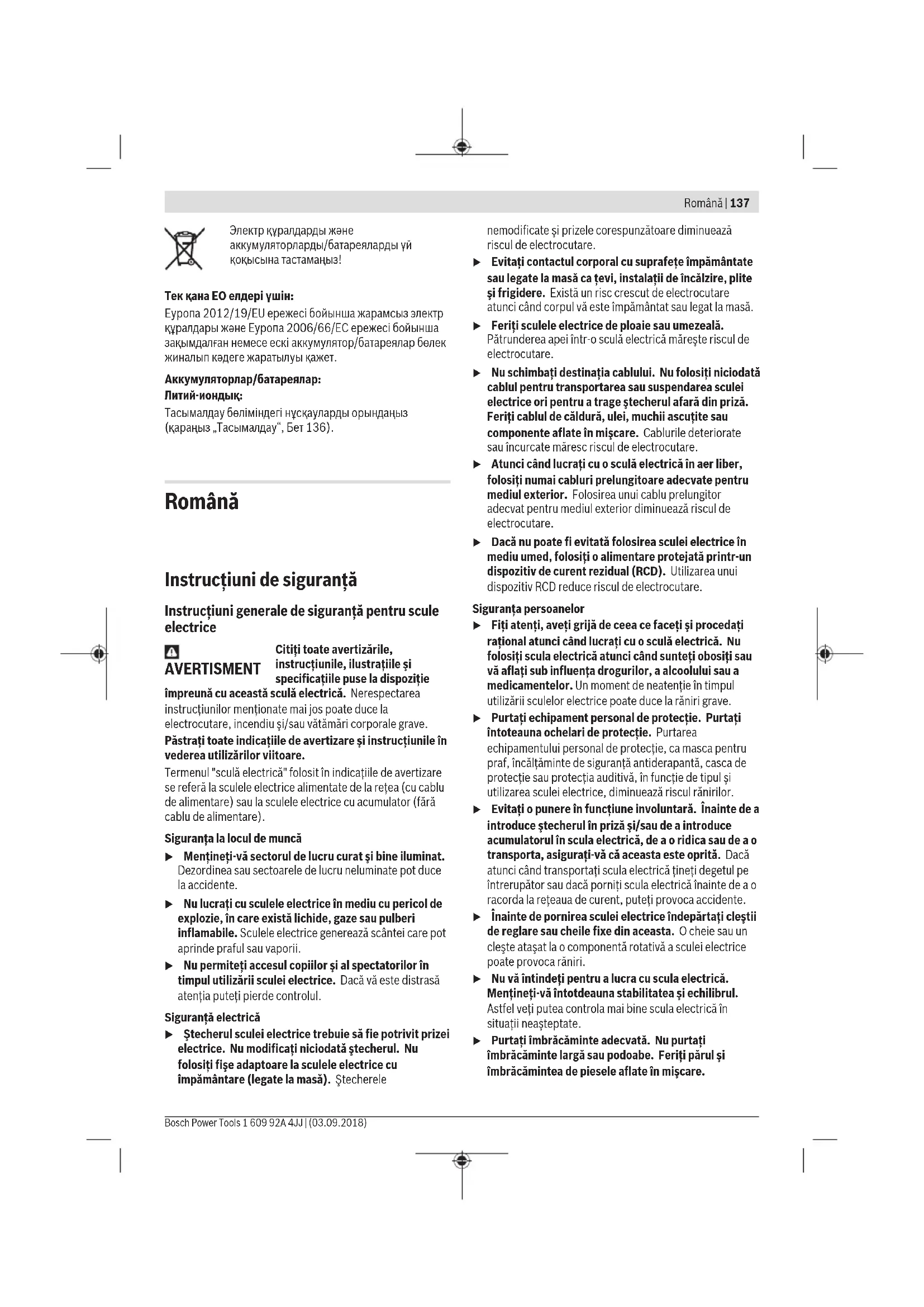 Бұл литий-иондық аккумуляторлар қауіпті тауарларға қойылатын талаптарға сай болуы керек. Пайдаланушы аккумуляторларды көшеде қосымша құжаттарсыз тасымалдай алады. Үшінші тұлғалар (мысалы, әуе көлігі немесе жіберу) орамаға және маркаларға қойылатын арнайы талаптарды сақтау керек. Жіберуге дайындау кезінде қауіпті жүктерді тасымалдау маманымен хабарласу керек. Аккумуляторды корпусы зақымдалған болса ғана жіберіңіз. Ашық түйіспелерді желімдеңіз және аккумуляторды орамада қозғалмайтындай ораңыз. Қажет болса, қосымша ұлттық ережелерді сақтаңыз. Кәдеге жарату Электр құралдарды, аккумуляторларды, керек-жарақтарды және орау материалдарын экологиялық тұрғыдан дұрыс утилизациялауға тапсыру керек.Электр құралдарды және аккумуляторларды/батареяларды үй қоқысына тастамаңыз! Тек қана ЕО елдері үшін: Еуропа 2012/19/EU ережесі бойынша жарамсыз электр құралдары және Еуропа 2006/66/EC ережесі бойынша зақымдалған немесе ескі аккумулятор/батареялар бөлек жиналып кәдеге жаратылуы қажет. Аккумуляторлар/батареялар: Литий-иондық: Тасымалдау бөліміндегі нұсқауларды орындаңыз (қараңыз „Тасымалдау“, Бет136). Română Instrucţiuni de siguranţă Instrucţiuni generale de siguranţă pentru scule electrice AVERTISMENT Citiţi toate avertizările, instrucţiunile, ilustraţiile şi specificaţiile puse la dispoziţie împreună cu această sculă electrică. Nerespectarea instrucţiunilor menţionate mai jos poate duce la electrocutare, incendiu şi/sau vătămări corporale grave. Păstraţi toate indicaţiile de avertizare şi instrucţiunile în vederea utilizărilor viitoare. Termenul "sculă electrică" folosit în indicaţiile de avertizare se referă la sculele electrice alimentate de la reţea (cu cablu de alimentare) sau la sculele electrice cu acumulator (fără cablu de alimentare). Siguranţa la locul de muncă u Menţineţi‑vă sectorul de lucru curat şi bine iluminat. Dezordinea sau sectoarele de lucru neluminate pot duce la accidente. u Nu lucraţi cu sculele electrice în mediu cu pericol de explozie, în care există lichide, gaze sau pulberi inflamabile. Sculele electrice generează scântei care pot aprinde praful sau vaporii. u Nu permiteţi accesul copiilor şi al spectatorilor în timpul utilizării sculei electrice. Dacă vă este distrasă atenţia puteţi pierde controlul. Siguranţă electrică u Ştecherul sculei electrice trebuie să fie potrivit prizei electrice. Nu modificaţi niciodată ştecherul. Nu folosiţi fişe adaptoare la sculele electrice cu împământare (legate la masă). Ştecherele nemodificate şi prizele corespunzătoare diminuează riscul de electrocutare. u Evitaţi contactul corporal cu suprafeţe împământate sau legate la masă ca ţevi, instalaţii de încălzire, plite şi frigidere. Există un risc crescut de electrocutare atunci când corpul vă este împământat sau legat la masă. u Feriţi sculele electrice de ploaie sau umezeală. Pătrunderea apei într‑o sculă electrică măreşte riscul de electrocutare. u Nu schimbaţi destinaţia cablului. Nu folosiţi niciodată cablul pentru transportarea sau suspendarea sculei electrice ori pentru a trage ştecherul afară din priză. Feriţi cablul de căldură, ulei, muchii ascuţite sau componente aflate în mişcare. Cablurile deteriorate sau încurcate măresc riscul de electrocutare. u Atunci când lucraţi cu o sculă electrică în aer liber, folosiţi numai cabluri prelungitoare adecvate pentru mediul exterior. Folosirea unui cablu prelungitor adecvat pentru mediul exterior diminuează riscul de electrocutare. u Dacă nu poate fi evitată folosirea sculei electrice în mediu umed, folosiţi o alimentare protejată printr-un dispozitiv de curent rezidual (RCD). Utilizarea unui dispozitiv RCD reduce riscul de electrocutare. Siguranţa persoanelor u Fiţi atenţi, aveţi grijă de ceea ce faceţi şi procedaţi raţional atunci când lucraţi cu o sculă electrică. Nu folosiţi scula electrică atunci când sunteţi obosiţi sau vă aflaţi sub influenţa drogurilor, a alcoolului sau a medicamentelor. Un moment de neatenţie în timpul utilizării sculelor electrice poate duce la răniri grave. u Purtaţi echipament personal de protecţie. Purtaţi întoteauna ochelari de protecţie. Purtarea echipamentului personal de protecţie, ca masca pentru praf, încălţăminte de siguranţă antiderapantă, casca de protecţie sau protecţia auditivă, în funcţie de tipul şi utilizarea sculei electrice, diminuează riscul rănirilor. u Evitaţi o punere în funcţiune involuntară. Înainte de a introduce ştecherul în priză şi/sau de a introduce acumulatorul în scula electrică, de a o ridica sau de a o transporta, asiguraţi‑vă că aceasta este oprită. Dacă atunci când transportaţi scula electrică ţineţi degetul pe întrerupător sau dacă porniţi scula electrică înainte de a o racorda la reţeaua de curent, puteţi provoca accidente. u Înainte de pornirea sculei electrice îndepărtaţi cleştii de reglare sau cheile fixe din aceasta. O cheie sau un cleşte ataşat la o 