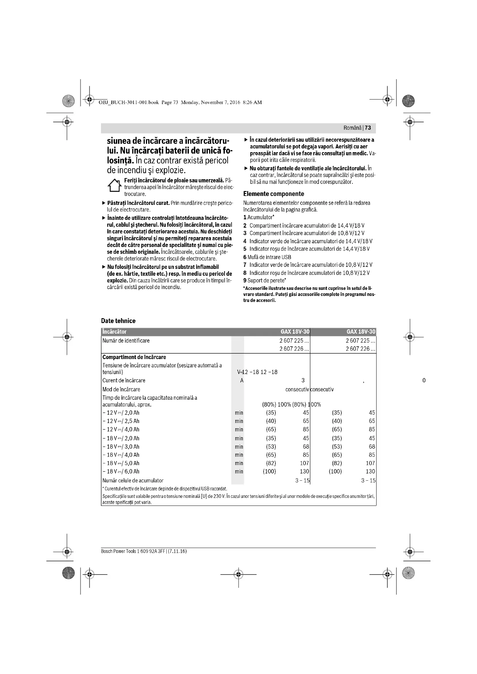Кәдеге жарату Зарядтау құралын, оның жабдықтары мен қаптамасын қоршаған ортаны қорғайтын кәдеге жарату орнына тапсыру қажет. Зарядтау құралын үй қоқысына тастамаңыз! Тек қана ЕО елдері үшін: Электр және электрондық ескі құралдар бойынша Еуропа 2012/19/EU ережесі және оның ұлттық заңдарға сай пайда- лануға жарамсыз зарядтау құралдары бөлек жиналып кәдеге жаратылуы қажет. Техникалық өзгерістер енгізу құқығы сақталады. Română Descrierea produsului şi a performanţelor Citiţi toate indicaţiile de avertizare şi instrucţiunile. Nerespectarea indicaţiilor de avertizare şi a instrucţiunilor poate provoca electrocutare, incendii şi/sau răniri grave. Păstraţi cu grijă prezentele instrucţiuni. Utilizaţi încărcătorul numai dacă sunteţi pe deplin informaţi a- supra tuturor funcţiilor acestuia şi le puteţi accesa fără restric- ţii sau dacă aţi fost instruiţi în mod corespunzător asupra lor. Instrucţiuni privind siguranţa şi protecţia muncii Acest încărcător nu este destinat utilizării de către copii şi de către persoane cu capacităţi fizice, sen- zoriale sau intelectuale limitate sau lipsite de experienţă şi cunoştinţe. Acest încărcător poate fi folosit de către copiii mai mari de 8 ani şi de către persoane cu capacităţi fizice, senzoriale sau intelectuale limitate sau lipsite de experienţă şi cunoş- tinţe, numai dacă acestea sunt su- pravegheate sau sunt instruite pri- vitor la folosirea sigură a încărcăto- rului şi înţeleg pericolele pe care a- ceasta le implică. În caz contrar exis- tă pericol de manevrare greşită şi ră- niri. Supravegheaţi copiii în timpul folo- sirii, curăţării şi întreţinerii. Astfel veţi avea siguranţa că, copiii nu se joacă cu încărcătorul. Încărcaţi numai acumulatori Li-Ion Bosch având o capacitate începând de la 1,3 Ah (de la 3 celule de acu- mulator). Tensiunea acumulatoru- lui trebuie să se potrivească cu ten- OBJ_BUCH-3011-001.book Page 72 Monday, November 7, 2016 8:26 AMRomână | 73 Bosch Power Tools 1 609 92A 3FF | (7.11.16) siunea de încărcare a încărcătoru- lui. Nu încărcaţi baterii de unică fo- losinţă. În caz contrar există pericol de incendiu şi explozie. Feriţi încărcătorul de ploaie sau umerzeală. Pă- trunderea apei în încărcător măreşte riscul de elec- trocutare. Păstraţi încărcătorul curat. Prin murdărire creşte perico- lul de electrocutare. Înainte de utilizare controlaţi întotdeauna încărcăto- rul, cablul şi ştecherul. Nu folosiţi încărcătorul, în cazul în care constataţi deteriorarea acestuia. Nu deschideţi singuri încărcătorul şi nu permiteţi repararea acestuia decât de către personal de specialitate şi numai cu pie- se de schimb originale. Încărcătoarele, cablurile şi şte- cherele deteriorate măresc riscul de electrocutare. Nu folosiţi încărcătorul pe un substrat inflamabil (de ex. hârtie, textile etc.) resp. în mediu cu pericol de explozie. Din cauza încălzirii care se produce în timpul în- cărcării există pericol de incendiu. În cazul deteriorării sau utilizării necorespunzătoare a acumulatorului se pot degaja vapori. Aerisiţi cu aer proaspăt iar dacă vi se face rău consultaţi un medic. Va- porii pot irita căile respiratorii. Nu obturaţi fantele de ventilaţie ale încărcătorului. În caz contrar, încărcătorul se poate supraîncălzi şi este posi- bil să nu mai funcţioneze în mod corespunzător. Elemente componente Numerotarea elementelor componente se referă la redarea încărcătorului de la pagina grafică. 1 Acumulator* 2 Compartiment încărcare acumulatori de 14,4 V/18 V 3 Compartiment încărcare acumulatori de 10,8 V/12 V 4 Indicator verde de încărcare acumulatori de 14,4 V/18 V 5 Indicator roşu de încărcare acumulatori de 14,4 V/18 V 6 Mufă de intrare USB 7 Indicator verde de încărcare acumulatori de 10,8 V/12 V 8 Indicator roşu de încărcare acumulatori de 10,8 V/12 V 9 Suport de perete* *Accesoriile ilustrate sau descrise nu sunt cuprinse în setul de li- vrare standard. Puteţi găsi accesoriile complete în programul nos- tru de accesorii. Date tehnice Încărcător GAX 18V-30 GAX 18V-30 Număr de identificare