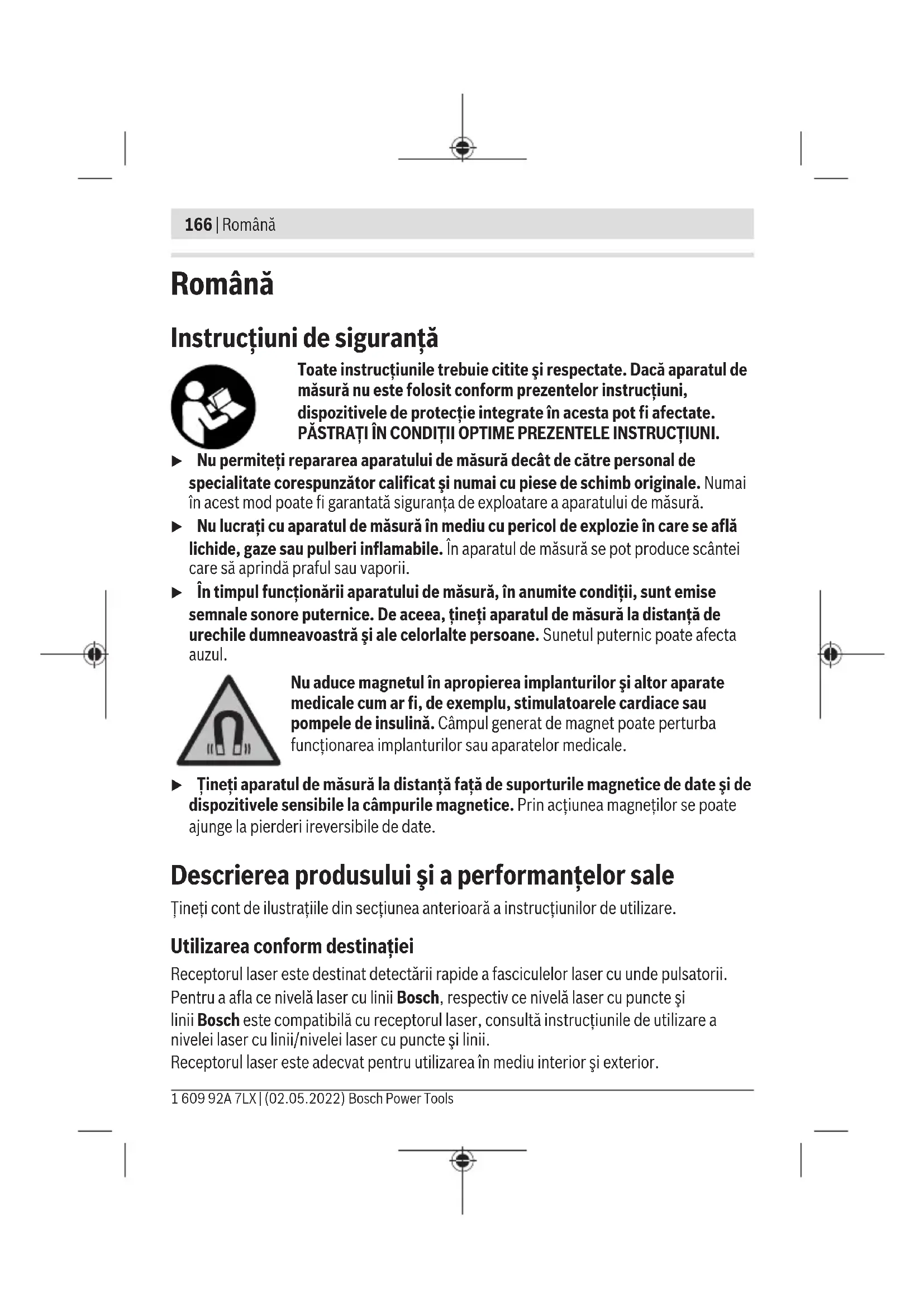 www.bosch-pt.com/serviceaddresses Кәдеге жарату Лазер қабылдағышын, керек-жарақтар мен орауыштарды қоршаған орта үшін қауіпсіз жолмен кәдеге жарату орнына тапсыру қажет. Лазер қабылдағышын және батареяларды тұрмыстық қоқысқа тастамаңыз! Тек қана ЕО елдері үшін: Ескі электрлік және электрондық құрылғылар туралы 2012/19/EU еуропалық директивасы және оның ұлттық заңнамада қолданылуы бойынша пайдалануға бұдан былай жарамсыз лазер қабылдағыштарын және 2006/66/ЕC еуропалық директивасы бойынша зақымдалған немесе ескірген аккумуляторларды/ батареяларды бөлек жинап, қоршаған орта үшін қауіпсіз жолмен қайта өңдеуге жіберу қажет. Қате жолмен кәдеге жаратылған ескі электрлік және электрондық құрылғылар қауіпті заттардың болу мүмкіндігіне байланысты қоршаған ортаға және адам денсаулығына зиянды әсер тигізуі мүмкін. Bosch Power Tools 1 609 92A 7LX | (02.05.2022)166 | Română Română Instrucţiuni de siguranţă Toate instrucţiunile trebuie citite şi respectate. Dacă aparatul de măsură nu este folosit conform prezentelor instrucţiuni, dispozitivele de protecţie integrate în acesta pot fi afectate. PĂSTRAŢI ÎN CONDIŢII OPTIME PREZENTELE INSTRUCŢIUNI. u Nu permiteţi repararea aparatului de măsură decât de către personal de specialitate corespunzător calificat şi numai cu piese de schimb originale. Numai în acest mod poate fi garantată siguranţa de exploatare a aparatului de măsură. u Nu lucraţi cu aparatul de măsură în mediu cu pericol de explozie în care se află lichide, gaze sau pulberi inflamabile. În aparatul de măsură se pot produce scântei care să aprindă praful sau vaporii. u În timpul funcţionării aparatului de măsură, în anumite condiţii, sunt emise semnale sonore puternice. De aceea, ţineţi aparatul de măsură la distanţă de urechile dumneavoastră şi ale celorlalte persoane. Sunetul puternic poate afecta auzul. Nu aduce magnetul în apropierea implanturilor şi altor aparate medicale cum ar fi, de exemplu, stimulatoarele cardiace sau pompele de insulină. Câmpul generat de magnetpoate perturba funcţionarea implanturilor sau aparatelor medicale. u Ţineţi aparatul de măsură la distanţă faţă de suporturile magnetice de date şi de dispozitivele sensibile la câmpurile magnetice. Prin acţiunea magneţilor se poate ajunge la pierderi ireversibile de date. Descrierea produsului şi a performanțelor sale Ţineţi cont de ilustraţiile din secţiunea anterioară a instrucţiunilor de utilizare. Utilizarea conform destinaţiei Receptorul laser este destinat detectării rapide a fasciculelor laser cu unde pulsatorii. Pentru a afla ce nivelă laser cu liniiBosch, respectiv ce nivelă laser cu puncte şi liniiBosch este compatibilă cu receptorul laser, consultă instrucţiunile de utilizare a nivelei laser cu linii/nivelei laser cu puncte şi linii. Receptorul laser este adecvat pentru utilizarea în mediu interior şi exterior. 1 609 92A 7LX | (02.05.2022) Bosch Power ToolsRomână | 167 Componentele ilustrate Numerotarea componentelor ilustrate se referă la schiţa receptorului laser, de la pagina grafică. (1) Difuzor (2) Tastă de reglare a preciziei de recepţie (3) Tastă de pornire/oprire (4) Tastă pentru semnalul sonor (5) Câmp de recepţie pentru fasciculul laser (6) Afişaj (7) Magneţi (8) Canelură de ghidare pentru suport (9) Indicator de direcţie cu LED „Fascicul laser sub linia centrală” (10) Marcaj median (11) Indicator de direcţie cu LED „Fascicul laser deasupra liniei centrale” (12) Număr de serie (13) Capacul compartimentului pentru baterii (14) Dispozitiv de blocare a capacului compartimentului pentru baterii (15) Linie centrală cu LED (spate) (16) Suport