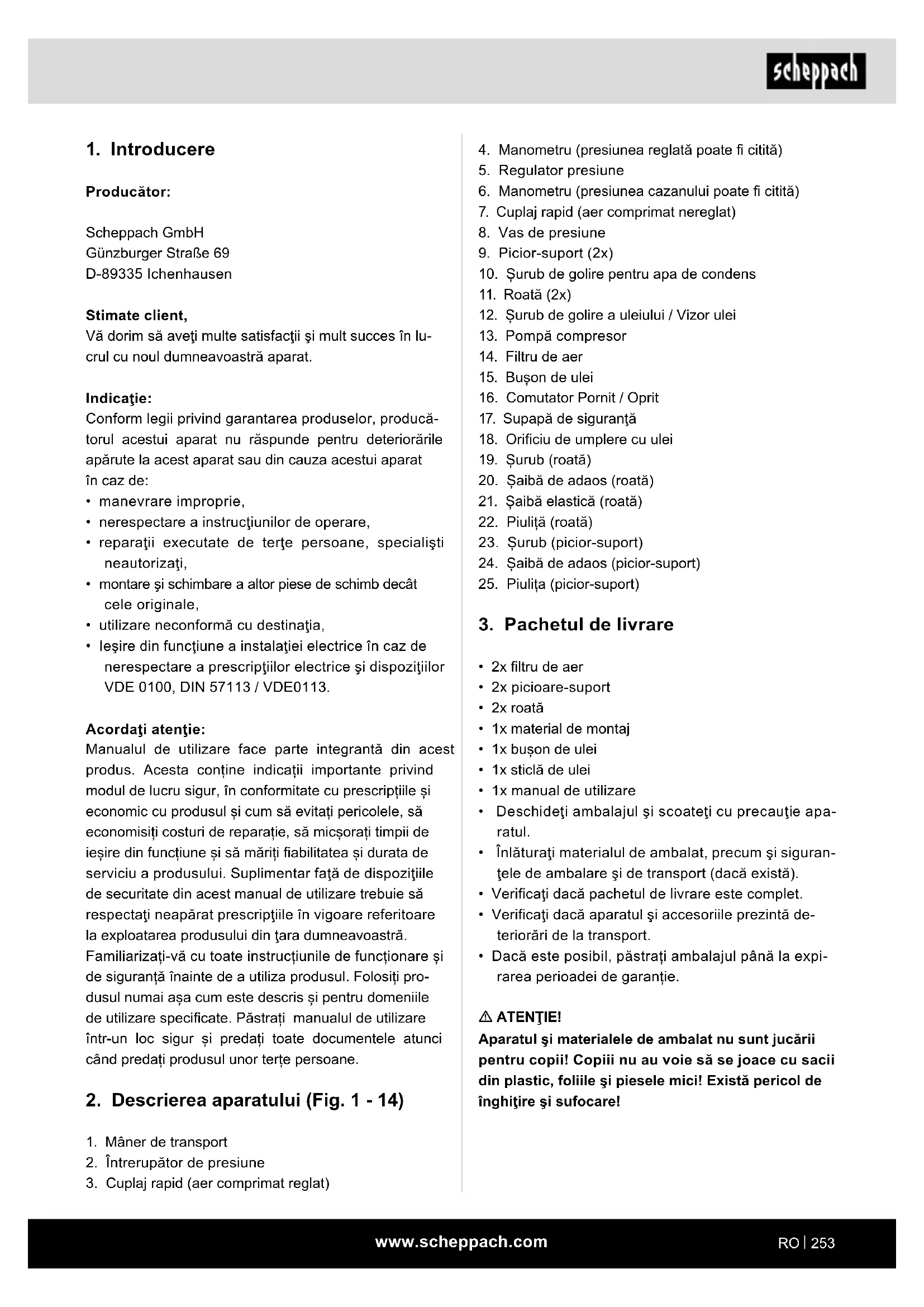 Producător: Scheppach GmbH Günzburger Straße 69 D-89335 Ichenhausen Stimate client, Vă dorim să aveţi multe satisfacţii şi mult succes în lu- crul cu noul dumneavoastră aparat. Indicaţie: Conform legii privind garantarea produselor, producă- torul acestui aparat nu răspunde pentru deteriorările apărute la acest aparat sau din cauza acestui aparat în caz de: