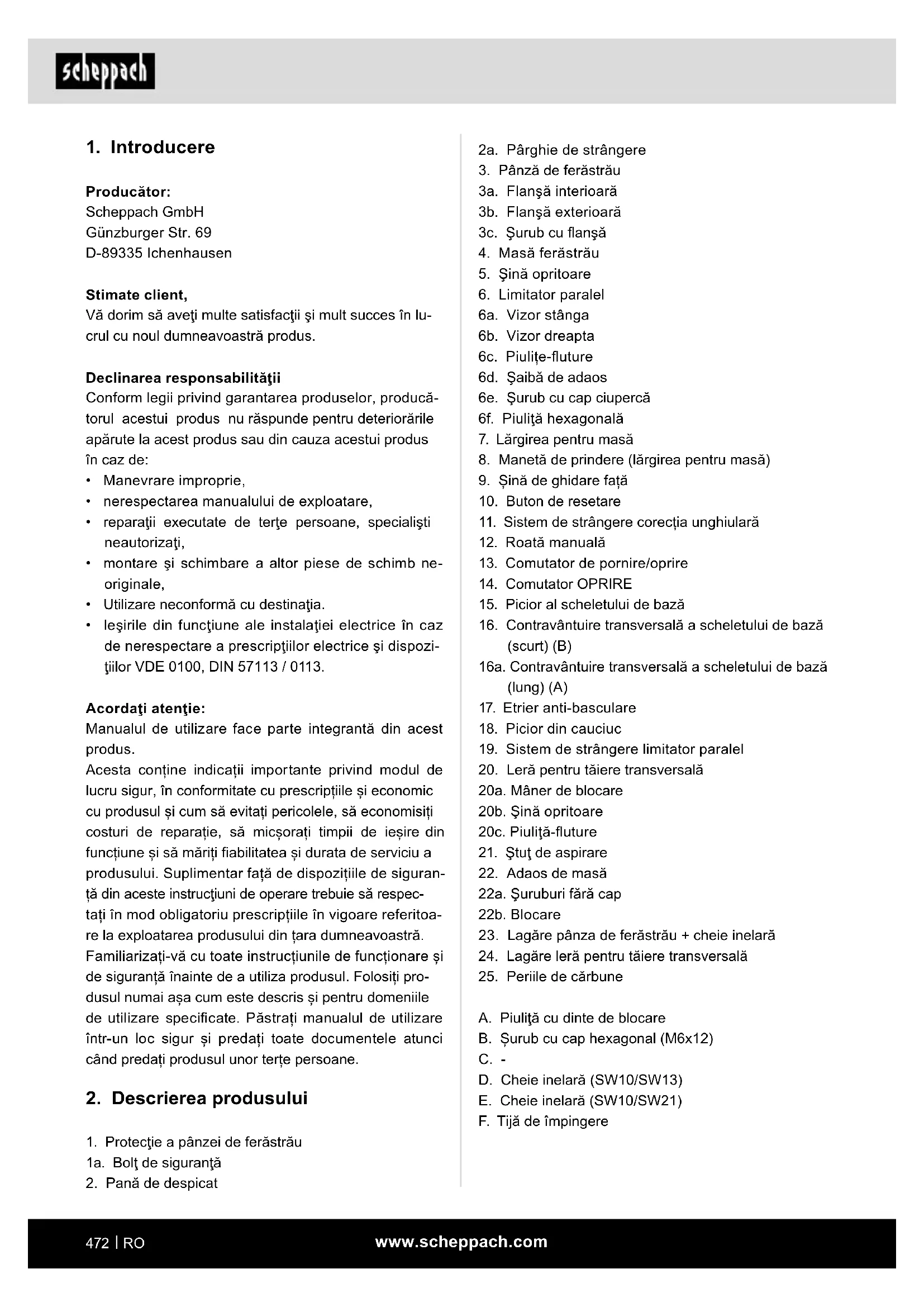 Producător: Scheppach GmbH Günzburger Str. 69 D-89335 Ichenhausen Stimate client, Vă dorim să aveţi multe satisfacţii şi mult succes în lu- crul cu noul dumneavoastră produs. Declinarea responsabilităţii Conform legii privind garantarea produselor, producă- torul acestui produs nu răspunde pentru deteriorările apărute la acest produs sau din cauza acestui produs în caz de: