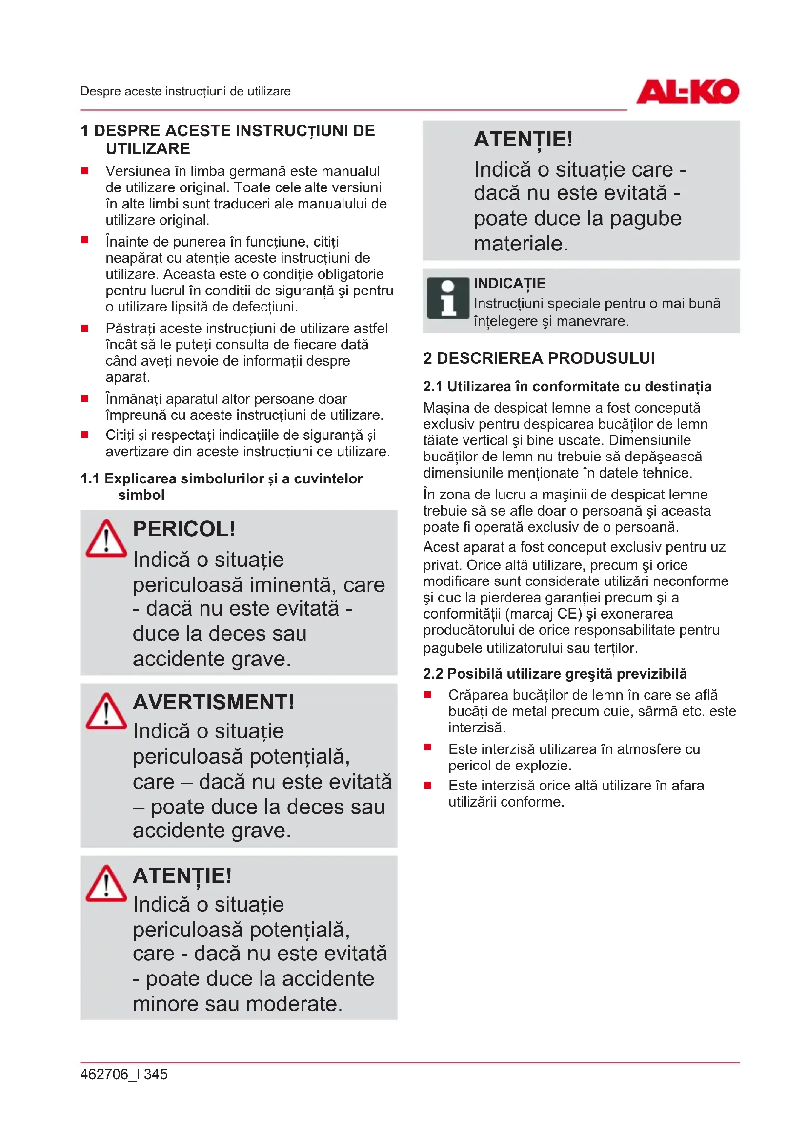 simbol PERICOL! Indică o situație periculoasă iminentă, care - dacă nu este evitată - duce la deces sau accidente grave. AVERTISMENT! Indică o situație periculoasă potențială, care – dacă nu este evitată – poate duce la deces sau accidente grave. ATENŢIE! Indică o situație periculoasă potențială, care - dacă nu este evitată - poate duce la accidente minore sau moderate. ATENŢIE! Indică o situație care - dacă nu este evitată - poate duce la pagube materiale. INDICAŢIE Instrucţiuni speciale pentru o mai bună înţelegere şi manevrare. 2 DESCRIEREA PRODUSULUI