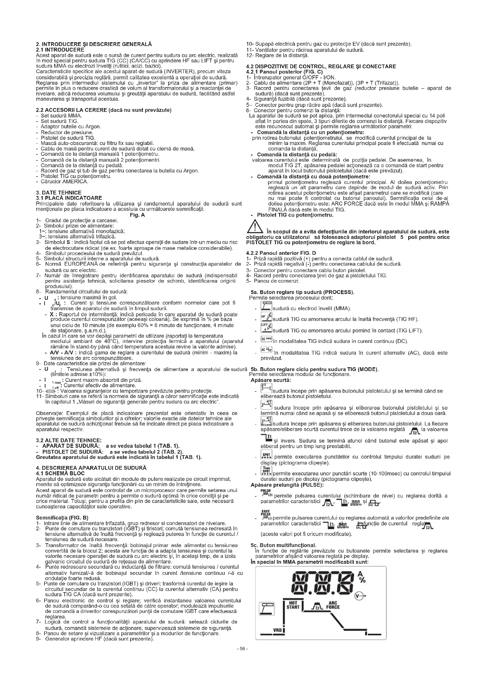 permite pulsarea curentului cu reglarea automată a valorilor predenite ale parametrilor caracteristici , și în funcție de curentul reglat (aceste valori pot oricum modicate). 5c.Butonmultifuncțional. În funcție de reglările prevăzute cu butoanele permite selectarea și reglarea parametrilor așând valoarea reglată pe display. ÎnspecialînMMAparametriimodicabilisunt:- 57 - - activarea/dezactivarea dispozitivului “Voltage Reduction Device” pentru pornirea în condiții de siguranță cu joasă tensiune.
