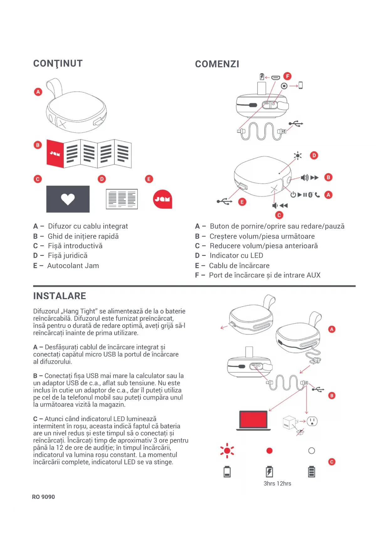EN 89EN 89 “Hang Tight” HX-P303 Manual de instrucţiuniRO 9090 CONŢINUT A – Difuzor cu cablu integrat B – Ghid de iniţiere rapidă C – Fișă introductivă D – Fișă juridică E – Autocolant Jam COMENZI A – Buton de pornire/oprire sau redare/pauză B – Creștere volum/piesa următoare C – Reducere volum/piesa anterioară D – Indicator cu LED E – Cablu de încărcare F – Port de încărcare și de intrare AUX 3hrs 12hrs INSTALARE Difuzorul „Hang Tight” se alimentează de la o baterie reîncărcabilă. Difuzorul este furnizat preîncărcat, însă pentru o durată de redare optimă, aveţi grijă să-l reîncărcaţi înainte de prima utilizare. A – Desfășuraţi cablul de încărcare integrat și conectaţi capătul micro USB la portul de încărcare al difuzorului. B – Conectaţi șa USB mai mare la calculator sau la un adaptor USB de c.a., aat sub tensiune. Nu este inclus în cutie un adaptor de c.a., dar îl puteţi utiliza pe cel de la telefonul mobil sau puteţi cumpăra unul la următoarea vizită la magazin. C – Atunci când indicatorul LED luminează intermitent în roșu, aceasta indică faptul că bateria are un nivel redus și este timpul să o conectaţi și reîncărcaţi. Încărcaţi timp de aproximativ 3 ore pentru până la 12 de ore de audiţie; în timpul încărcării, indicatorul va lumina roșu constant. La momentul încărcării complete, indicatorul LED se va stinge.RO 9191 UTILIZARE