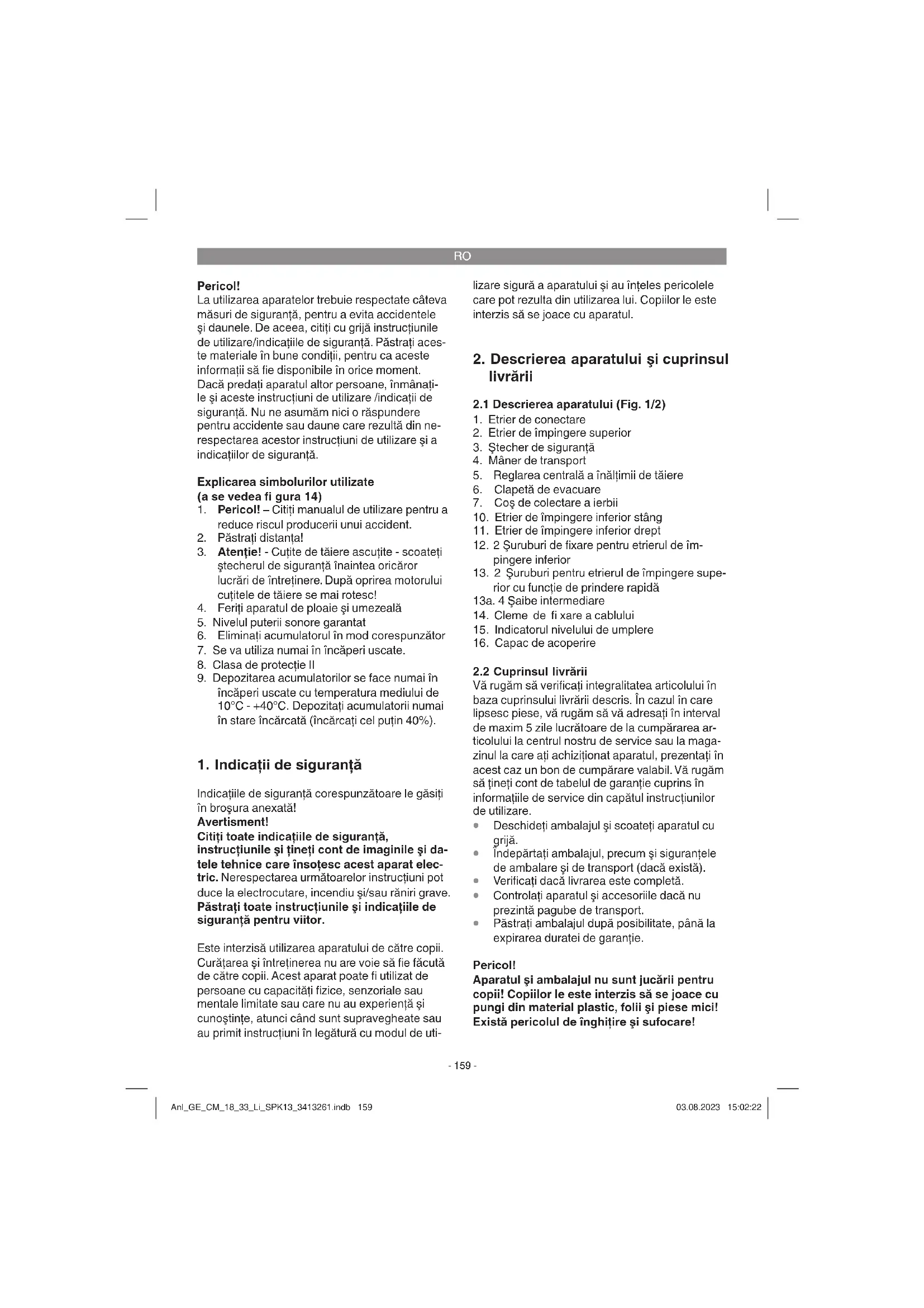 P ăstraţi ambalajul după posibilitate, până la expirarea duratei de garanţie. Pericol! Aparatul şi ambalajul nu sunt jucării pentru copii! Copiilor le este interzis să se joace cu pungi din material plastic, folii şi piese mici! Există pericolul de înghiţire şi sufocare! Anl_GE_CM_18_33_Li_SPK13_3413261.indb 159Anl_GE_CM_18_33_Li_SPK13_3413261.indb 159 03.08.2023 15:02:2203.08.2023 15:02:22RO