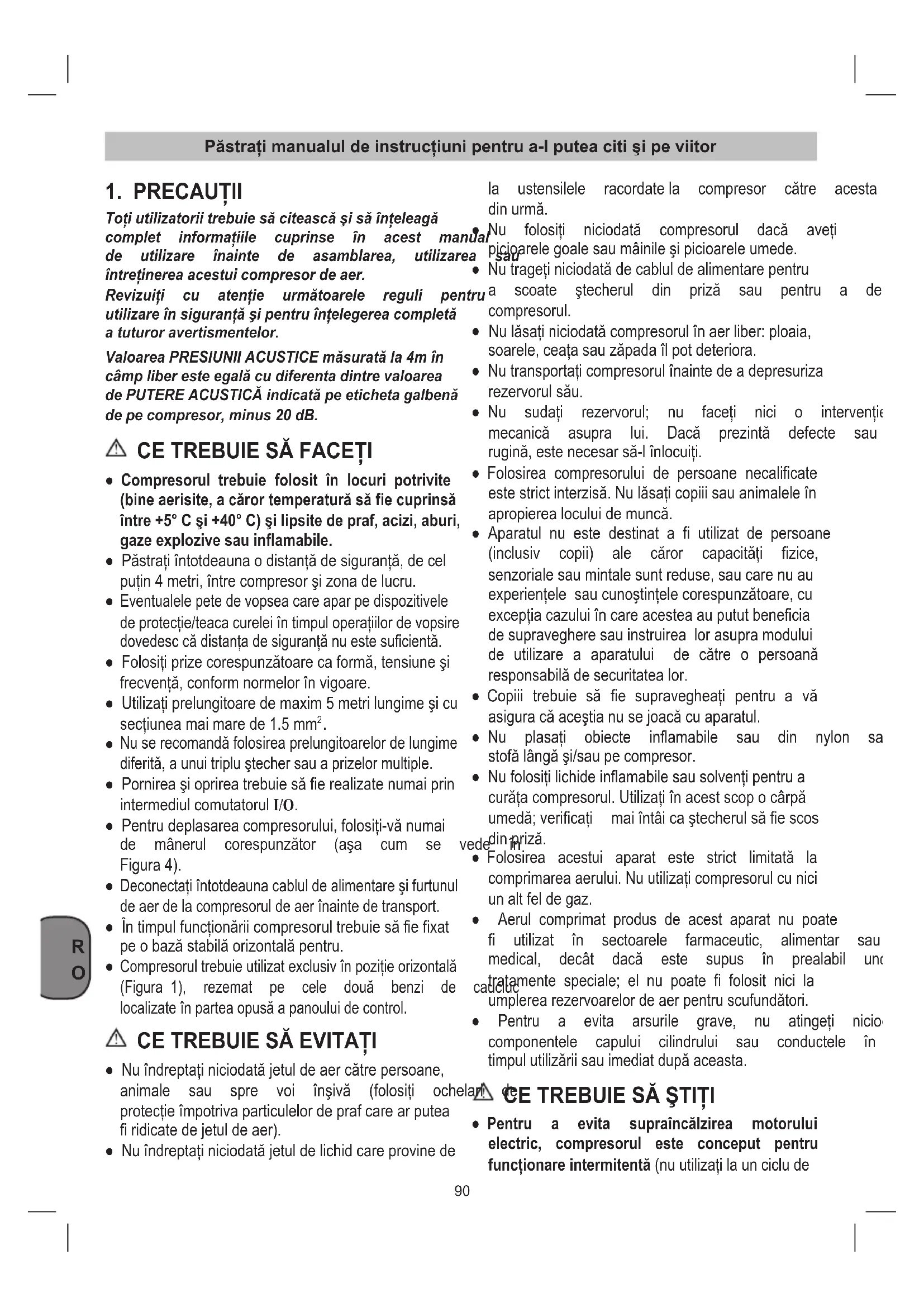 Toţiutilizatoriitrebuiesăciteascăşisăînţeleagă complet informaţiile cuprinse în acest manual de utilizare înainte de asamblarea, utilizarea sau întreţinereaacestuicompresordeaer. Revizuiţi cu atenţie următoarele reguli pentru utilizareînsiguranţăşipentruînţelegereacompletă a tuturor avertismentelor. ValoareaPRESIUNIIACUSTICEmăsuratăla4mîn câmpliberesteegalăcudiferentadintrevaloarea dePUTEREACUSTICĂindicatăpeetichetagalbenă de pe compresor, minus 20 dB.
