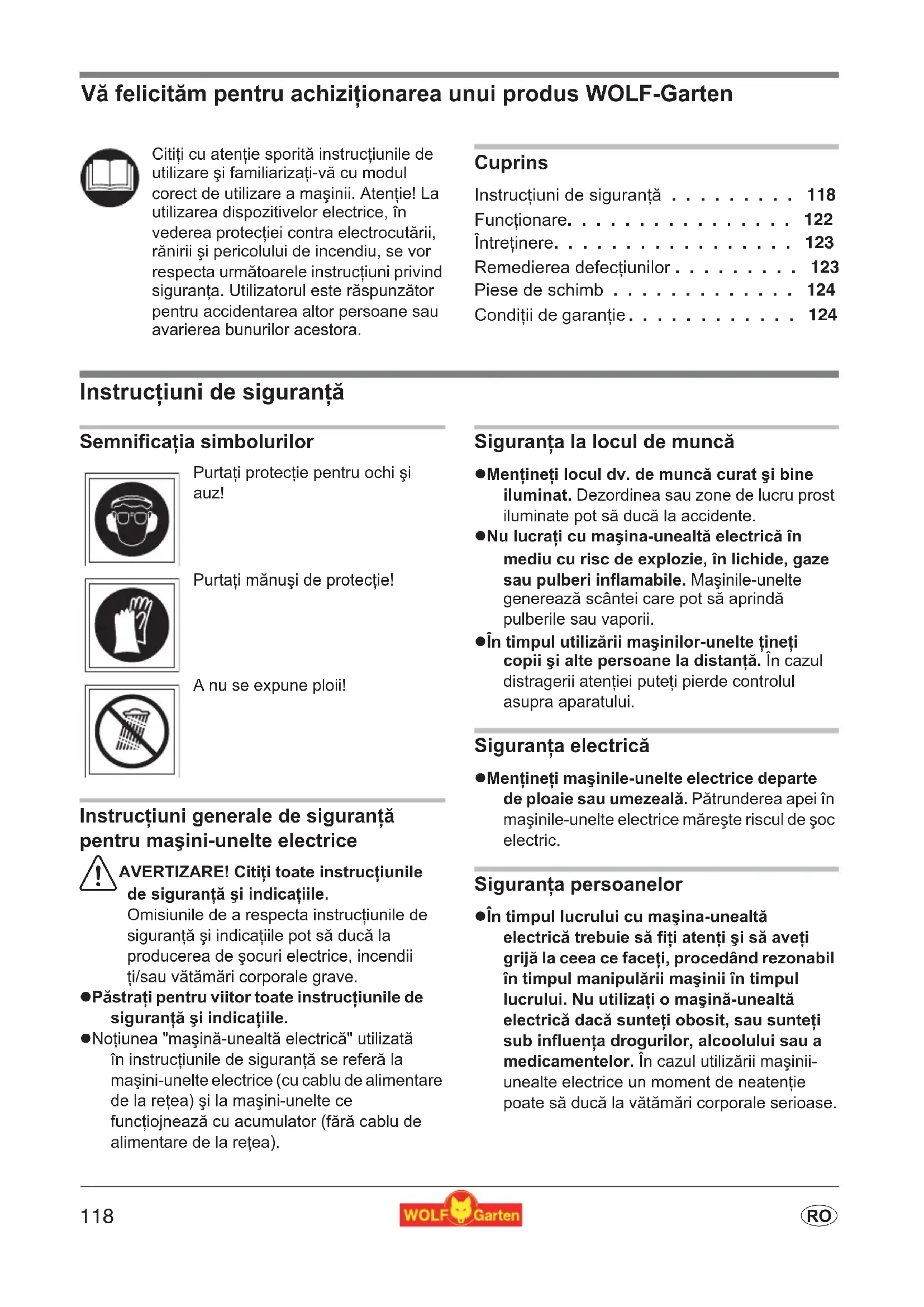 - o V¯ felicit¯m pentru achiziionarea unui produs WOLF-Garten Cuprins Instruc<iuni de siguran<; p. 118
