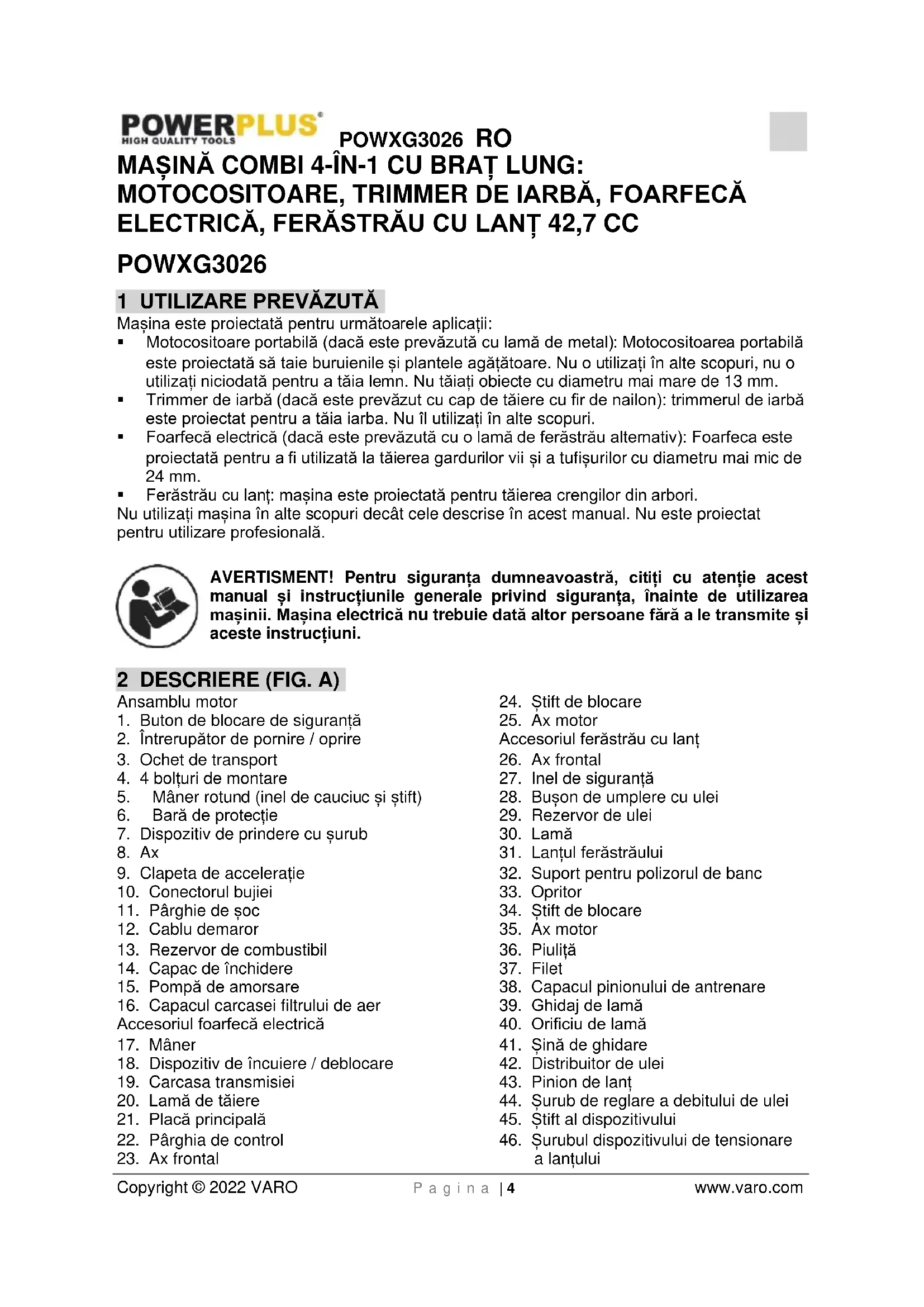 Atenție! Vapori CO otrăvitori! Nu utilizați mașina în spații închise!POWXG3026 RO Copyright © 2022 VARO P a g i n a | 7 www.varo.com