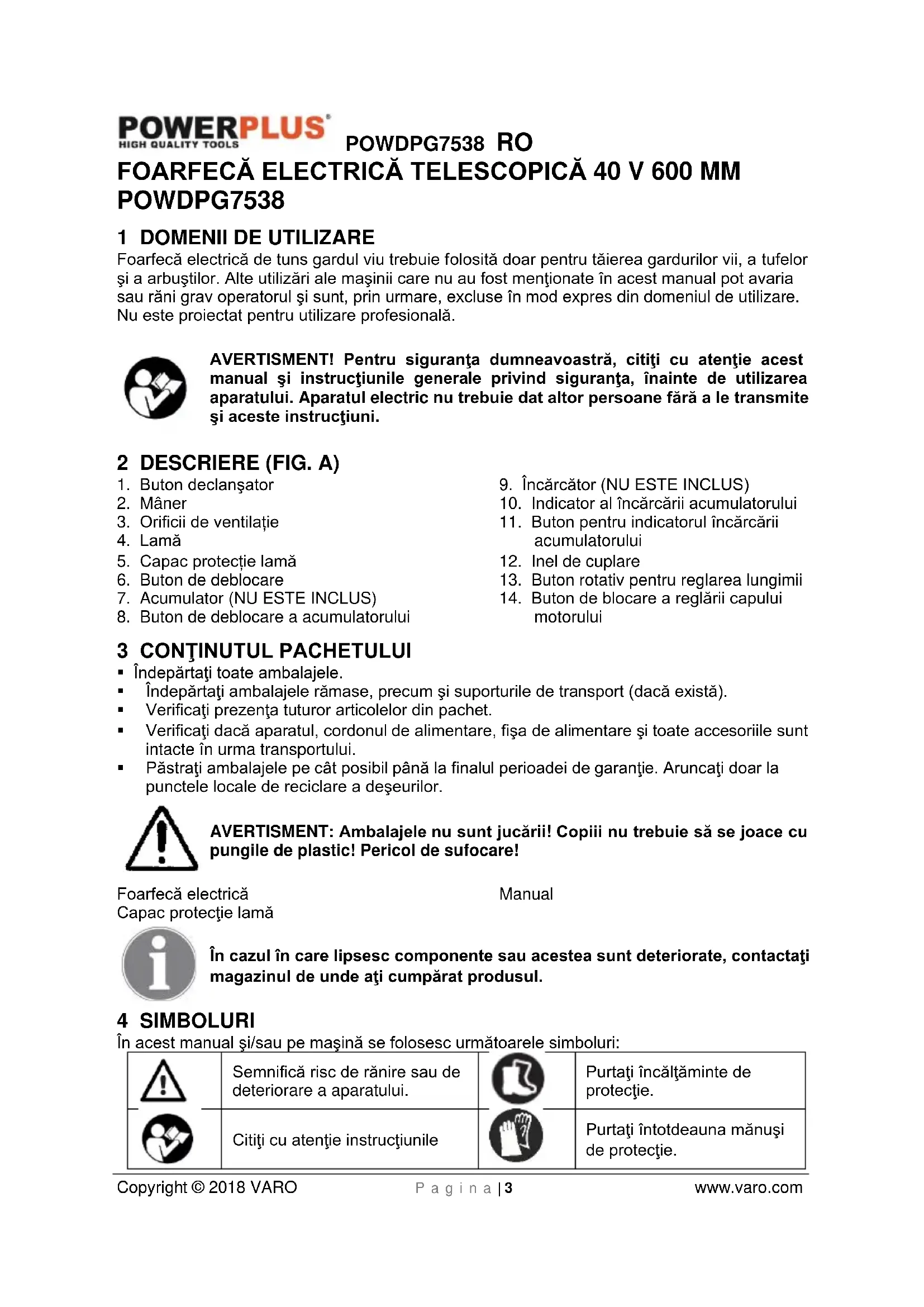 VARO N.V. - Joseph Van Instraat 9 - BE2500 Lier - BELGIA, declară că Produsul: Foarfecă electrică Marcă de comerţ: POWERplus Model: POWDPG7538 este în conformitate cu specificaţiile esenţiale şi alte prevederi relevante ale Directivelor Europene aplicabile, pe baza aplicării standardelor europene armonizate. Orice modificare neautorizată a aparatelor atrage după sine anularea acestei declaraţii. Directivele europene (inclusiv, dacă este cazul, amendamentele lor, până la data semnăturii); 2011/65/EU 2006/42/EC 2014/30/EU 2000/14/EC Annex VI LwA 89dB(A) / 92dB(A) Testing Authority TUV SUD Standardele europene armonizate (inclusiv, dacă este cazul, amendamentele lor, până la data semnăturii); EN60745-1 : 2009 EN ISO 10517: 2009 EN55014-1 : 2017 EN55014-2 : 2015 Persoana care păstrează documentaţia tehnică: Philippe Vankerkhove, VARO – Vic. Van Rompuy N.V. Subsemnatul acţionează în numele Directorului general executiv al societăţii, Eric de Boer Certification Manager 31/01/2018, BelgiumPOWDPG7538 PL Copyright © 2018 VARO P a g e | 1 www.varo.com 1 ZASTOSOWANIE............................................................................. 3