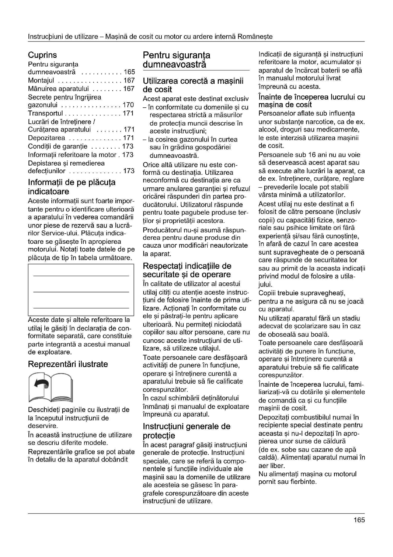 - Informaţii referitoare la motor . 173 Depistarea şi remedierea defecţiunilor Informaţii de pe plăcuţa indicatoare Aceste informaţii sunt foarte impor- tante pentru o identificare ulterioară a aparatului în vederea comandării unor piese de rezervă sau a lucră- rilor Service-ului. Plăcuţa indica- toare se găseşte în apropierea motorului. Notaţi toate datele de pe plăcuţa de tip în tabela următoare. Aceste date şi altele referitoare la utilaj le găsiţi în declaraţia de con- formitate separată, care constituie parte integrantă a acestui manual de exploatare. Reprezentări ilustrate Deschideţi paginile cu ilustraţii de la începutul instrucţiunii de deservire. În această instrucţiune de utilizare se descriu diferite modele. Reprezentările grafice se pot abate în detaliu de la aparatul dobândit Pentru siguranţa dumneavoastră Utilizarea corectă a maşinii de cosit Acest aparat este destinat exclusiv – în conformitate cu domeniile şi cu respectarea strictă a măsurilor de protecţia muncii descrise în aceste instrucţiuni; – la cosirea gazonului în curtea sau în grădina gospodăriei dumneavoastră. Orice altă utilizare nu este con- formă cu destinaţia. Utilizarea neconformă cu destinaţia are ca urmare anularea garanţiei şi refuzul oricărei răspunderi din partea pro- ducătorului. Utilizatorul răspunde pentru toate pagubele produse ter- ţilor şi proprietăţii acestora. Producătorul nu-şi asumă răspun- derea pentru daune produse din cauza unor modificări neautorizate la aparat. Respectaţi indicaţiile de securitate şi de operare În calitate de utilizator al acestui utilaj citiţi cu atenţie aceste instruc- ţiuni de folosire înainte de prima uti- lizare. Acţionaţi în conformitate cu ele şi păstraţi-le pentru aplicare ulterioară. Nu permiteţi niciodată copiilor sau altor persoane, care nu cunosc aceste instrucţiuni de uti- lizare, să utilizeze utilajul. Toate persoanele care desfăşoară activităţi de punere în funcţiune, operare şi întreţinere curentă a aparatului trebuie să fie calificate corespunzător. În cazul schimbării deţinătorului înmânaţi şi manualul de exploatare împreună cu aparatul. Instrucţiuni generale de protecţie În acest paragraf găsiţi instrucţiuni generale de protecţie. Instrucţiuni speciale, care se referă la compo- nentele şi funcţiile individuale ale maşinii sau la domeniile de utilizare ale acesteia se găsesc în para- grafele corespunzătoare din aceste instrucţiuni de utilizare. Indicaţii de siguranţă şi instrucţiuni referitoare la motor, acumulator şi aparatul de încărcat baterii se află în manualul motorului livrat împreună cu acesta. Înainte de începerea lucrului cu maşina de cosit Persoanelor aflate sub influenţa unor substanţe narcotice, ca de ex. alcool, droguri sau medicamente, le este interzisă utilizarea maşinii de cosit. Persoanele sub 16 ani nu au voie să deservească acest aparat sau să execute alte lucrări la aparat, ca de ex. întreţinere, curăţare, reglare – prevederile locale pot stabili vârsta minimă a utilizatorilor. Acest utilaj nu este destinat a fi folosit de către persoane (inclusiv copii) cu capacităţi fizice, senzo- riale sau psihice limitate ori fără experienţă şi/sau fără cunoştinţe, în afară de cazul în care acestea sunt supravegheate de o persoană care răspunde de securitatea lor sau au primit de la aceasta indicaţii privind modul de folosire a utila- jului. Copiii trebuie supravegheaţi, pentru a ne asigura că nu se joacă cu aparatul. Nu utilizaţi aparatul fără un stadiu adecvat de şcolarizare sau în caz de oboseală sau boală. Toate persoanele care desfăşoară activităţi de punere în funcţiune, operare şi întreţinere curentă a aparatului trebuie să fie calificate corespunzător. Înainte de începerea lucrului, fami- liarizaţi-vă cu dotările şi elementele de comandă ca şi cu funcţiile maşinii de cosit. Depozitaţi combustibilul numai în recipiente special destinate pentru aceasta şi nu-l depozitaţi în apro- pierea unor surse de căldură (de ex. sobe sau cazane de apă caldă). Alimentaţi aparatul numai în aer liber. Nu alimentaţi maşina cu motorul pornit sau fierbinte.Româneşte Instrucþiuni de utilizare – Maşinã de cosit cu motor cu ardere internã p. 173