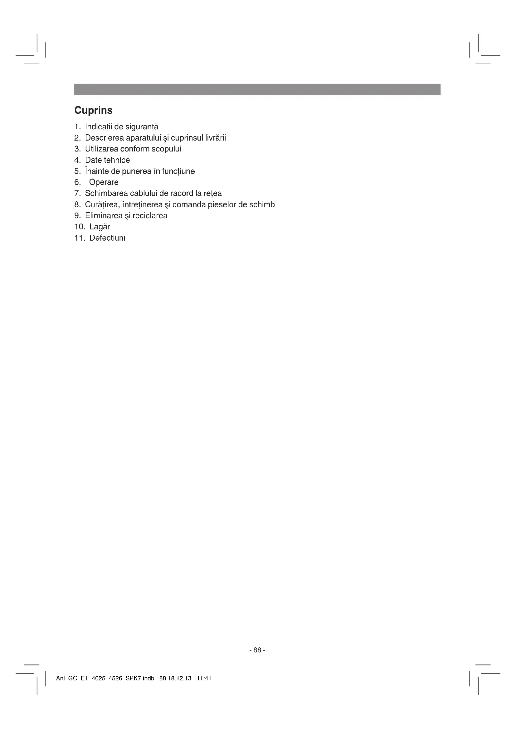 info. Dacă defectul aparatului este cuprins în prestaţiile noastre de garanţie, veţi primi imediat înapoi aparatul reparat sau un aparat nou. Bineînţeles că remediem cu plăcere contra cost şi defecte la aparate care nu sunt sau nu mai sunt cup- rinse în prestaţiile de garanţie. Pentru aceasta trimiteţi va rugăm aparatul la adresa noastră service: La piesele de uzură, de consum şi piesele lipsă vă informăm în mod expres, că trebuie avute în vedere restricţiile garanţiei menţionate în informaţiile de service ale acestor instrucţiuni de utilizare. Anl_GC_ET_4025_4526_SPK7.indb 96 18.12.13 11:41GR