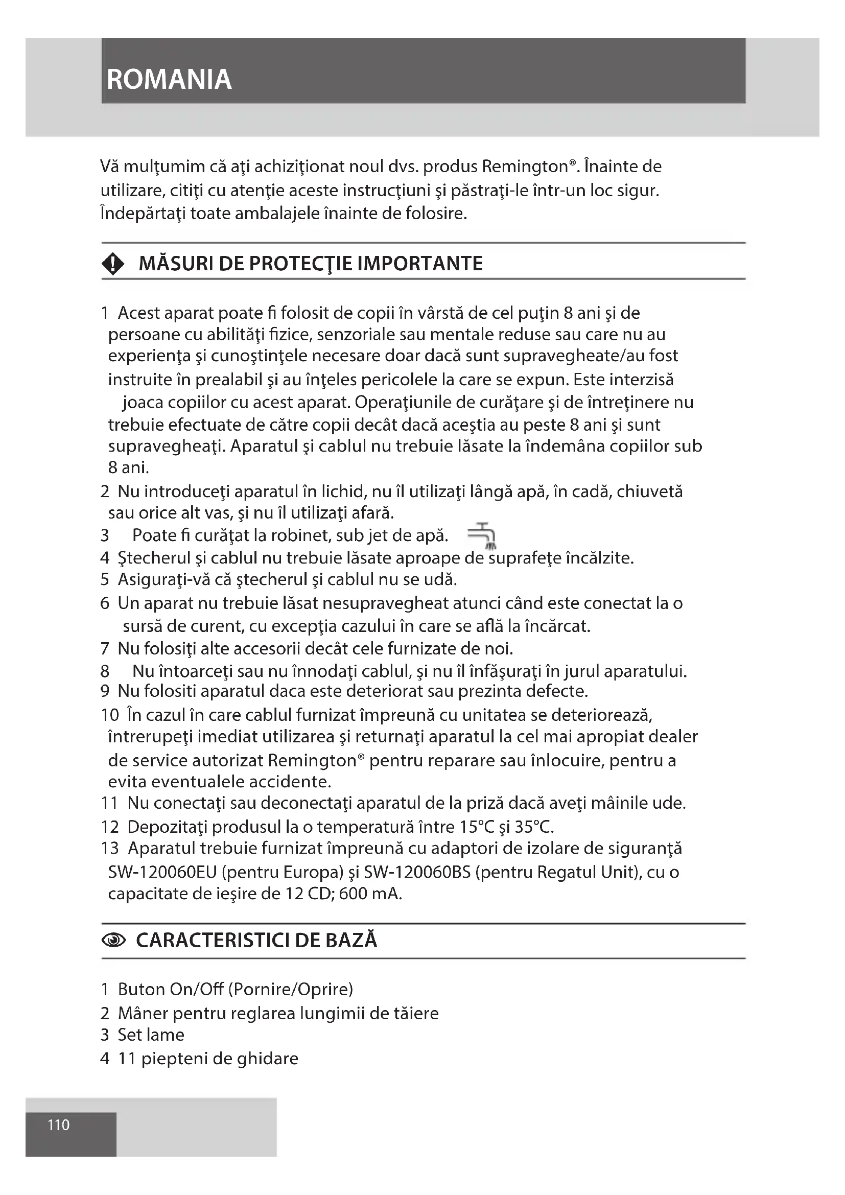Vă multumim că ați achiziționat noul dvs. produs Remington®. Înainte de utilizare, citiți cu atenție aceste instrucțiuni și păstrați-le într-un loc sigur. Îndepărtați toate ambalajele înainte de folosire.
