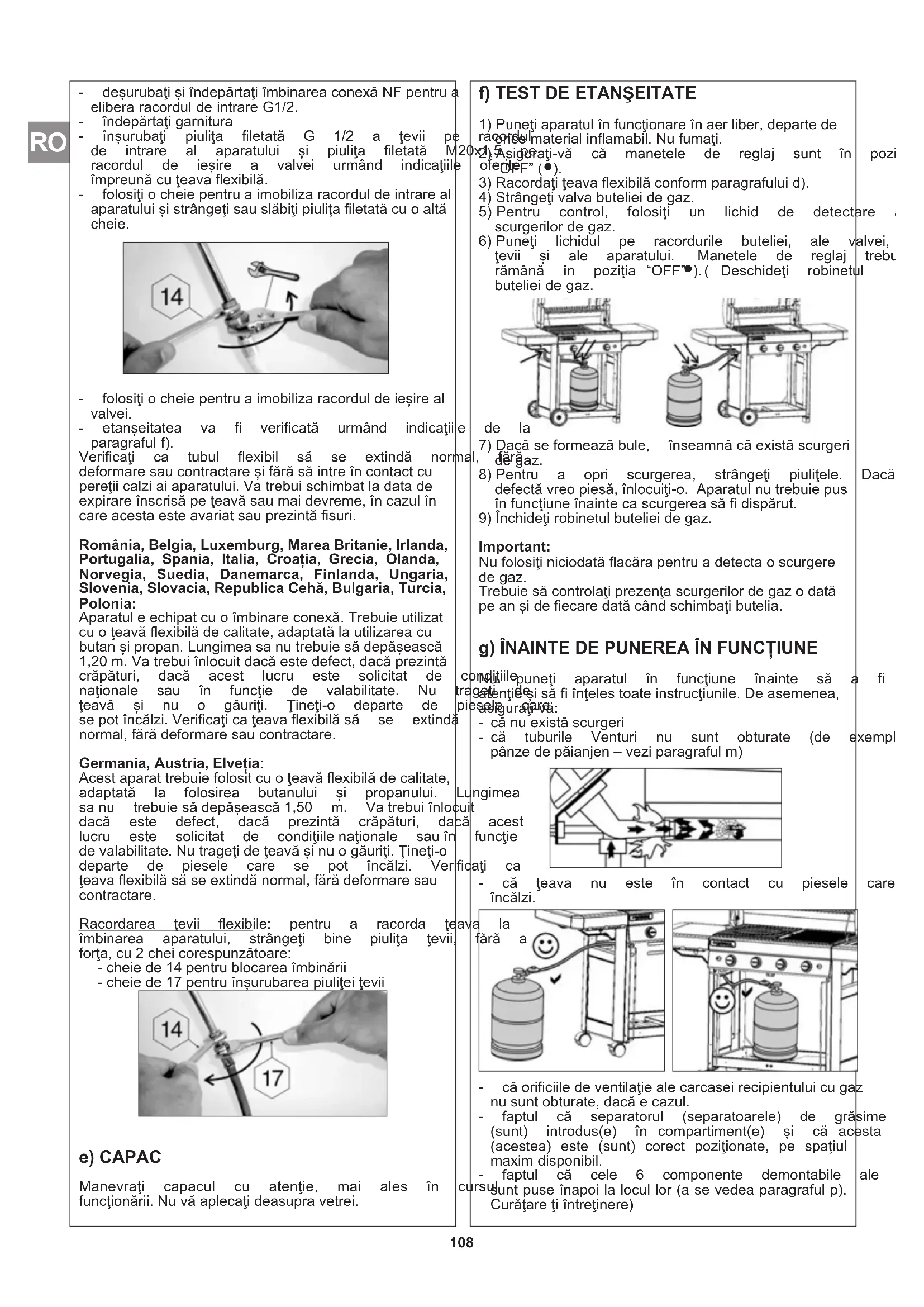 Acestaparattrebuiefolositcuoţeavăflexibilădecalitate, adaptată la folosirea butanului și propanului. Lungimea sanu trebuiesădepășească1,50 m. Vatrebuiînlocuit dacă este defect, dacă prezintă crăpături, dacă acest lucru este solicitat de condiţiilenaţionale sauîn funcţie devalabilitate.Nutrageţideţeavășinuogăuriţi.Ţineţi-o departe de piesele care se pot încălzi. Verificaţi ca ţeavaflexibilăsăseextindănormal,fărădeformaresau contractare. Racordarea ţevii flexibile: pentru a racorda ţeava la îmbinarea aparatului, strângeţi bine piuliţa ţevii, fără a forţa,cu2cheicorespunzătoare: -cheiede14pentrublocareaîmbinării -cheiede17pentruînșurubareapiuliţeiţevii e) CAPAC Manevraţi capacul cu atenţie, mai ales în cursul funcţionării.Nuvăaplecaţideasupravetrei. f) TEST DE ETANEITATE 1)Puneţiaparatulînfuncţionareînaerliber,departede oricematerialinflamabil.Nufumaţi. 2)Asiguraţi-vă că manetele de reglaj sunt în poziţia “OFF” (