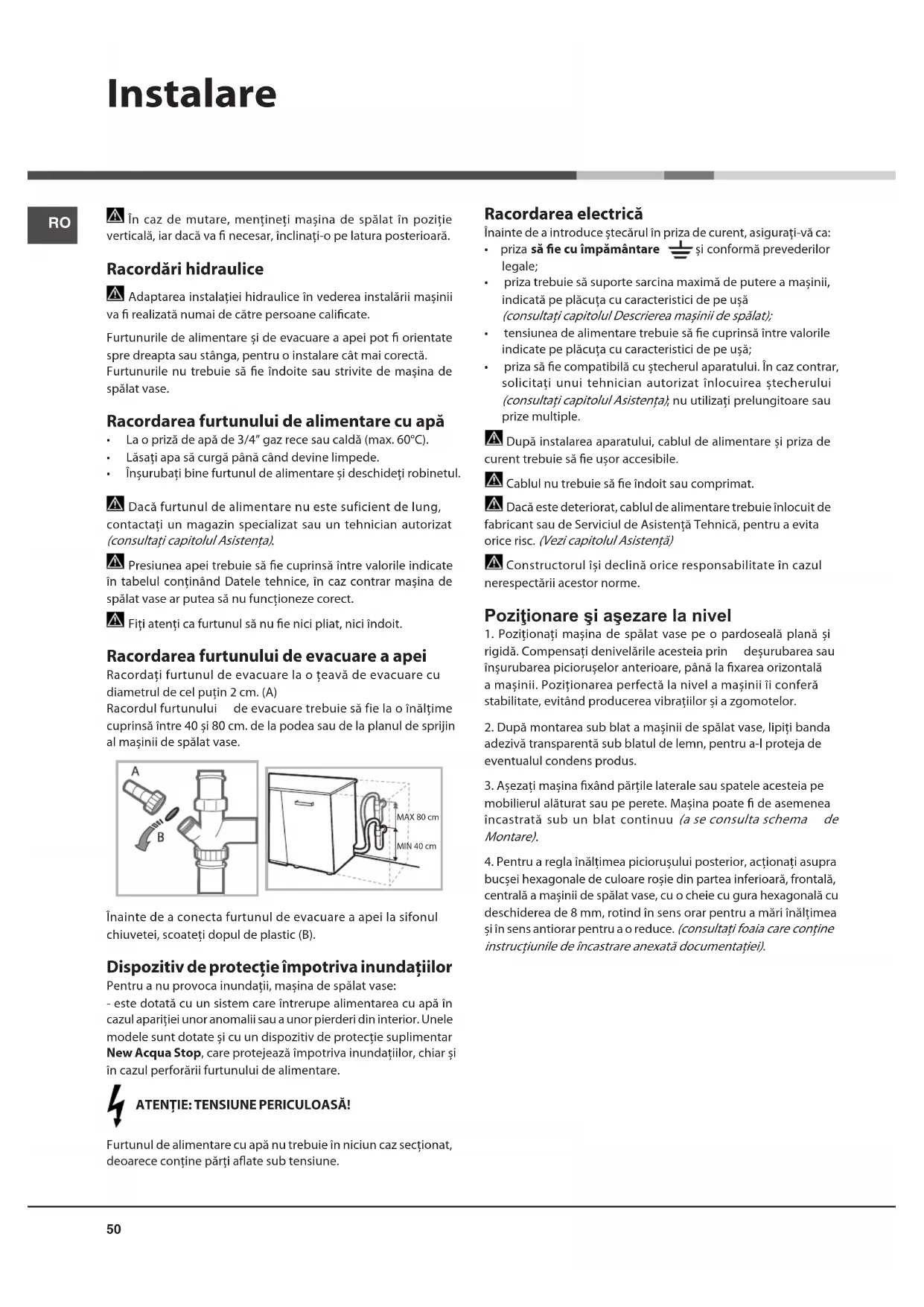 Presiunea apei trebuie să e cuprinsă între valorile indicate în tabelul conţinând Datele tehnice, în caz contrar maşina de spălatvasearputeasănufuncţionezecorect.Fiţiatenţicafurtunulsănuenicipliat,niciîndoit. Racordarea furtunului de evacuare a apei Racordaţifurtunuldeevacuarelaoţeavădeevacuarecudiametruldecelpuţin2cm.(A)Racordulfurtunului deevacuaretrebuiesăfielaoînălţimecuprinsăîntre40şi80cm.delapodeasaudelaplanuldesprijinal maşinii de spălat vase.Înaintedeaconectafurtunuldeevacuareaapeilasifonulchiuvetei,scoateţidopuldeplastic(B). Dispozitiv de protecţie împotriva inundaţiilor Pentru a nu provoca inundaţii, maşina de spălat vase:- este dotată cu un sistem care întrerupe alimentarea cu apă în cazul apariţiei unor anomalii sau a unor pierderi din interior. Unele modele sunt dotate şi cu un dispozitiv de protecţie suplimentar New Acqua Stop,careprotejeazăîmpotrivainundaţiilor,chiarşiîncazulperforăriifurtunuluidealimentare. ATENŢIE: TENSIUNE PERICULOASĂ! Furtunul de alimentare cu apă nu trebuie în niciun caz secţionat, deoarece conţine părţi aate sub tensiune. Racordarea electrică Înainte de a introduce ştecărul în priza de curent, asiguraţi-vă ca: