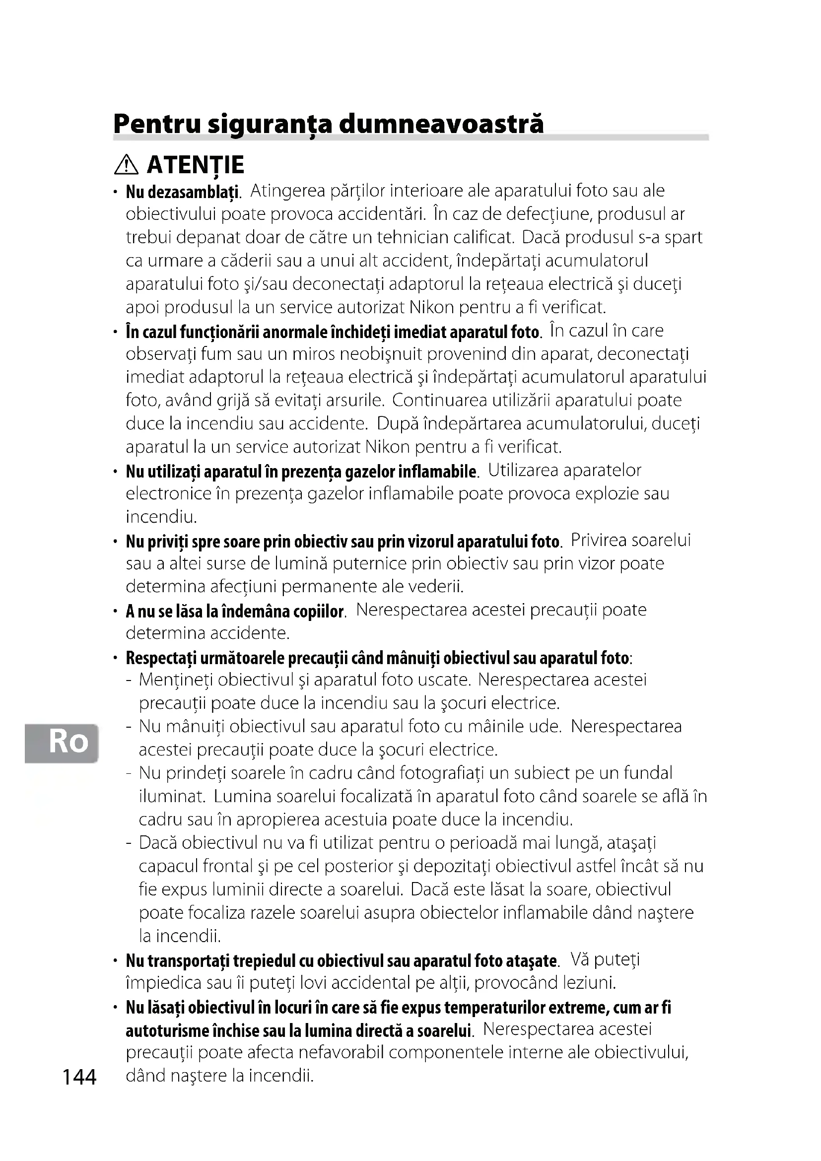 Pentru siguranţa dumneavoastră ATENŢIE Nu dezasamblaţi. Atingerea părţilor interioare ale aparatului foto sau ale obiectivului poate provoca accidentări. În caz de defecţiune, produsul ar trebui depanat doar de către un tehnician calificat. Dacă produsul s-a spart ca urmare a căderii sau a unui alt accident, îndepărtaţi acumulatorul aparatului foto şi/sau deconectaţi adaptorul la reţeaua electrică şi duceţi apoi produsul la un service autorizat Nikon pentru a fi verificat. În cazul funcţionării anormale închideţi imediat aparatul foto. În cazul în care observaţi fum sau un miros neobişnuit provenind din aparat, deconectaţi imediat adaptorul la reţeaua electrică şi îndepărtaţi acumulatorul aparatului foto, având grijă să evitaţi arsurile. Continuarea utilizării aparatului poate duce la incendiu sau accidente. După îndepărtarea acumulatorului, duceţi aparatul la un service autorizat Nikon pentru a fi verificat. Nu utilizaţi aparatul în prezenţa gazelor inflamabile. Utilizarea aparatelor electronice în prezenţa gazelor inflamabile poate provoca explozie sau incendiu. Nu priviţi spre soare prin obiectiv sau prin vizorul aparatului foto. Privirea soarelui sau a altei surse de lumină puternice prin obiectiv sau prin vizor poate determina afecţiuni permanente ale vederii. A nu se lăsa la îndemâna copiilor. Nerespectarea acestei precauţii poate determina accidente. Respectaţi următoarele precauţii când mânuiţi obiectivul sau aparatul foto: Menţineţi obiectivul şi aparatul foto uscate. Nerespectarea acestei precauţii poate duce la incendiu sau la şocuri electrice. Nu mânuiţi obiectivul sau aparatul foto cu mâinile ude. Nerespectarea acestei precauţii poate duce la şocuri electrice. Nu prindeţi soarele în cadru când fotografiaţi un subiect pe un fundal iluminat. Lumina soarelui focalizată în aparatul foto când soarele se află în cadru sau în apropierea acestuia poate duce la incendiu. Dacă obiectivul nu va fi utilizat pentru o perioadă mai lungă, ataşaţi capacul frontal şi pe cel posterior şi depozitaţi obiectivul astfel încât să nu fie expus luminii directe a soarelui. Dacă este lăsat la soare, obiectivul poate focaliza razele soarelui asupra obiectelor inflamabile dând naştere la incendii. Nu transportaţi trepiedul cu obiectivul sau aparatul foto ataşate. Vă puteţi împiedica sau îi puteţi lovi accidental pe alţii, provocând leziuni. Nu lăsaţi obiectivul în locuri în care să fie expus temperaturilor extreme, cum ar fi autoturisme închise sau la lumina directă a soarelui. Nerespectarea acestei precauţii poate afecta nefavorabil componentele interne ale obiectivului, dând naştere la incendii.