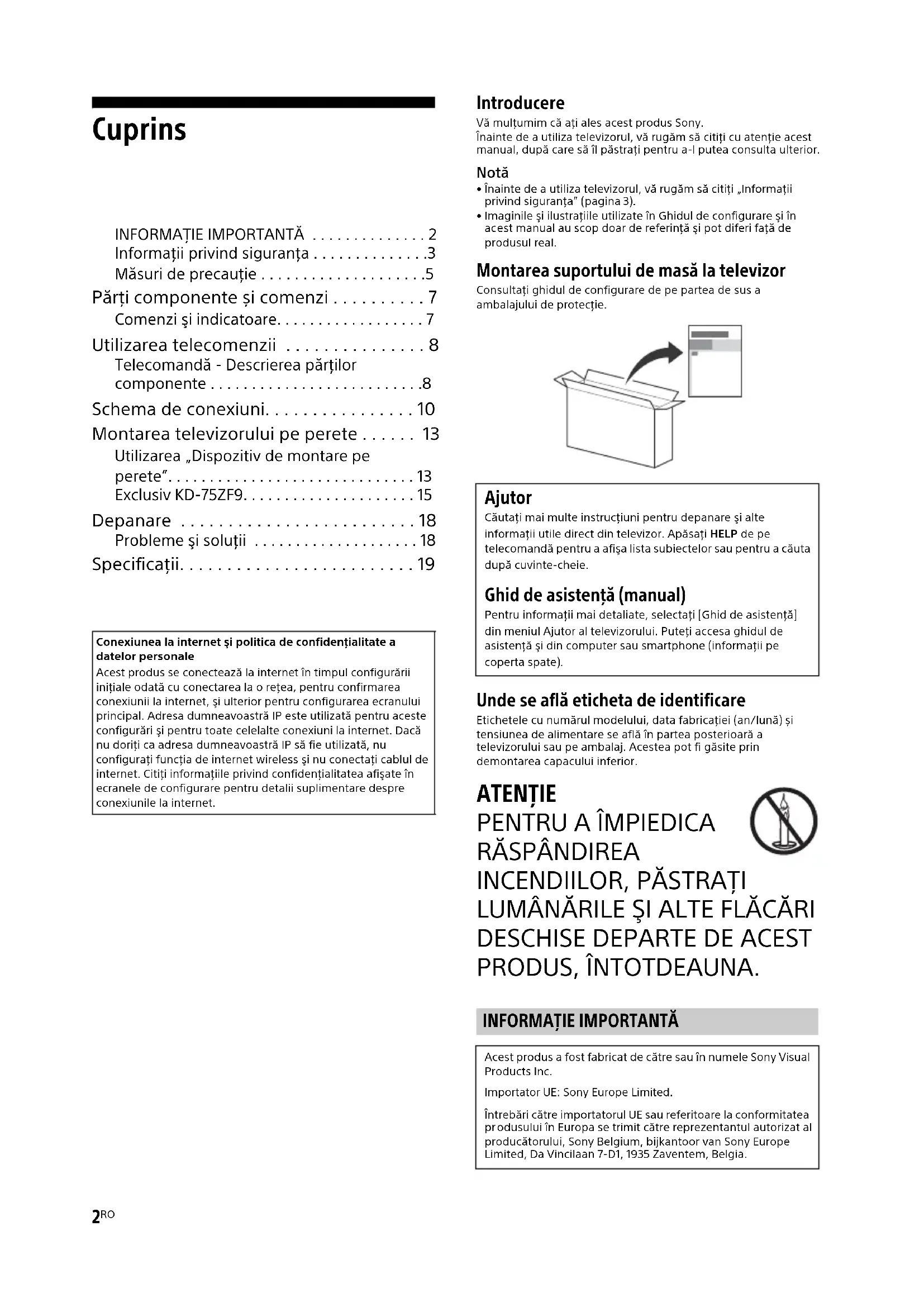 - Specificaţii Introducere Vă mulțumim că ați ales acest produs Sony.Înainte de a utiliza televizorul, vă rugăm să citiți cu atenție acest nual, după care să îl păstrați pentru a-l putea consulta ulterior. Notă p. 19