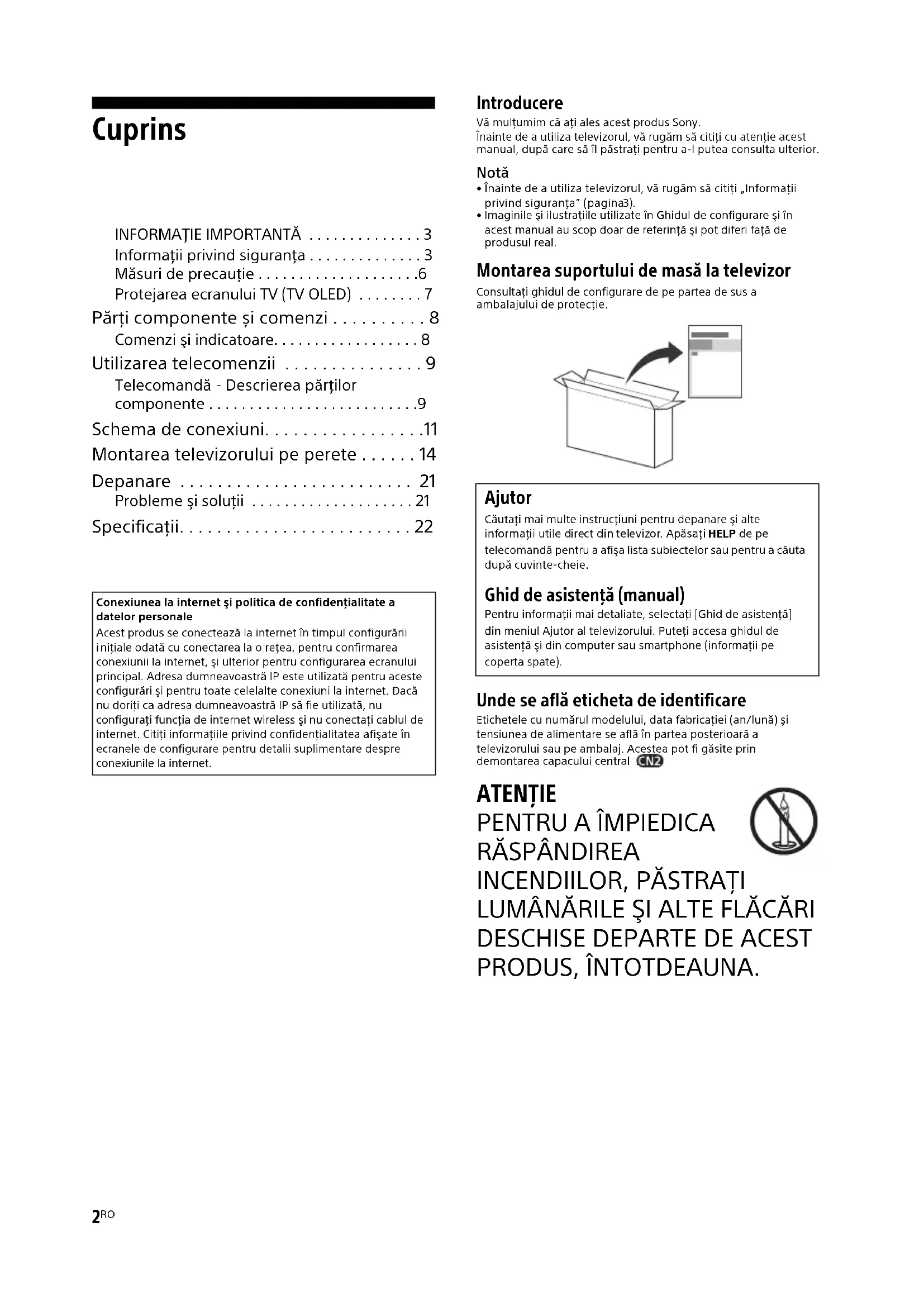- Specificaţii Introducere Vă mulțumim că ați ales acest produs Sony.Înainte de a utiliza televizorul, vă rugăm să citiți cu atenție acest manual, după care să îl păstrați pentru a-l putea consulta ulterior. Notă p. 22