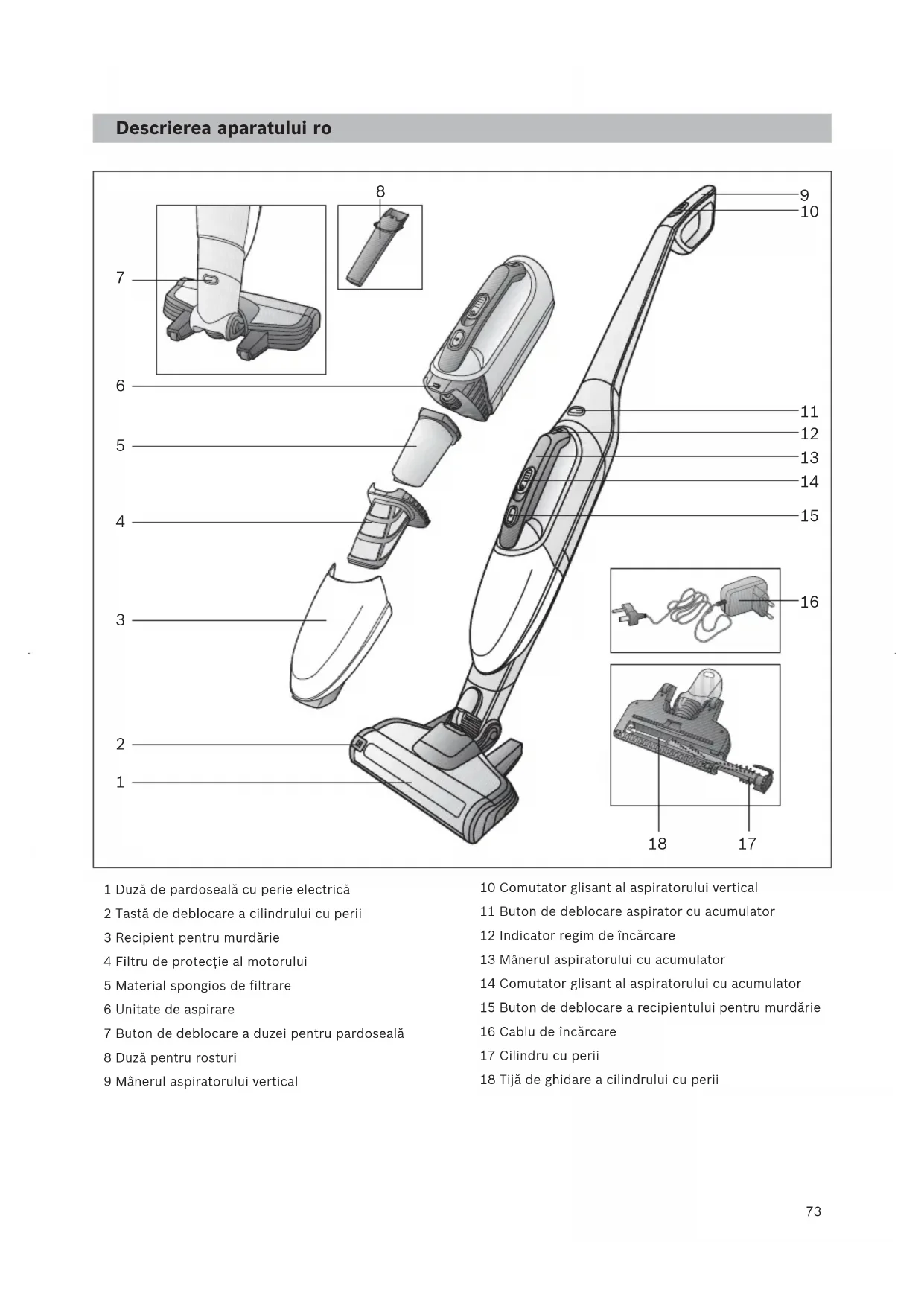 ru73 Descrierea aparatului ro 1 Duză de pardoseală cu perie electrică 2 Tastă de deblocare a cilindrului cu perii 3 Recipient pentru murdărie 4 Filtru de protecţie al motorului 5 Material spongios de filtrare 6 Unitate de aspirare 7 Buton de deblocare a duzei pentru pardoseală 8 Duză pentru rosturi 9 Mânerul aspiratorului vertical 10 Comutator glisant al aspiratorului vertical 11 Buton de deblocare aspirator cu acumulator 12 Indicator regim de încărcare 13 Mânerul aspiratorului cu acumulator 14 Comutator glisant al aspiratorului cu acumulator 15 Buton de deblocare a recipientului pentru murdărie 16 Cablu de încărcare 17 Cilindru cu perii 18 Tijă de ghidare a cilindrului cu perii