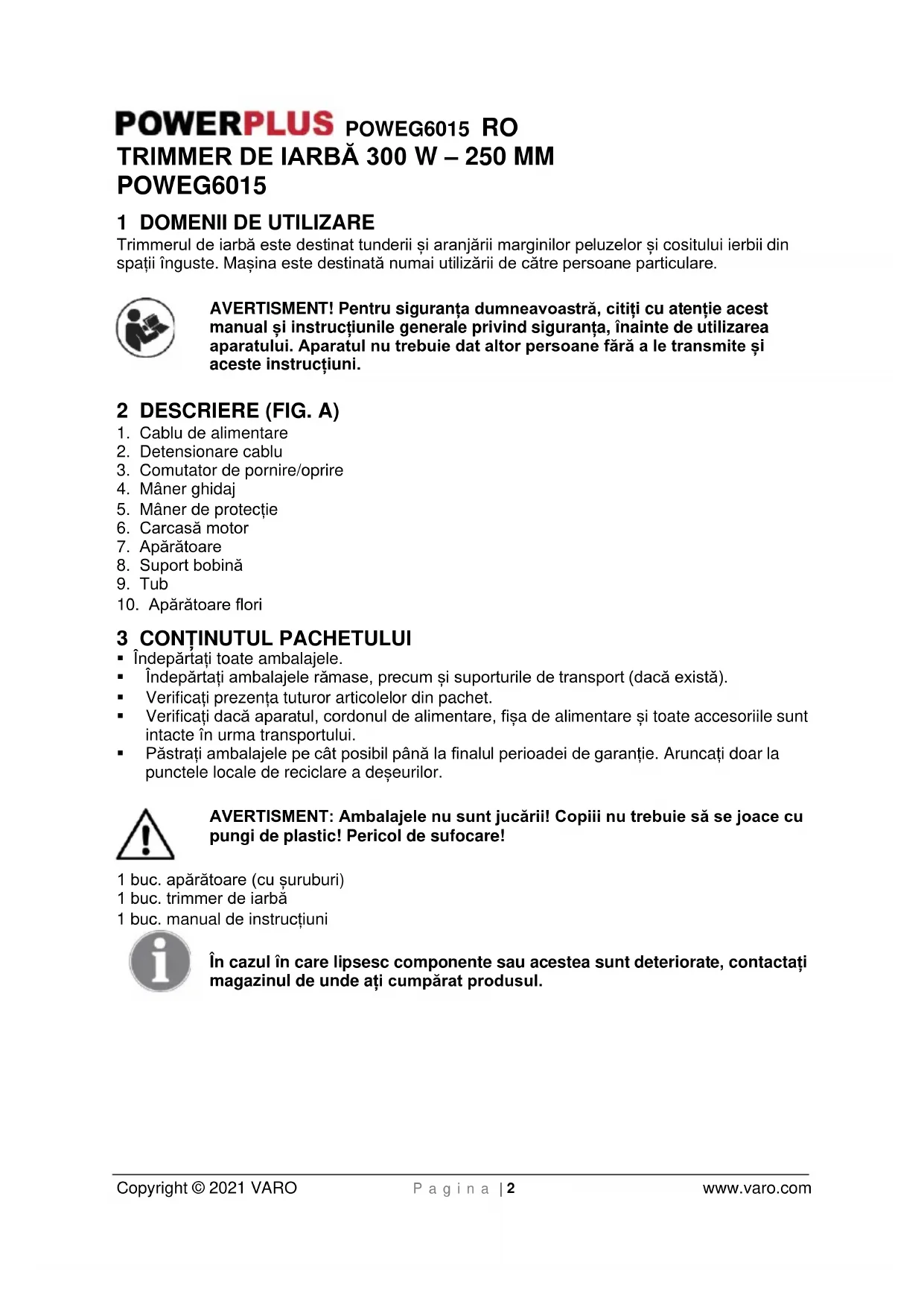 - Opriți aparatul și așteptați oprirea completă a firului de tăiere înainte de a pune jos aparatul. Nu încercați să opriți firul de tăiere. Atenție! După oprirea aparatului, acesta își continuă un anumit timp mișcarea de rotație.POWEG6015 RO Copyright © 2021 VARO P a g i n a | 6 www.varo.com