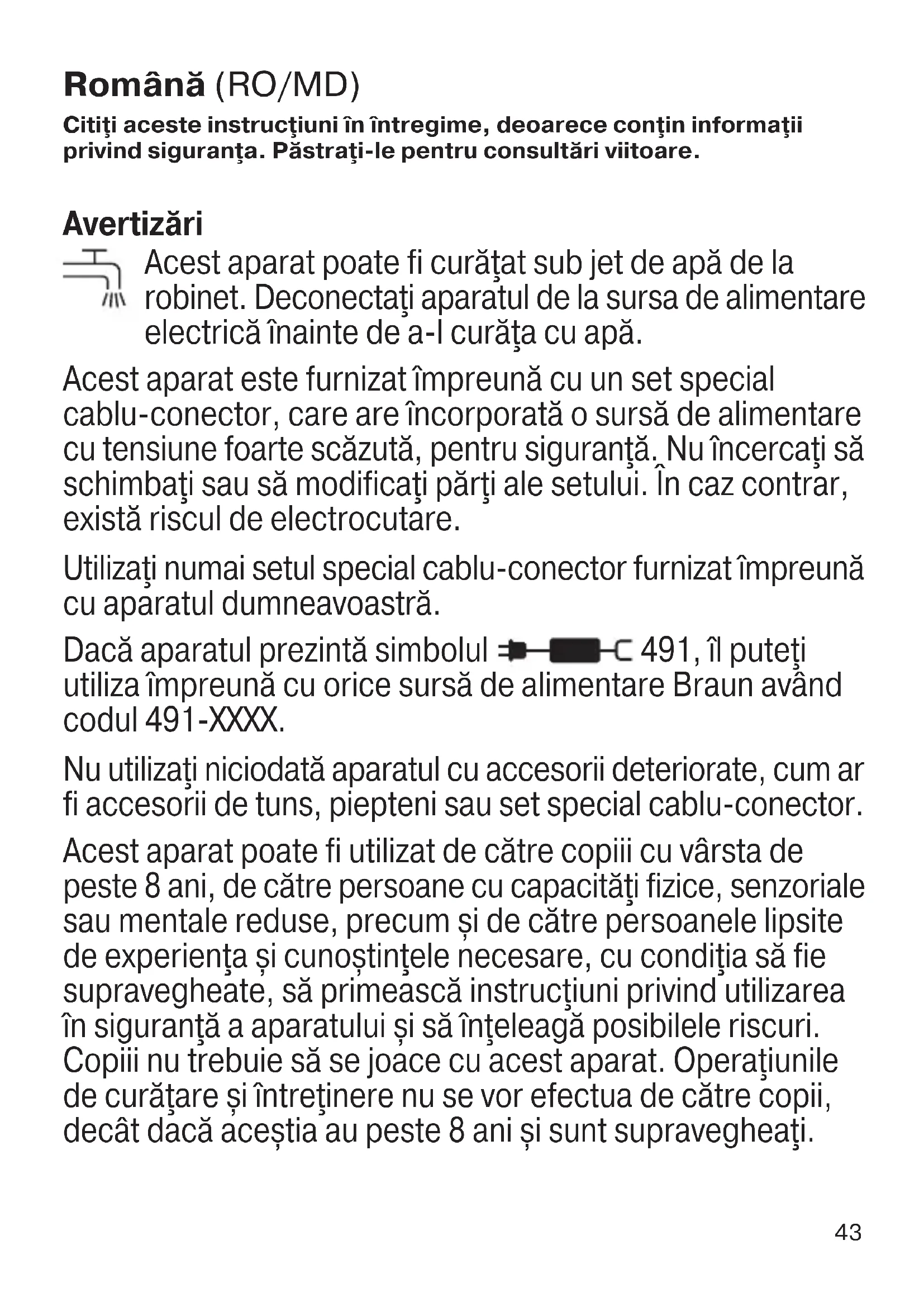 Unvan: Adres: Tel, Faks: e-posta: Kaşe ve İmza: Fatura Tarihi ve Sayısı: Teslim Yeri ve Tarihi: Procter & Gamble Satış ve Dağıtım Ltd. Şti. Nida Kule – Kuzey, Barbaros Mahallesi Begonya Sokak No:3 34746 Ataşehir, İstanbul tarafından ithal edilmiştir. P&G Tüketici İlişkileri: 08502200911 www.pg.com.tr Braun Servis İstasyonları listemize internet sitemizden veya Tüketici Hizmetleri merkezimizi arayarak ulaşabilirsiniz. www.braun.com/tr 91390847_MGK_3040-3045-3060_CEEMEA.indd 4291390847_MGK_3040-3045-3060_CEEMEA.indd 42 20.03.17 11:1320.03.17 11:13 CSS APPROVED Effective Date 24Mar2017 GMT - Printed 05Apr2017 Page 42 of 6843 Română (RO/MD) Citiţi aceste instrucţiuni în întregime, deoarece conţin informaţii privind siguranţa. Păstraţi-le pentru consultări viitoare. Avertizări Acest aparat poate fi curăţat sub jet de apă de la robinet. Deconectaţi aparatul de la sursa de alimentare electrică înainte de a-l curăţa cu apă. Acest aparat este furnizat împreună cu un set special cablu-conector, care are încorporată o sursă de alimentare cu tensiune foarte scăzută, pentru siguranţă. Nu încercaţi să schimbaţi sau să modificaţi părţi ale setului. În caz contrar, există riscul de electrocutare. Utilizaţi numai setul special cablu-conector furnizat împreună cu aparatul dumneavoastră. Dacă aparatul prezintă simbolul 491, îl puteţi utiliza împreună cu orice sursă de alimentare Braun având codul 491-XXXX. Nu utilizaţi niciodată aparatul cu accesorii deteriorate, cum ar fi accesorii de tuns, piepteni sau set special cablu-conector. Acest aparat poate fi utilizat de către copiii cu vârsta de peste 8 ani, de către persoane cu capacităţi fizice, senzoriale sau mentale reduse, precum și de către persoanele lipsite de experienţa și cunoștinţele necesare, cu condiţia să fie supravegheate, să primească instrucţiuni privind utilizarea în siguranţă a aparatului și să înţeleagă posibilele riscuri. Copiii nu trebuie să se joace cu acest aparat. Operaţiunile de curăţare și întreţinere nu se vor efectua de către copii, decât dacă aceștia au peste 8 ani și sunt supravegheaţi. 91390847_MGK_3040-3045-3060_CEEMEA.indd 4391390847_MGK_3040-3045-3060_CEEMEA.indd 43 20.03.17 11:1320.03.17 11:13 CSS APPROVED Effective Date 24Mar2017 GMT - Printed 05Apr2017 Page 43 of 6844 Descriere 1a Pieptene barbă ajustabil (3–11 mm, în pași de 2 mm) 1b Pieptene păr ajustabil (13–21 mm, în pași de 2 mm) 1c Pieptene ajustabil cu buton de eliberare 1d Pieptene fix 1 (1 mm) 1e Pieptene fix 2 (2 mm) 2a Cap aparat tuns 2b Cap aparat tuns pentru urechi și nas (exclusiv pentru modelul MGK3060) 2c Cap aparat tuns pentru detalii 3 Buton de pornire/oprire 4 Indicator de încărcare 5 Conector de alimentare 6 Set special cablu-conector (modelul poate diferi) Pentru specificaţiile electrice, consultaţi informaţiile imprimate pe setul special cablu-conector. Încărcare Temperatura ambientală recomandată pentru încărcare este cuprinsă între 5 °C și 35 °C. În condiţii de temperatură foarte scăzută sau foarte ridicată, este posibil ca bateria să nu se încarce corespunzător sau chiar să nu se încarce deloc. Temperatura ambientală recomandată pentru tuns este cuprinsă între 15 °C și 35 °C. Nu expuneţi aparatul la temperaturi mai mari de 50 °C pentru perioade lungi de timp.