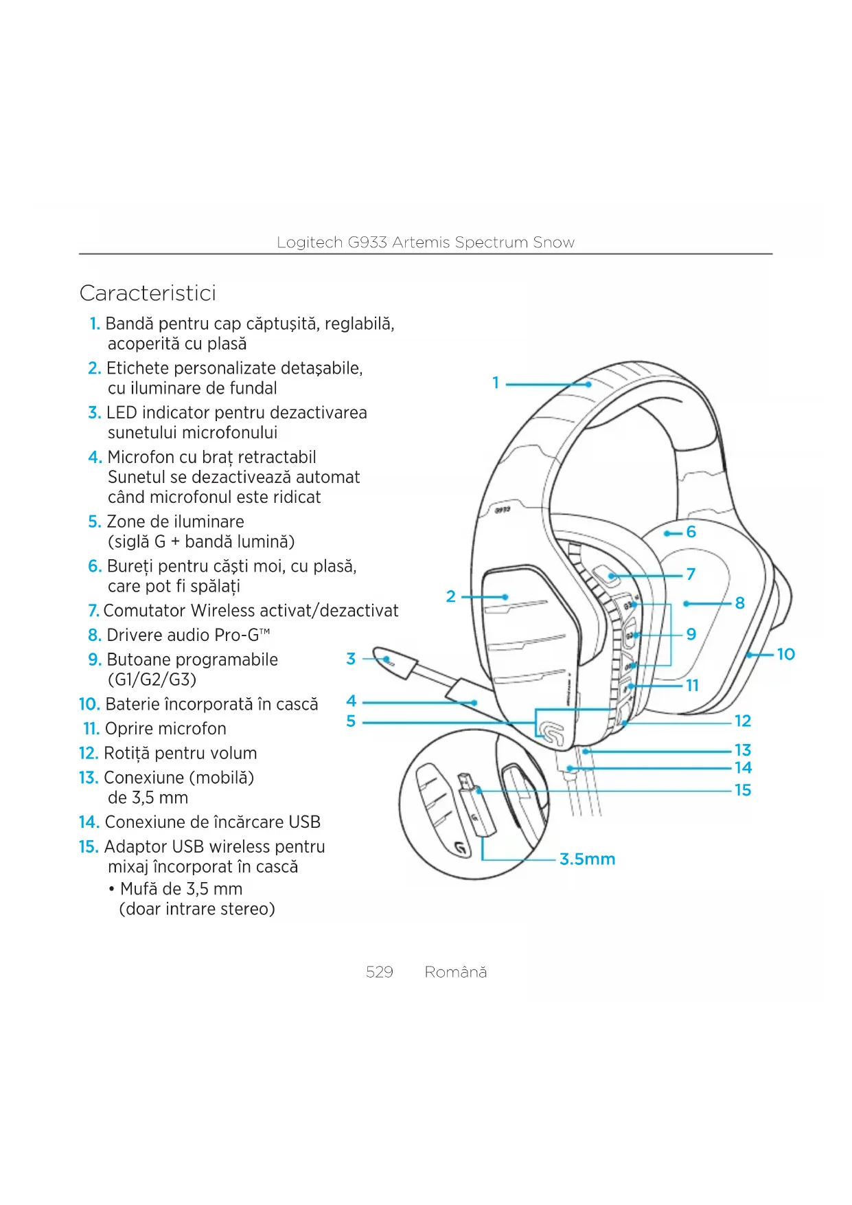 - Mufă de 3,5 mm (doar intrare stereo)Logitech G933 Artemis Spectrum Snow 530 Română Dispunerea butoanelor căştilor