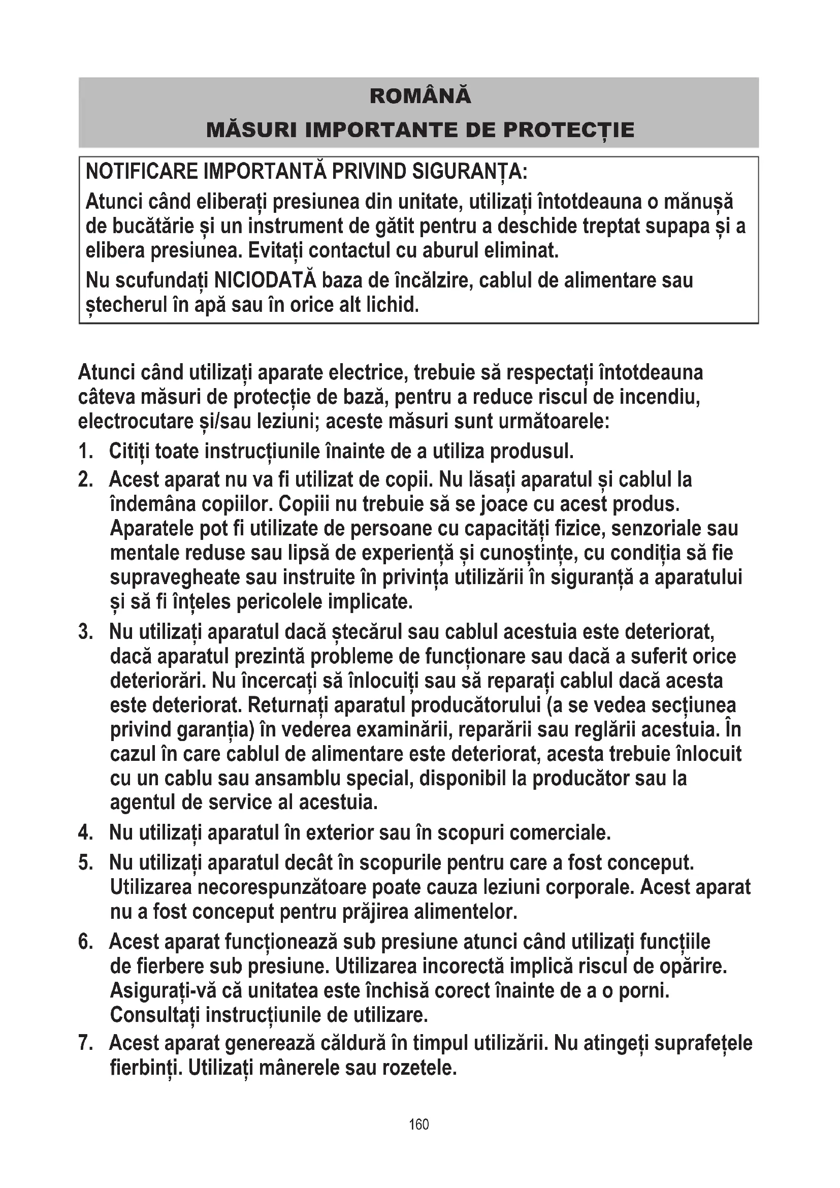 fierbinți. Utilizați mânerele sau rozetele. NOTIFICARE IMPORTANTĂ PRIVIND SIGURANȚA: Atunci când eliberați presiunea din unitate, utilizați întotdeauna o mănușă de bucătărie și un instrument de gătit pentru a deschide treptat supapa și a elibera presiunea. Evitați contactul cu aburul eliminat. Nu scufundați NICIODATĂ baza de încălzire, cablul de alimentare sau ștecherul în apă sau în orice alt lichid.161