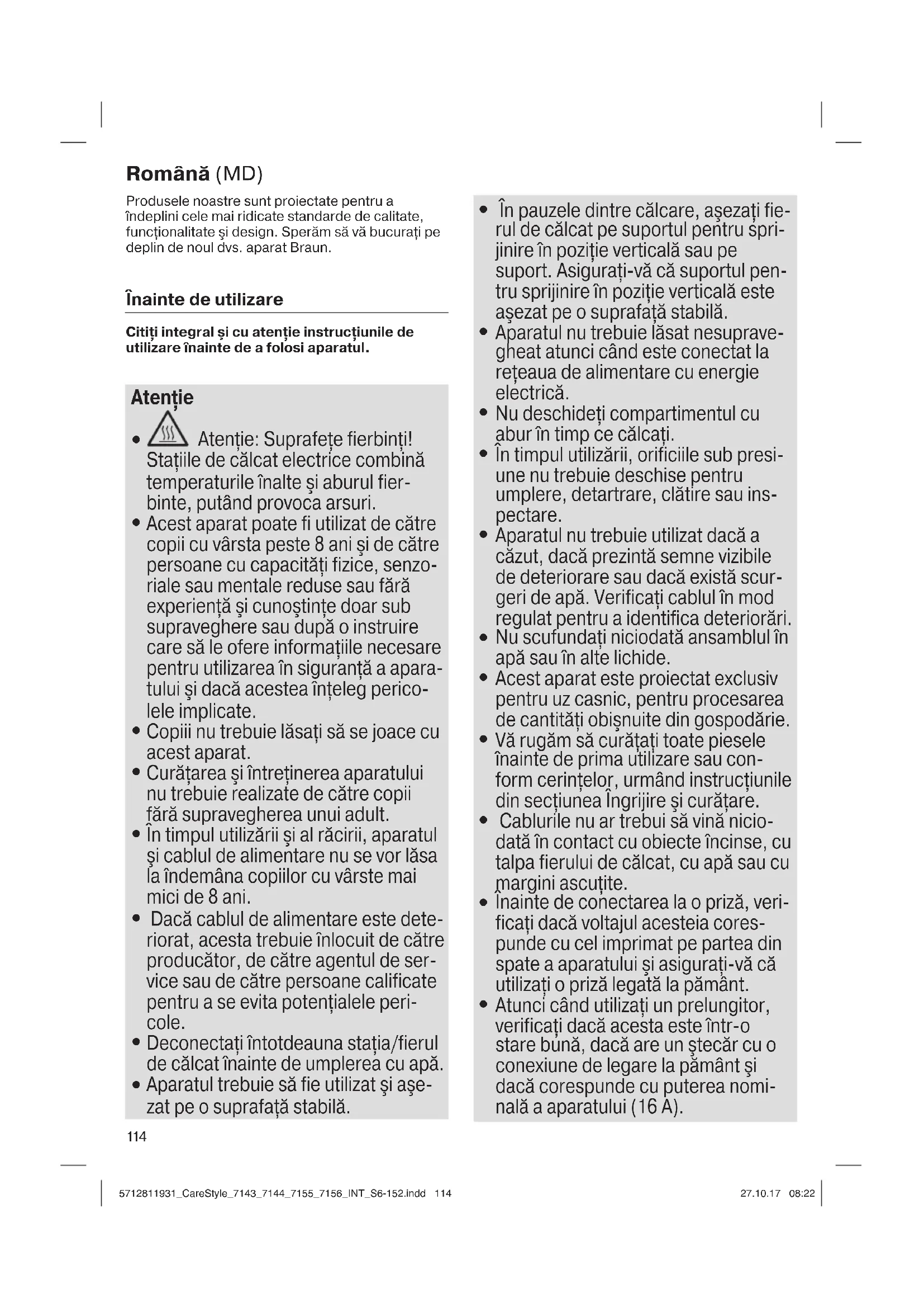 Atunci când utilizaţi un prelungitor, verificaţi dacă acesta este într-o stare bună, dacă are un ştecăr cu o conexiune de legare la pământ şi dacă corespunde cu puterea nomi- nală a aparatului (16 A). 5712811931_CareStyle_7143_7144_7155_7156_INT_S6-152.indd 1145712811931_CareStyle_7143_7144_7155_7156_INT_S6-152.indd 114 27.10.17 08:2227.10.17 08:2211 5