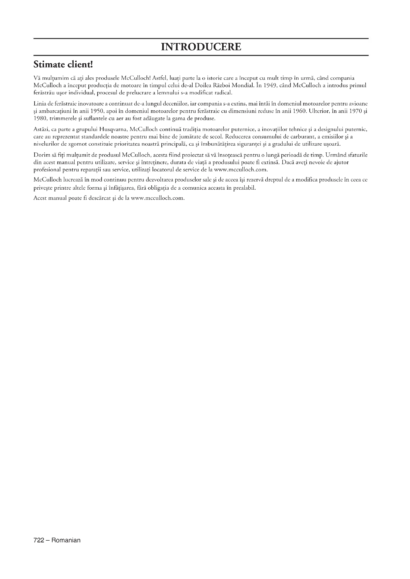 AVERTISMENT! Un ferãstrãu de defriäare, o maäinã de tãiat tufiäuri sau un trimer utilizate incorect sau neglijent, pot deveni unelte periculoase care pot duce la rãniri grave sau mortale a utilizatorului sau a altor persoane. Este foarte important sã citiöi äi sã înöelegeöi conöinulul acestui manual de utilizare. S1155295-38_5,B40B,BT ELITE.fm Page 721 Wednesday, September 12, 2018 5:01 PM722 – Romanian INTRODUCERE Stimate client! Vã mulöumim cã aöi ales produsele McCulloch! Astfel, luaöi parte la o istorie care a început cu mult timp în urmã, când compania McCulloch a început producöia de motoare în timpul celui de-al Doilea Rãzboi Mondial. În 1949, când McCulloch a introdus primul ferãstrãu uäor individual, procesul de prelucrare a lemnului s-a modificat radical. Linia de ferãstraie inovatoare a continuat de-a lungul deceniilor, iar compania s-a extins, mai întâi în domeniul motoarelor pentru avioane äi ambarcaöiuni în anii 1950, apoi în domeniul motoarelor pentru ferãstraie cu dimensiuni reduse în anii 1960. Ulterior, în anii 1970 äi 1980, trimmerele äi suflantele cu aer au fost adãugate la gama de produse. Astãzi, ca parte a grupului Husqvarna, McCulloch continuã tradiöia motoarelor puternice, a inovaöiilor tehnice äi a designului puternic, care au reprezentat standardele noastre pentru mai bine de jumãtate de secol. Reducerea consumului de carburant, a emisiilor äi a nivelurilor de zgomot constituie prioritatea noastrã principalã, ca äi îmbunãtãöirea siguranöei äi a gradului de utilizare uäoarã. Dorim sã fiöi mulöumit de produsul McCulloch, acesta fiind proiectat sã vã însoöeascã pentru o lungã perioadã de timp. Urmând sfaturile din acest manual pentru utilizare, service äi întreöinere, durata de viaöã a produsului poate fi extinsã. Dacã aveöi nevoie de ajutor profesional pentru reparaöii sau service, utilizaöi locatorul de service de la www.mcculloch.com. McCulloch lucreazã în mod continuu pentru dezvoltarea produselor sale äi de aceea îäi rezervã dreptul de a modifica produsele în ceea ce priveäte printre altele forma äi înfãöiäarea, fãrã obligaöia de a comunica aceasta în prealabil. Acest manual poate fi descãrcat äi de la www.mcculloch.com. S1155295-38_5,B40B,BT ELITE.fm Page 722 Wednesday, September 12, 2018 5:01 PMRomanian – 723