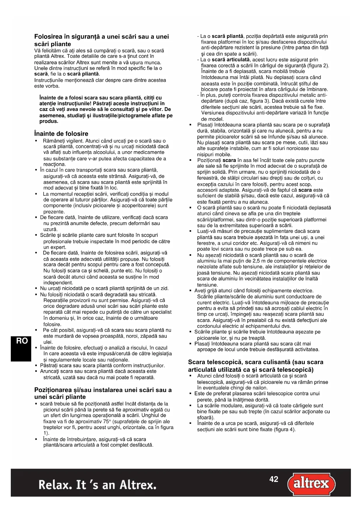 Folosirea în siguranță a unei scări sau a unei scări pliante Vă felicităm că ați ales să cumpărați o scară, sau o scară pliantă Altrex. Toate detaliile de care s-a ţinut cont în realizarea scărilor Altrex sunt menite a vă ușura munca. Unele dintre instrucțiuni se referă în mod specific fie la o scară, fie la o scară pliantă. Instrucțiunile menționează clar despre care dintre acestea este vorba. Înainte de a folosi scara sau scara pliantă, citiți cu atenție instrucțiunile! Păstrați aceste instrucțiuni în caz că veți avea nevoie să le consultați şi pe viitor. De asemenea, studiați şi ilustrațiile/pictogramele aflate pe produs. Înainte de folosire Rămâneți vigilent. Atunci când urcați pe o scară sau o scară pliantă, concentrați-vă și nu urcați niciodată dacă vă aflați sub influența alcoolului, a unor medicamente sau substanțe care v-ar putea afecta capacitatea de a reacţiona. În cazul în care transportați scara sau scara pliantă, asigurați-vă că aceasta este strânsă. Asigurați-vă, de asemenea, că scara sau scara pliantă este sprijinită în mod adecvat și bine fixată în loc. La momentul recepției scării, verificați condiția și modul de operare al tuturor părților. Asigurați-vă că toate părțile componente (inclusiv picioarele și acoperitoarele) sunt prezente. De fiecare dată, înainte de utilizare, verificați dacă scara nu prezintă anumite defecte, precum deformări sau uzură. Scările şi scările pliante care sunt folosite în scopuri profesionale trebuie inspectate în mod periodic de către un expert. De fiecare dată, înainte de folosirea scării, asigurați-vă că aceasta este adecvată utilității propuse. Nu folosiți scara decât pentru scopul pentru care a fost concepută. Nu folosiți scara ca şi schelă, punte etc. Nu folosiți o scară decât atunci când aceasta se susține în mod independent. Nu urcați niciodată pe o scară pliantă sprijinită de un zid. Nu folosiți niciodată o scară degradată sau stricată. Reparațiile provizorii nu sunt permise. Asigurați-vă că orice degradare adusă unei scări sau scări pliante este reparată cât mai repede cu putință de către un specialist în domeniu și, în orice caz, înainte de o următoare folosire. Pe cât posibil, asigurați-vă că scara sau scara pliantă nu este murdară de vopsea proaspătă, noroi, zăpadă sau ulei. Înainte de folosire, efectuaţi o analiză a riscului, în cazul în care aceasta vă este impusă/cerută de către legislația și regulamentele locale sau naționale. Păstrați scara sau scara pliantă conform instrucțiunilor. Aruncaţi scara sau scara pliantă dacă aceasta este stricată, uzată sau dacă nu mai poate fi reparată. Poziționarea și/sau instalarea unei scări sau a unei scări pliante scară trebuie să fie poziționată astfel încât distanța de la piciorul scării până la perete să fie aproximativ egală cu un sfert din lungimea operațională a scării. Unghiul de fixare va fi de aproximativ 75° (suprafețele de sprijin ale treptelor vor fi, pentru acest unghi, orizontale, ca în figura 1). Înainte de întrebuințare, asigurați-vă că scara pliantă/scara articulată a fost complet desfăcută.