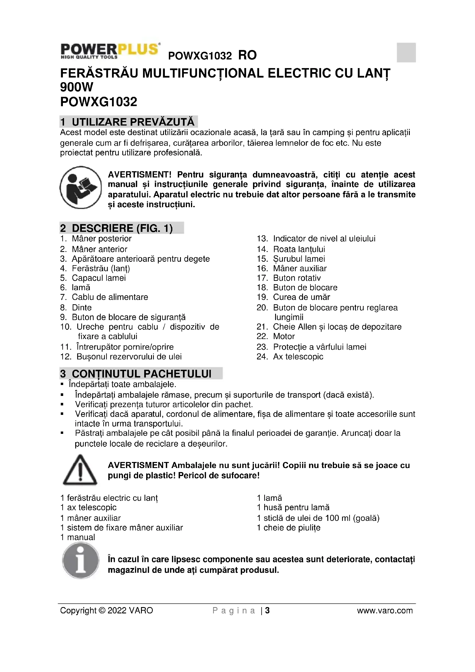 - Asigurați-vă că ferăstrăul cu lanț nu este păstrat la îndemâna copiilor.POWXG1032 RO Copyright © 2022 VARO P a g i n a | 7 www.varo.com