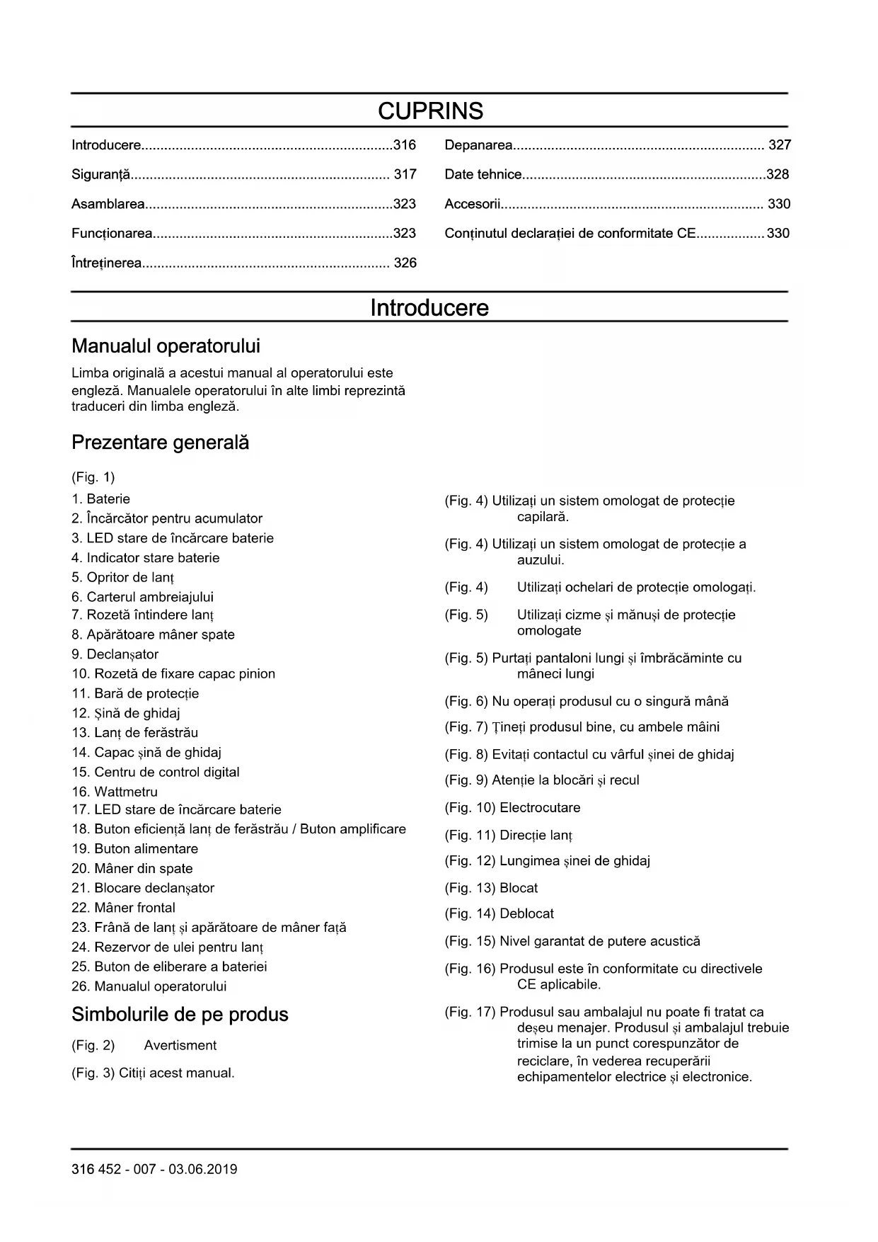Simbolurile de pe produs (Fig. 2) Avertisment (Fig. 3) Citiți acest manual. (Fig. 4) Utilizați un sistem omologat de protecție capilară. (Fig. 4) Utilizați un sistem omologat de protecție a auzului. (Fig. 4) Utilizați ochelari de protecție omologați. (Fig. 5) Utilizați cizme și mănuși de protecție omologate (Fig. 5) Purtați pantaloni lungi și îmbrăcăminte cu mâneci lungi (Fig. 6) Nu operați produsul cu o singură mână (Fig. 7) Țineți produsul bine, cu ambele mâini (Fig. 8) Evitați contactul cu vârful șinei de ghidaj (Fig. 9) Atenție la blocări și recul (Fig. 10) Electrocutare (Fig. 11) Direcție lanț (Fig. 12) Lungimea șinei de ghidaj (Fig. 13) Blocat (Fig. 14) Deblocat (Fig. 15) Nivel garantat de putere acustică (Fig. 16) Produsul este în conformitate cu directivele CE aplicabile. (Fig. 17) Produsul sau ambalajul nu poate fi tratat ca deșeu menajer. Produsul și ambalajul trebuie trimise la un punct corespunzător de reciclare, în vederea recuperării echipamentelor electrice și electronice. 316 452 - 007 - 03.06.2019(Fig. 18) A nu se lăsa, depozita sau utiliza în ploaie sau în condiții de umezeală. (Fig. 19) Reciclare Nota: Alte simboluri/autocolante de pe produs se referă la cerințele de certificare pentru alte zone comerciale. Răspunderea pentru produs Conform prevederilor legislației privind răspunderea pentru produs, nu ne asumăm răspunderea pentru daunele cauzate de produsul nostru dacă:
