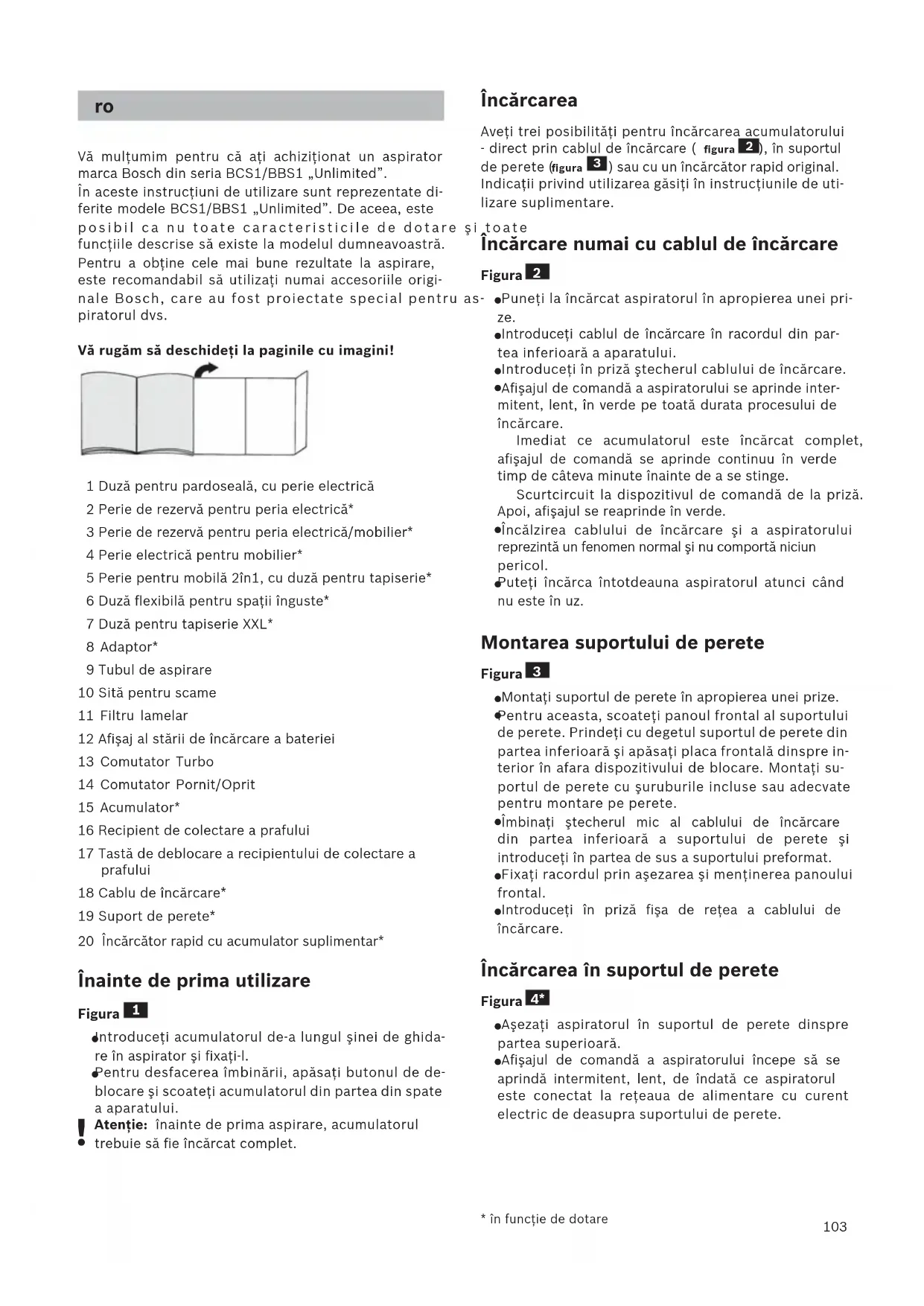 - в зависимости от комплектации103 Vă mulţumim pentru că aţi achiziţionat un aspirator marca Bosch din seria BCS1/BBS1 „Unlimited”. În aceste instrucţiuni de utilizare sunt reprezentate di- ferite modele BCS1/BBS1 „Unlimited”. De aceea, este posibil ca nu toate caracteristicile de dotare şi toate funcţiile descrise să existe la modelul dumneavoastră. Pentru a obţine cele mai bune rezultate la aspirare, este recomandabil să utilizaţi numai accesoriile origi- nale Bosch, care au fost proiectate special pentru as- piratorul dvs. Vă rugăm să deschideţi la paginile cu imagini! 1 Duză pentru pardoseală, cu perie electrică 2 Perie de rezervă pentru peria electrică* 3 Perie de rezervă pentru peria electrică/mobilier* 4 Perie electrică pentru mobilier* 5 Perie pentru mobilă 2în1, cu duză pentru tapiserie* 6 Duză flexibilă pentru spaţii înguste* 7 Duză pentru tapiserie XXL* 8 Adaptor* 9 Tubul de aspirare 10 Sită pentru scame 11 Filtru lamelar 12 Afişaj al stării de încărcare a bateriei 13 Comutator Turbo 14 Comutator Pornit/Oprit 15 Acumulator* 16 Recipient de colectare a prafului 17 Tastă de deblocare a recipientului de colectare a prafului 18 Cablu de încărcare* 19 Suport de perete* 20 Încărcător rapid cu acumulator suplimentar* Înainte de prima utilizare Figura