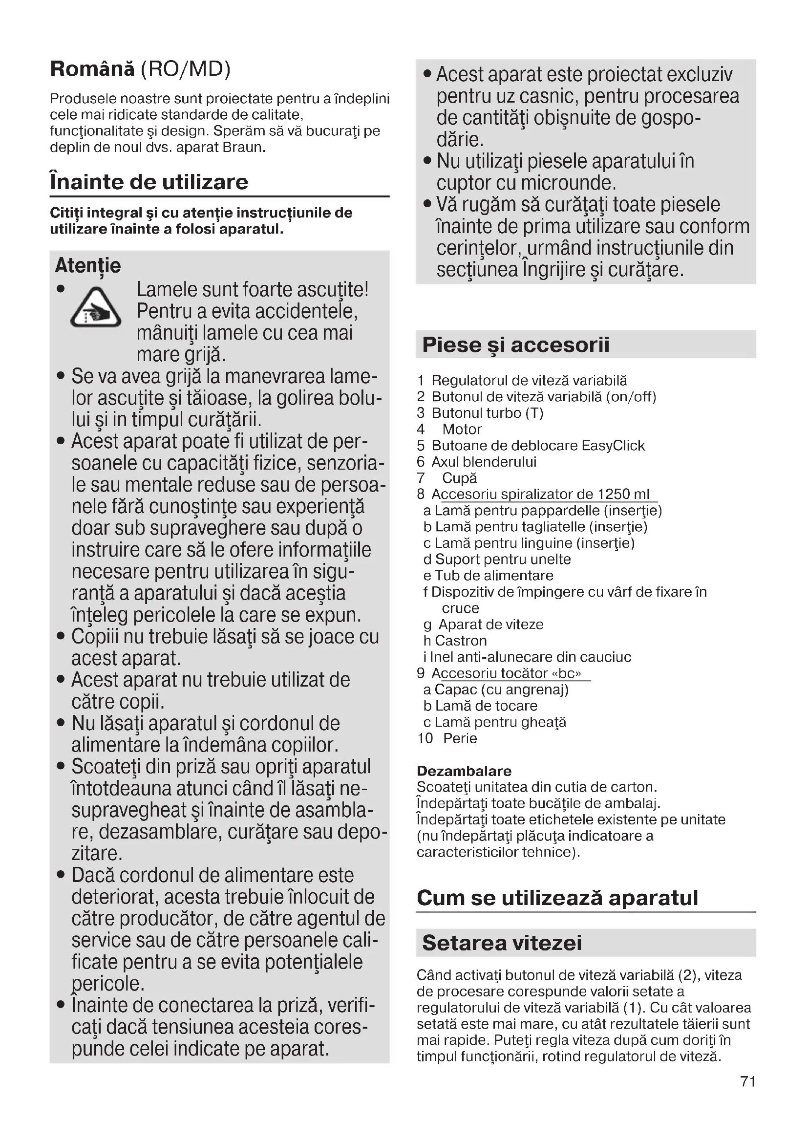 info@braunhousehold.com.tr 5722113184_MQ_5060-5064_INT_S6-96.indd 70 24.05.18 14:2871 Română (RO/MD) Produsele noastre sunt proiectate pentru a îndeplini cele mai ridicate standarde de calitate, funcţionalitate şi design. Sperăm să vă bucuraţi pe deplin de noul dvs. aparat Braun. Înainte de utilizare Citiţi integral şi cu atenţie instrucţiunile de utilizare înainte a folosi aparatul. Atenţie