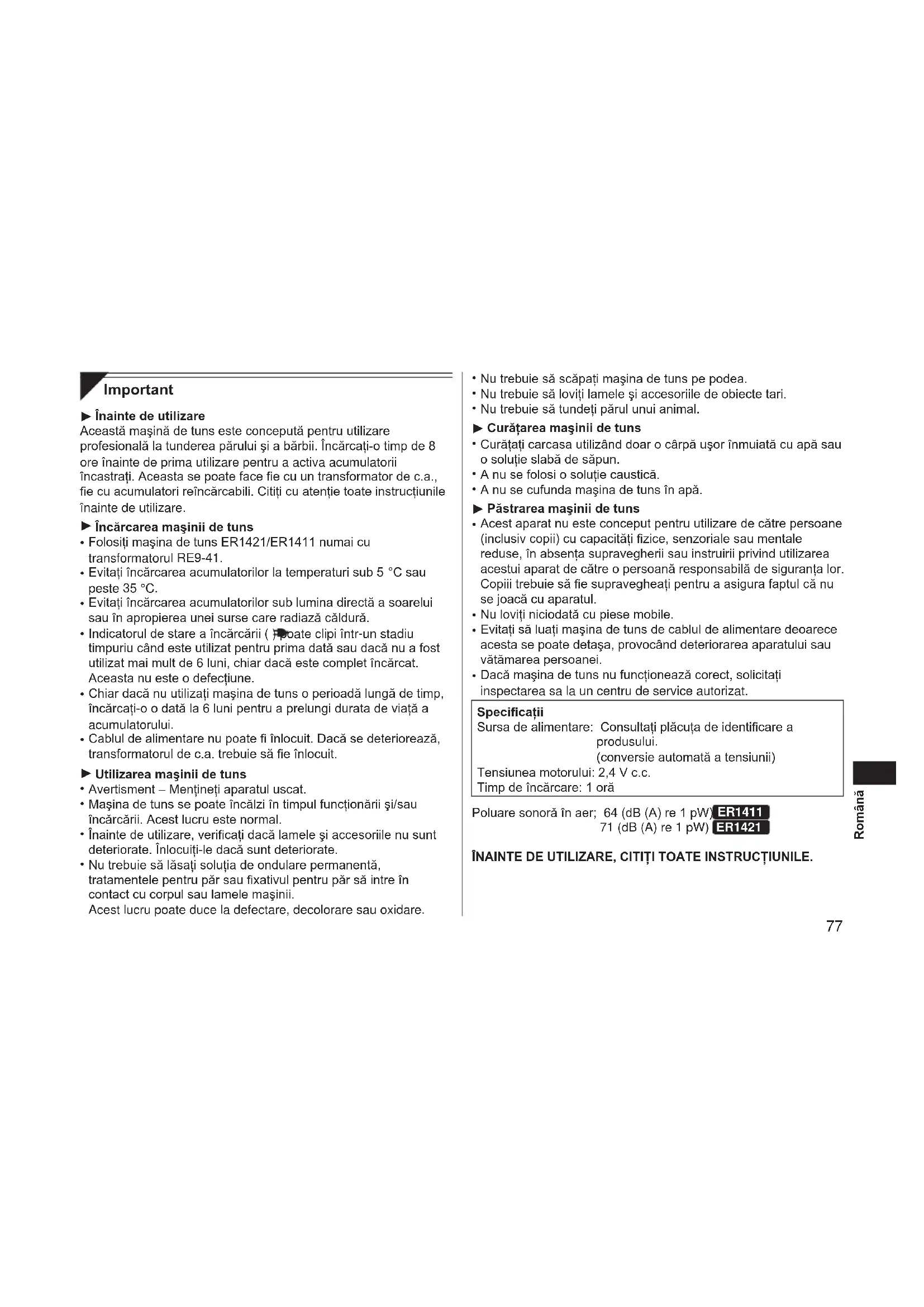 Nu trebuie să scăpaţi maşina de tuns pe podea. Nu trebuie să loviţi lamele şi accesoriile de obiecte tari. Nu trebuie să tundeţi părul unui animal. Curăţarea maşinii de tuns Curăţaţi carcasa utilizând doar o cârpă uşor înmuiată cu apă sau o soluţie slabă de săpun. A nu se folosi o soluţie caustică. A nu se cufunda maşina de tuns în apă. Păstrarea maşinii de tuns Acest aparat nu este conceput pentru utilizare de către persoane (inclusiv copii) cu capacităţi zice, senzoriale sau mentale reduse, în absenţa supravegherii sau instruirii privind utilizarea acestui aparat de către o persoană responsabilă de siguranţa lor. Copiii trebuie să e supravegheaţi pentru a asigura faptul că nu se joacă cu aparatul. Nu loviţi niciodată cu piese mobile. Evitaţi să luaţi maşina de tuns de cablul de alimentare deoarece acesta se poate detaşa, provocând deteriorarea aparatului sau vătămarea persoanei. Dacă maşina de tuns nu funcţionează corect, solicitaţi inspectarea sa la un centru de service autorizat. Specicaţii Sursa de alimentare: Consultaţi plăcuţa de identicare a produsului. (conversie automată a tensiunii) Tensiunea motorului: 2,4 V c.c. Timp de încărcare: 1 oră Poluare sonoră în aer; 64 (dB (A) re 1 pW) ER1411 71 (dB (A) re 1 pW) ER1421 ÎNAINTE DE UTILIZARE, CITIŢI TOATE INSTRUCŢIUNILE.