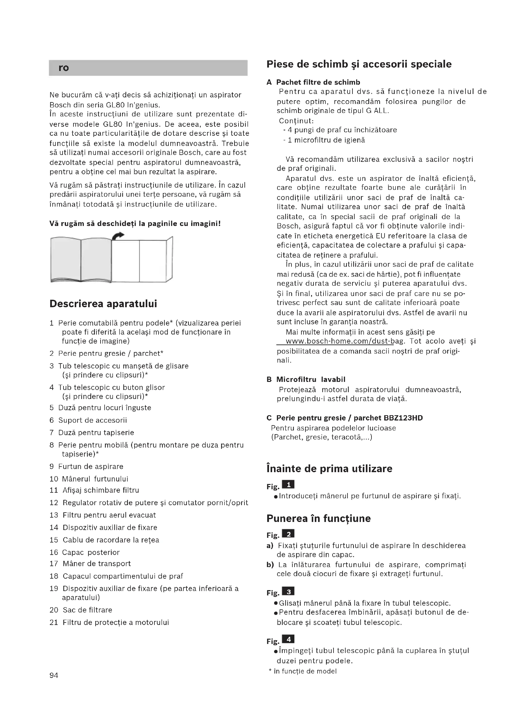 Ne bucurăm că v-aţi decis să achiziţionaţi un aspirator Bosch din seria GL80 In'genius. În aceste instrucţiuni de utilizare sunt prezentate di- verse modele GL80 In'genius. De aceea, este posibil ca nu toate particularităţile de dotare descrise şi toate funcţiile să existe la modelul dumneavoastră. Trebuie să utilizaţi numai accesorii originale Bosch, care au fost dezvoltate special pentru aspiratorul dumneavoastră, pentru a obţine cel mai bun rezultat la aspirare. Vă rugăm să păstraţi instrucţiunile de utilizare. În cazul predării aspiratorului unei terţe persoane, vă rugăm să înmânaţi totodată şi instrucţiunile de utilizare. Vă rugăm să deschideţi la paginile cu imagini! Descrierea aparatului 1 Perie comutabilă pentru podele* (vizualizarea periei poate fi diferită la acelaşi mod de funcţionare în funcţie de imagine) 2 Perie pentru gresie / parchet* 3 Tub telescopic cu manşetă de glisare (şi prindere cu clipsuri)* 4 Tub telescopic cu buton glisor (şi prindere cu clipsuri)* 5 Duză pentru locuri înguste 6 Suport de accesorii 7 Duză pentru tapiserie 8 Perie pentru mobilă (pentru montare pe duza pentru tapiserie)* 9 Furtun de aspirare 10 Mânerul furtunului 11 Afişaj schimbare filtru 12 Regulator rotativ de putere şi comutator pornit/oprit 13 Filtru pentru aerul evacuat 14 Dispozitiv auxiliar de fixare 15 Cablu de racordare la reţea 16 Capac posterior 17 Mâner de transport 18 Capacul compartimentului de praf 19 Dispozitiv auxiliar de fixare (pe partea inferioară a aparatului) 20 Sac de filtrare 21 Filtru de protecţie a motorului