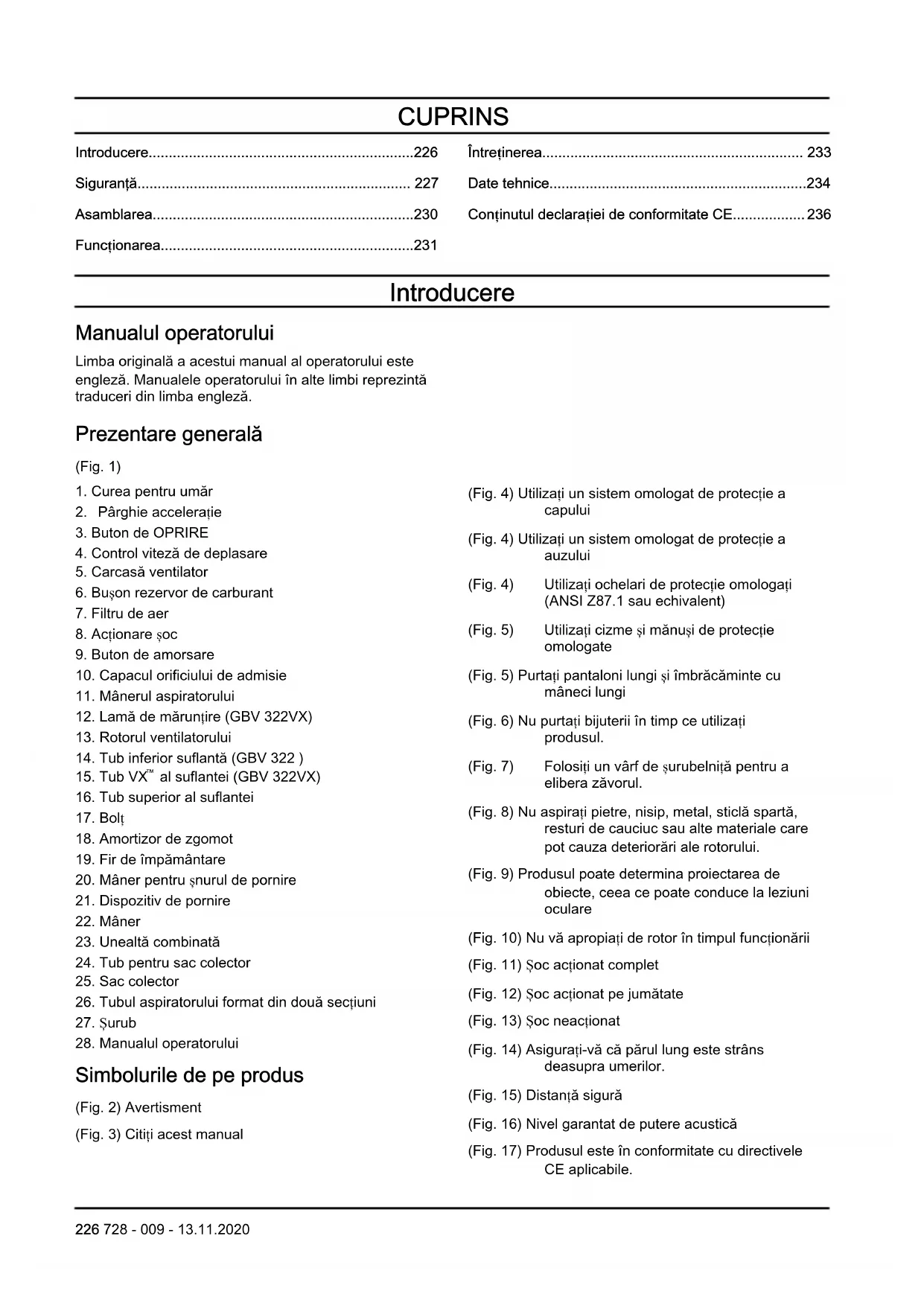 Simbolurile de pe produs (Fig. 2) Avertisment (Fig. 3) Citiți acest manual (Fig. 4) Utilizați un sistem omologat de protecție a capului (Fig. 4) Utilizați un sistem omologat de protecție a auzului (Fig. 4) Utilizați ochelari de protecție omologați (ANSI Z87.1 sau echivalent) (Fig. 5) Utilizați cizme și mănuși de protecție omologate (Fig. 5) Purtați pantaloni lungi și îmbrăcăminte cu mâneci lungi (Fig. 6) Nu purtați bijuterii în timp ce utilizați produsul. (Fig. 7) Folosiți un vârf de șurubelniță pentru a elibera zăvorul. (Fig. 8) Nu aspirați pietre, nisip, metal, sticlă spartă, resturi de cauciuc sau alte materiale care pot cauza deteriorări ale rotorului. (Fig. 9) Produsul poate determina proiectarea de obiecte, ceea ce poate conduce la leziuni oculare (Fig. 10) Nu vă apropiați de rotor în timpul funcționării (Fig. 11) Șoc acționat complet (Fig. 12) Șoc acționat pe jumătate (Fig. 13) Șoc neacționat (Fig. 14) Asigurați-vă că părul lung este strâns deasupra umerilor. (Fig. 15) Distanță sigură (Fig. 16) Nivel garantat de putere acustică (Fig. 17) Produsul este în conformitate cu directivele CE aplicabile. 226 728 - 009 - 13.11.2020(Fig. 18) Produsul este în conformitate cu directivele EAC aplicabile. (Fig. 19) Produsul este în conformitate cu directivele aplicabile în Ucraina. (Fig. 20) Produsul este în conformitate cu reglementările australiene privind compatibilitatea electromagnetică (EMC). Nota: Alte simboluri/autocolante de pe produs se referă la cerințele de certificare pentru alte zone comerciale. Emisiile de Euro V AVERTISMENT: În urma modificării neautorizate a motorului, este anulată aprobarea de tip UE pentru acest produs. Răspunderea pentru produs Conform prevederilor legislației privind răspunderea pentru produs, nu ne asumăm răspunderea pentru daunele cauzate de produsul nostru dacă: