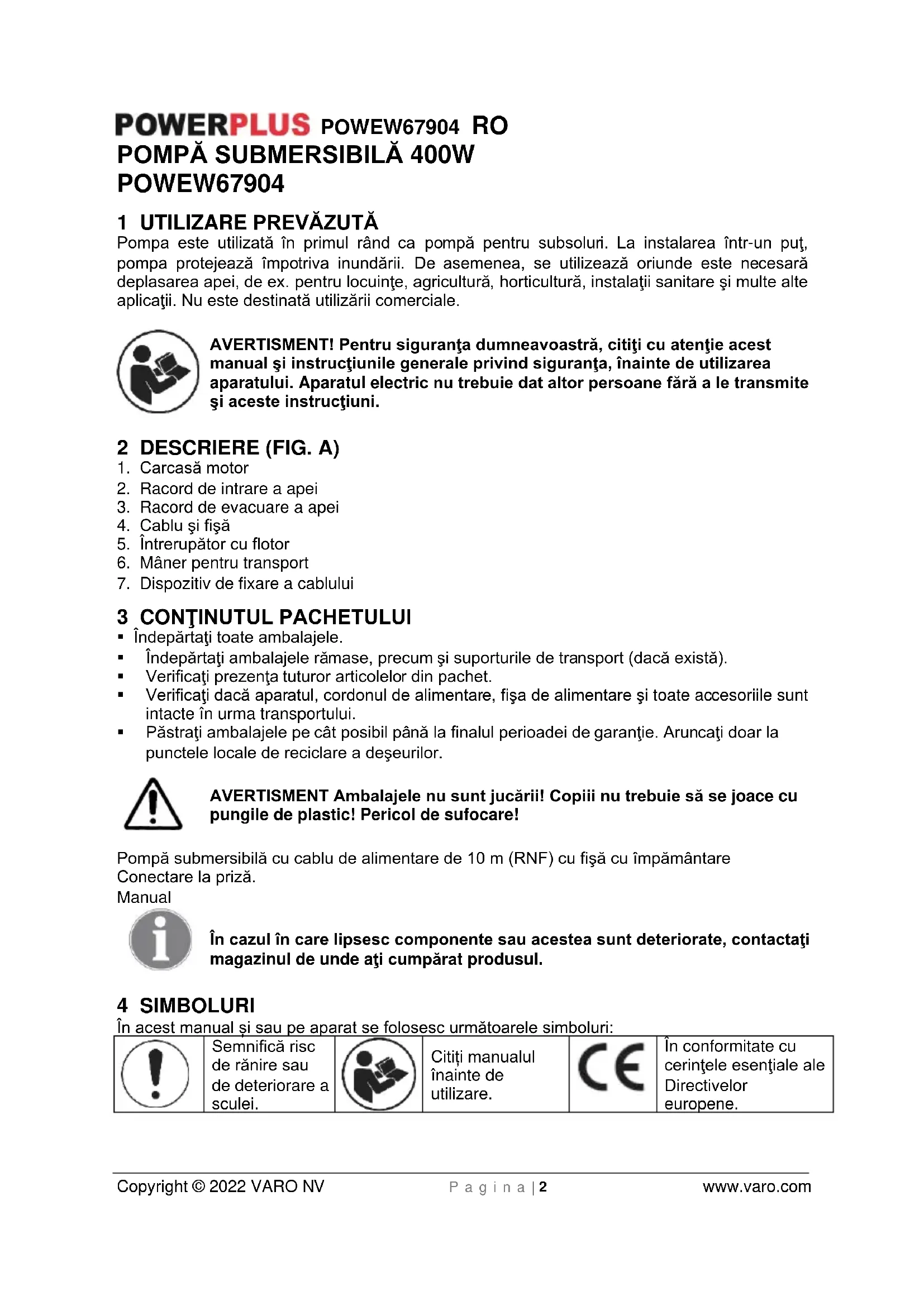 - în poziţie fixă, cu furtun. Reţineţi! Este interzisă instalarea pompei prin suspendare de conducta de refulare sau de cablul de alimentare, fără sprijin. Pompa submersibilă cu motor trebuie suspendată de mânerul special prevăzut sau aşezată pe fundul puţului. Pentru garantarea funcţionării corespunzătoare a pompei, pe fundul puţului nu trebuie să existe nămol sau murdărie de orice fel. Dacă nivelul apei scade prea mult, nămolul din puţ se va usca rapid şi va împiedica pornirea pompei. De aceea, pompa submersibilă cu motor trebuie verificată periodic (prin efectuarea unor teste de pornire). Flotorul este reglat astfel încât pompa să poată fi pornită imediat. Reţineţi! Puţul în care este instalată pompa trebuie să aibă dimensiuni minime de 40 x 40 x 50 cm, astfel încât întrerupătorul cu flotor să poată fi acţionat liber.POWEW67904 RO Copyright © 2022 VARO NV P a g i n a | 4 www.varo.com Reţeaua electrică Noua dvs. pompă submersibilă este prevăzută cu o fişă cu împământare, în conformitate cu reglementările. Pompa este destinată conectării la o priză cu împământare de 230 V - 50 Hz. Verificaţi dacă priza este suficient protejată (min. 6 A) şi este în perfectă stare. Introduceţi fişa în priză şi pompa este gata de utilizare. Notă importantă! În caz de deteriorare a cablului sau fişei cauzată de acţiuni exterioare, se interzice repararea cablului.