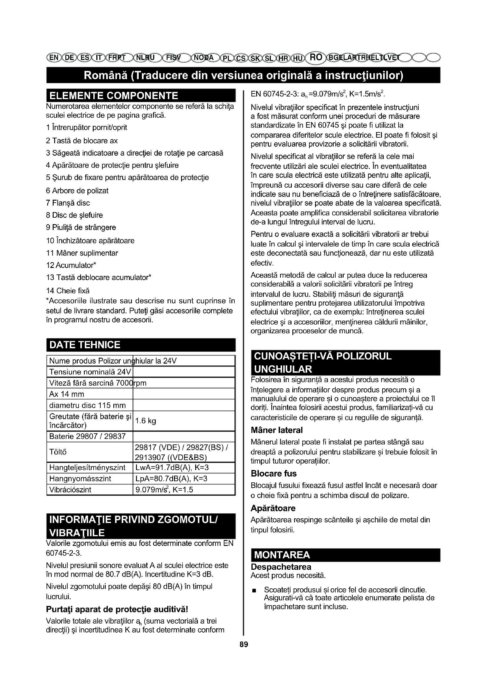 BG EL AR TR HE LT LV ET AVERTISMENT AVERTISMENT AVERTISMENT AVERTISMENT Încărcarea acumulatorului ■ Folosiţi numai încărcătoarele menţionate în datele tehnice. Numai aceste încărcătoare sunt adaptate la acumulatorul cu tehnologie litiu-ion montat în scula dumneavoastră electrică. Indicaţie: Acumulatorul se livrează parţial încărcat. Pentru a asigura funcţionarea la capacitatea nominală a acumulatorului, înainte de prima utilizare încărcaţi complet acumulatorul în încărcător. Acumulatorul cu tehnologie litiu-ion poate încărcat în orice moment, fără ca prin aceasta să i se reducă durata de viaţă. O întrerupere a procesului de încărcare nu dăunează acumulatorului. Acumulatorul cu tehnologie litiu-ion este protejat prin „Electronic Cell Protection (ECP)“ împotriva descărcării profunde. Când acumulatorul s-a descărcat, scula electrică este deconectată printr-un circuit de protecţie: dispozitivul de lucru nu se mai mişcă.betétszerszám nem mozog tovább. ■ După deconectarea automată a sculei electrice nu mai apăsaţi pe întrerupătorul pornit/oprit. Acumulatorul s-ar putea deteriora. Respectaţi instrucţiunile privind eliminarea. Extragerea acumulatorului (vezi gura A) Pentru extragerea acumulatorului apăsaţi tasta de deblocare 13 şi trageţi acumulatorul 12 spre spate afară din scula electrică. Nu forţaţi. Instalarea discului de polizare (a se vedea gura B) PERICOL Nu atașați niciodată o lamă de tăiat sau dăltuit lemn de niciun tip la acest polizor. Este proiectat doar pentru polizare și șlefuire. Folosirea pentru orice alt scop nu este recomandată și creează pericol, ce poate rezulta în vătămare gravă. AVERTISMENT Inspectați complet noul disc de polizat înainte de a-l instala pe polizor. ■ Loviți foarte ușor discul folosind un ciocan de lemn. ■ Ascultați cu atenție sunetele rezultate. Locurile cu fisuri sau crăpături vor rezulta a avea un sunet diferit. Nu folosiți un disc ce conține suri sau crăpături. Când instalați un nou disc de polizat, efectuați un test de rotire a discului, fără sarcină, pentru aproximativ un minut, avându-l îndreptat într-o direcție sigură, de ex. ferit de persoane sau obiecte. ■ Eliberați butonul de blocare al fusului și rotiți piulița clemei până când fusul se blochează. NOTĂ: Pentru a preveni deteriorarea fusului sau blocajul fusului, lăsați întotdeauna motorul să se oprească complet înainte de angajarea blocajului fusului. ■ Slăbiți (fig.B.3) și scoateți piulița clemei de pe fus. Nu scoateți flanșa discului. ■ Asigurați-vă cp părțile plate a părții inferioare ale flanșei discului sunt angajate cu părțile plate ale fusului. ■ Așezați discul de polizare în fus. AVERTISMENT Instalați întotdeauna discul de polizare cu centrul scăzut față de anșa discului. Neurmarea aceasta va cauza crăparea discului de șlefuire atunci când strângeți piulița clemei. Aceasta poate rezulta în vătămare personală gravă datorită particulelor slăbite ce se rup și aruncate de pe polizor. Nu strângeți excesiv. ■ Înșurubați piulița clemei pe fus cu partea plată a piuliței în sus. ■ Potriviți porțiunea ridicată și mică în diametru a piuliței clemei în gaura discului și strângeți-o cu mâna. ■ Eliberați butonul de blocare a fusului și rotiți discul în sensul acelor de ceas (fig.B.2) până când fusul se blochează în poziție.Română (Traducere din versiunea originală a instrucţiunilor)