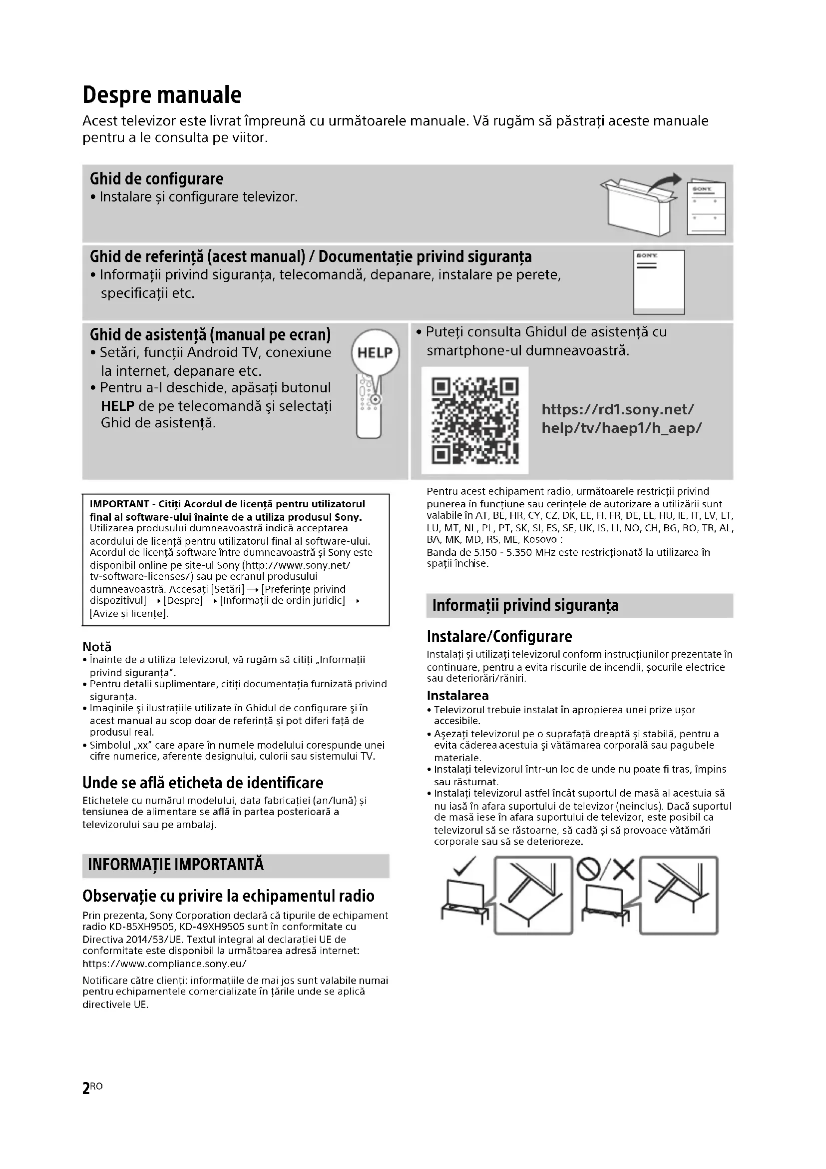 Observaţie cu privire la echipamentul radio Prin prezenta, Sony Corporation declară că tipurile de echipament radio KD-85XH9505, KD-49XH9505 sunt în conformitate cu Directiva 2014/53/UE. Textul integral al declarației UE de conformitate este disponibil la următoarea adresă internet: https://www.compliance.sony.eu/Notificare către clienţi: informaţiile de mai jos sunt valabile numai pentru echipamentele comercializate în ţările unde se aplică directivele UE.Pentru acest echipament radio, următoarele restricţii privind punerea în funcţiune sau cerinţele de autorizare a utilizării sunt valabile în AT, BE, HR, CY, CZ, DK, EE, FI, FR, DE, EL, HU, IE, IT, LV, LT, LU, MT, NL, PL, PT, SK, SI, ES, SE, UK, IS, LI, NO, CH, BG, RO, TR, AL, BA, MK, MD, RS, ME, Kosovo : Banda de 5.150 - 5.350 MHz este restricţionată la utilizarea în spaţii înch ise. Informaţii privind siguranţa Instalare/Configurare Instalaţi și utilizaţi televizorul conform instrucţiunilor prezentate în continuare, pentru a evita riscurile de incendii, șocurile electrice sau deteriorări/răniri. Instalarea