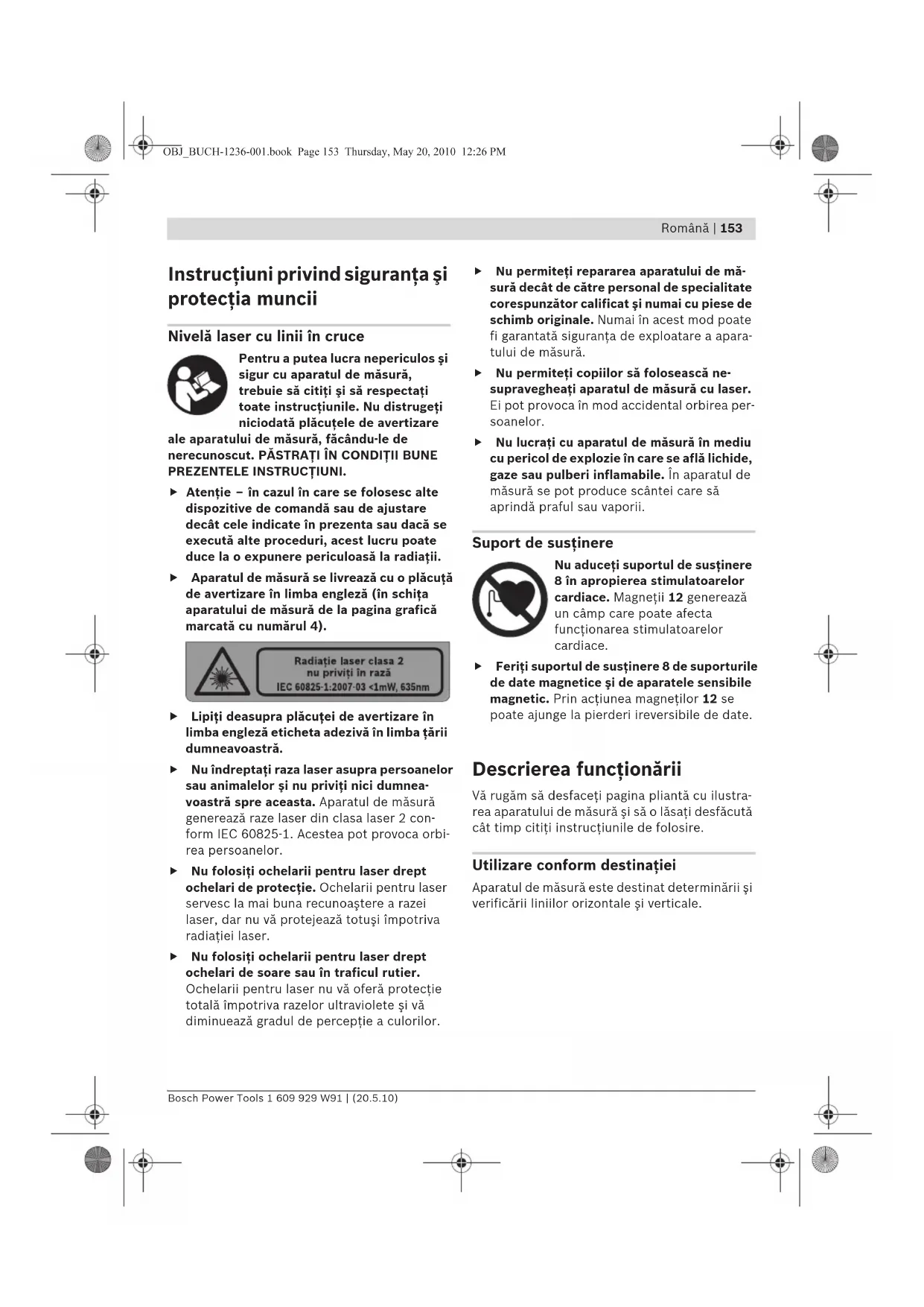 Instrucţiuni privind siguranţa şi protecţia muncii Nivelă laser cu linii în cruce Pentru a putea lucra nepericulos şi sigur cu aparatul de măsură, trebuie să citiţi şi să respectaţi toate instrucţiunile. Nu distrugeţi niciodată plăcuţele de avertizare ale aparatului de măsură, făcându-le de nerecunoscut. PĂSTRAŢI ÎN CONDIŢII BUNE PREZENTELE INSTRUCŢIUNI. f Atenţie – în cazul în care se folosesc alte dispozitive de comandă sau de ajustare decât cele indicate în prezenta sau dacă se execută alte proceduri, acest lucru poate duce la o expunere periculoasă la radiaţii. f Aparatul de măsură se livrează cu o plăcuţă de avertizare în limba engleză (în schiţa aparatului de măsură de la pagina grafică marcată cu numărul 4). f Lipiţi deasupra plăcuţei de avertizare în limba engleză eticheta adezivă în limba ţării dumneavoastră. f Nu îndreptaţi raza laser asupra persoanelor sau animalelor şi nu priviţi nici dumnea- voastră spre aceasta. Aparatul de măsură generează raze laser din clasa laser 2 con- form IEC 60825-1. Acestea pot provoca orbi- rea persoanelor. f Nu folosiţi ochelarii pentru laser drept ochelari de protecţie. Ochelarii pentru laser servesc la mai buna recunoaştere a razei laser, dar nu vă protejează totuşi împotriva radiaţiei laser. f Nu folosiţi ochelarii pentru laser drept ochelari de soare sau în traficul rutier. Ochelarii pentru laser nu vă oferă protecţie totală împotriva razelor ultraviolete şi vă diminuează gradul de percepţie a culorilor. f Nu permiteţi repararea aparatului de mă- sură decât de către personal de specialitate corespunzător calificat şi numai cu piese de schimb originale. Numai în acest mod poate fi garantată siguranţa de exploatare a apara- tului de măsură. f Nu permiteţi copiilor să folosească ne- supravegheaţi aparatul de măsură cu laser. Ei pot provoca în mod accidental orbirea per- soanelor. f Nu lucraţi cu aparatul de măsură în mediu cu pericol de explozie în care se află lichide, gaze sau pulberi inflamabile. În aparatul de măsură se pot produce scântei care să aprindă praful sau vaporii. Suport de susţinere Nu aduceţi suportul de susţinere 8 în apropierea stimulatoarelor cardiace. Magneţii 12 generează un câmp care poate afecta funcţionarea stimulatoarelor cardiace. f Feriţi suportul de susţinere 8 de suporturile de date magnetice şi de aparatele sensibile magnetic. Prin acţiunea magneţilor 12 se poate ajunge la pierderi ireversibile de date. Descrierea funcţionării Vă rugăm să desfaceţi pagina pliantă cu ilustra- rea aparatului de măsură şi să o lăsaţi desfăcută cât timp citiţi instrucţiunile de folosire. Utilizare conform destinaţiei Aparatul de măsură este destinat determinării şi verificării liniilor orizontale şi verticale. OBJ_BUCH-1236-001.book Page 153 Thursday, May 20, 2010 12:26 PM154 | Română 1 609 929 W91 | (20.5.10) Bosch Power Tools Date tehnice Elemente componente Numerotarea componentelor ilustrate se referă la schiţa de la pagina grafică. 1 Orificiu de ieşire radiaţie laser 2 Orificiu de prindere pentru stativ 1/4" 3 Întrerupător pornit/oprit 4 Plăcuţă de avertizare laser 5 Număr de serie 6 Dispozitiv de blocare compartiment baterie 7 Capac compartiment baterie 8 Suport de susţinere 9 Şurub de fixare suport de susţinere 10 Găuri pentru şuruburi suport de susţinere 11 Dispozitiv de ghidare pentru chingă 12 Magneţi 13 Orificiu de prindere pentru stativ 1/4" pe suportul de susţinere 14 Orificiu de prindere pentru stativ 5/8" pe suportul de susţinere 15 Geantă de protecţie 16 Ochelari optici pentru laser* 17 Placă de măsurare cu picior* 18 Stativ*
