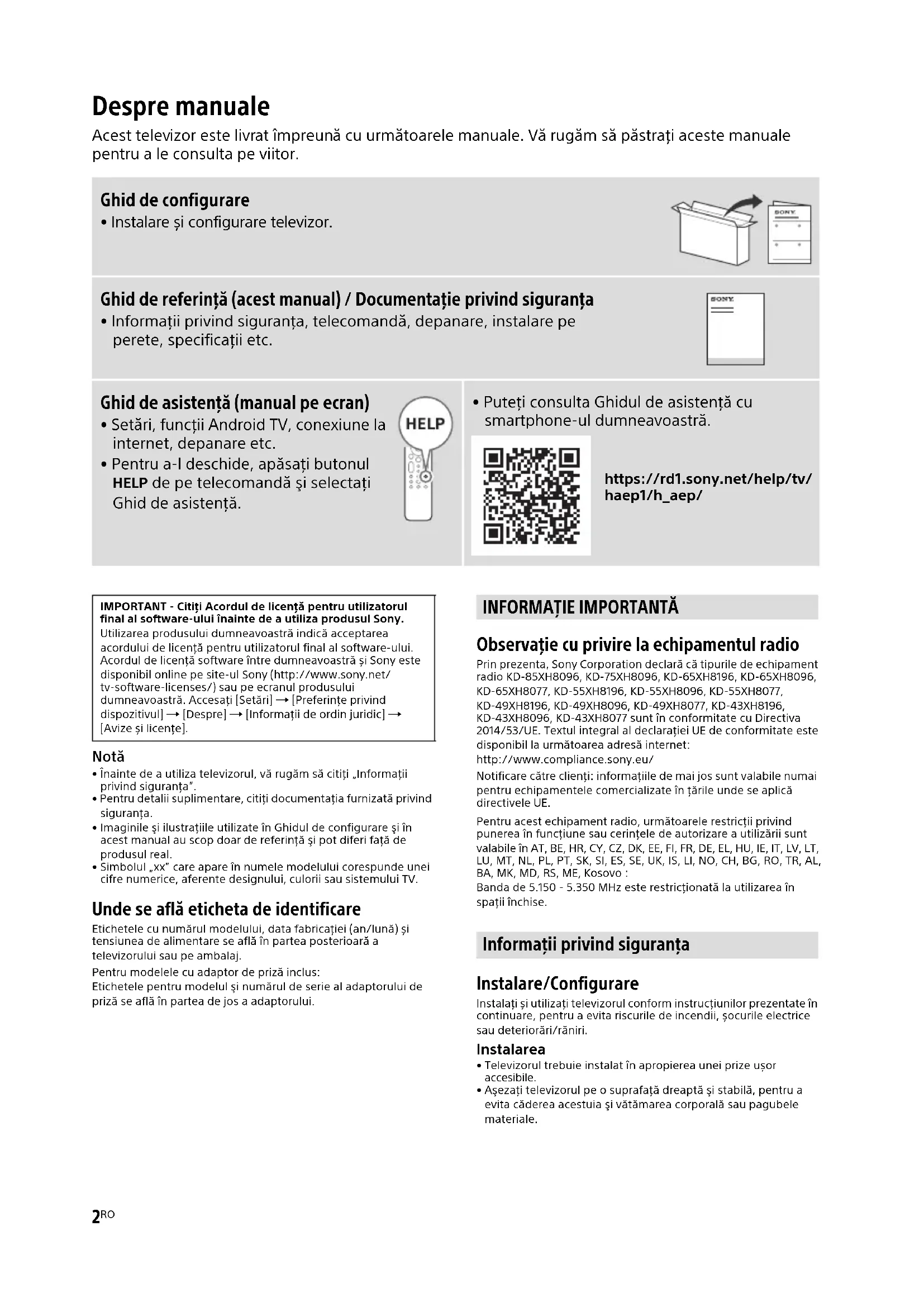 - Simbolul „xx” care apare în numele modelului corespunde unei cifre numerice, aferente designului, culorii sau sistemului TV. Unde se află eticheta de identificare Etichetele cu numărul modelului, data fabricaţiei (an/lună) și tensiunea de alimentare se află în partea posterioară a televizorului sau pe ambalaj. Pentru modelele cu adaptor de priză inclus: Etichetele pentru modelul şi numărul de serie al adaptorului de priză se află în partea de jos a adaptorului. Observaţie cu privire la echipamentul radio Prin prezenta, Sony Corporation declară că tipurile de echipament radio KD-85XH8096, KD-75XH8096, KD-65XH8196, KD-65XH8096, KD-65XH8077, KD-55XH8196, KD-55XH8096, KD-55XH8077, KD-49XH8196, KD-49XH8096, KD-49XH8077, KD-43XH8196, KD-43XH8096, KD-43XH8077 sunt în conformitate cu Directiva 2014/53/UE. Textul integral al declarației UE de conformitate este disponibil la următoarea adresă internet: http://www.compliance.sony.eu/ Notificare către clienţi: informaţiile de mai jos sunt valabile numai pentru echipamentele comercializate în ţările unde se aplică directivele UE. Pentru acest echipament radio, următoarele restricţii privind punerea în funcţiune sau cerinţele de autorizare a utilizării sunt valabile în AT, BE, HR, CY, CZ, DK, EE, FI, FR, DE, EL, HU, IE, IT, LV, LT, LU, MT, NL, PL, PT, SK, SI, ES, SE, UK, IS, LI, NO, CH, BG, RO, TR, AL, BA, MK, MD, RS, ME, Kosovo : Banda de 5.150 - 5.350 MHz este restricţionată la utilizarea în spaţii închise. Instalare/Configurare Instalaţi și utilizaţi televizorul conform instrucţiunilor prezentate în continuare, pentru a evita riscurile de incendii, șocurile electrice sau deteriorări/răniri. Instalarea
