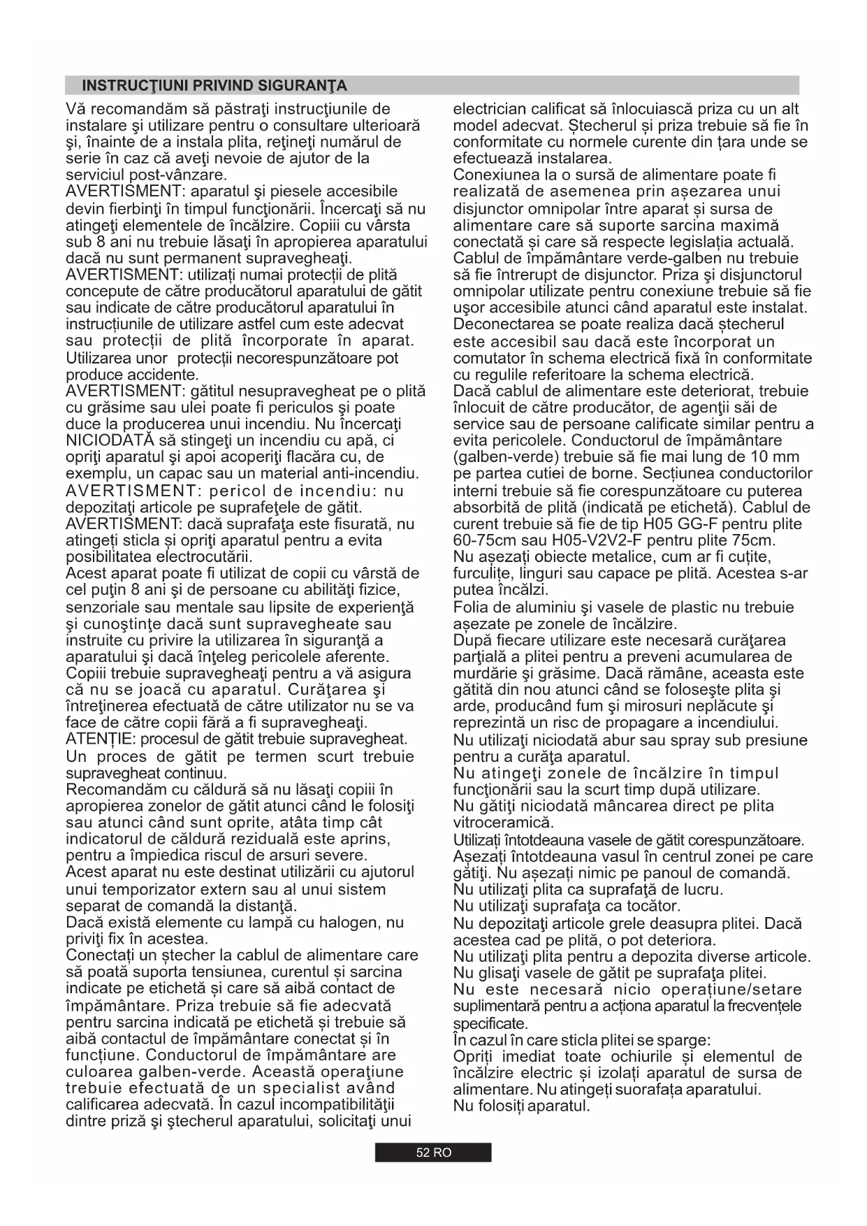 UR 3,5 kW52 RO Vă recomandăm să păstraţi instrucţiunile de instalare şi utilizare pentru o consultare ulterioară şi, înainte de a instala plita, reţineţi numărul de serie în caz că aveţi nevoie de ajutor de la serviciul post-vânzare. AVERTISMENT: gătitul nesupravegheat pe o plită cu grăsime sau ulei poate fi periculos şi poate duce la producerea unui incendiu. Nu încercaţi NICIODATĂ să stingeţi un incendiu cu apă, ci opriţi aparatul şi apoi acoperiţi flacăra cu, de exemplu, un capac sau un material anti-incendiu. Conecta¹i un ștecher la cablul de alimentare care să poată suporta tensiunea, curentul și sarcina indicate pe etichetă și care să aibă contact de împământare. Priza trebuie să fie adecvată pentru sarcina indicată pe etichetă și trebuie să aibă contactul de împământare conectat și în func¹iune. Conductorul de împământare are culoarea galben-verde. Această operaţiune trebuie efectuată de un specialist având calificarea adecvată. În cazul incompatibilităţii dintre priză şi ştecherul aparatului, solicitaţi unui Acest aparat poate fi utilizat de copii cu vârstă de cel puţin 8 ani şi de persoane cu abilităţi fizice, senzoriale sau mentale sau lipsite de experienţă şi cunoştinţe dacă sunt supravegheate sau instruite cu privire la utilizarea în siguranţă a aparatului şi dacă înţeleg pericolele aferente. Copiii trebuie supravegheaţi pentru a vă asigura că nu se joacă cu aparatul. Curăţarea şi întreţinerea efectuată de către utilizator nu se va face de către copii fără a fi supravegheaţi. AVERTISMENT: pericol de incendiu: nu depozitaţi articole pe suprafeţele de gătit. AVERTISMENT: dacă suprafaţa este fisurată, nu atinge¹i sticla și opriţi aparatul pentru a evita posibilitatea electrocutării. AVERTISMENT: aparatul şi piesele accesibile devin fierbinţi în timpul funcţionării. Încercaţi să nu atingeţi elementele de încălzire. Copiii cu vârsta sub 8 ani nu trebuie lăsaţi în apropierea aparatului dacă nu sunt permanent supravegheaţi. AVERTISMENT: utiliza¹i numai protec¹ii de plită concepute de către producătorul aparatului de gătit sau indicate de către producătorul aparatului în instruc¹iunile de utilizare astfel cum este adecvat sau protec¹ii de plită încorporate în aparat. Utilizarea unor protec¹ii necorespunzătoare pot produce accidente. ATEN¾IE: procesul de gătit trebuie supravegheat. Un proces de gătit pe termen scurt trebuie supravegheat continuu. Acest aparat nu este destinat utilizării cu ajutorul unui temporizator extern sau al unui sistem separat de comandă la distanţă. Recomandăm cu căldură să nu lăsaţi copiii în apropierea zonelor de gătit atunci când le folosiţi sau atunci când sunt oprite, atâta timp cât indicatorul de căldură reziduală este aprins, pentru a împiedica riscul de arsuri severe. Dacă există elemente cu lampă cu halogen, nu priviţi fix în acestea.