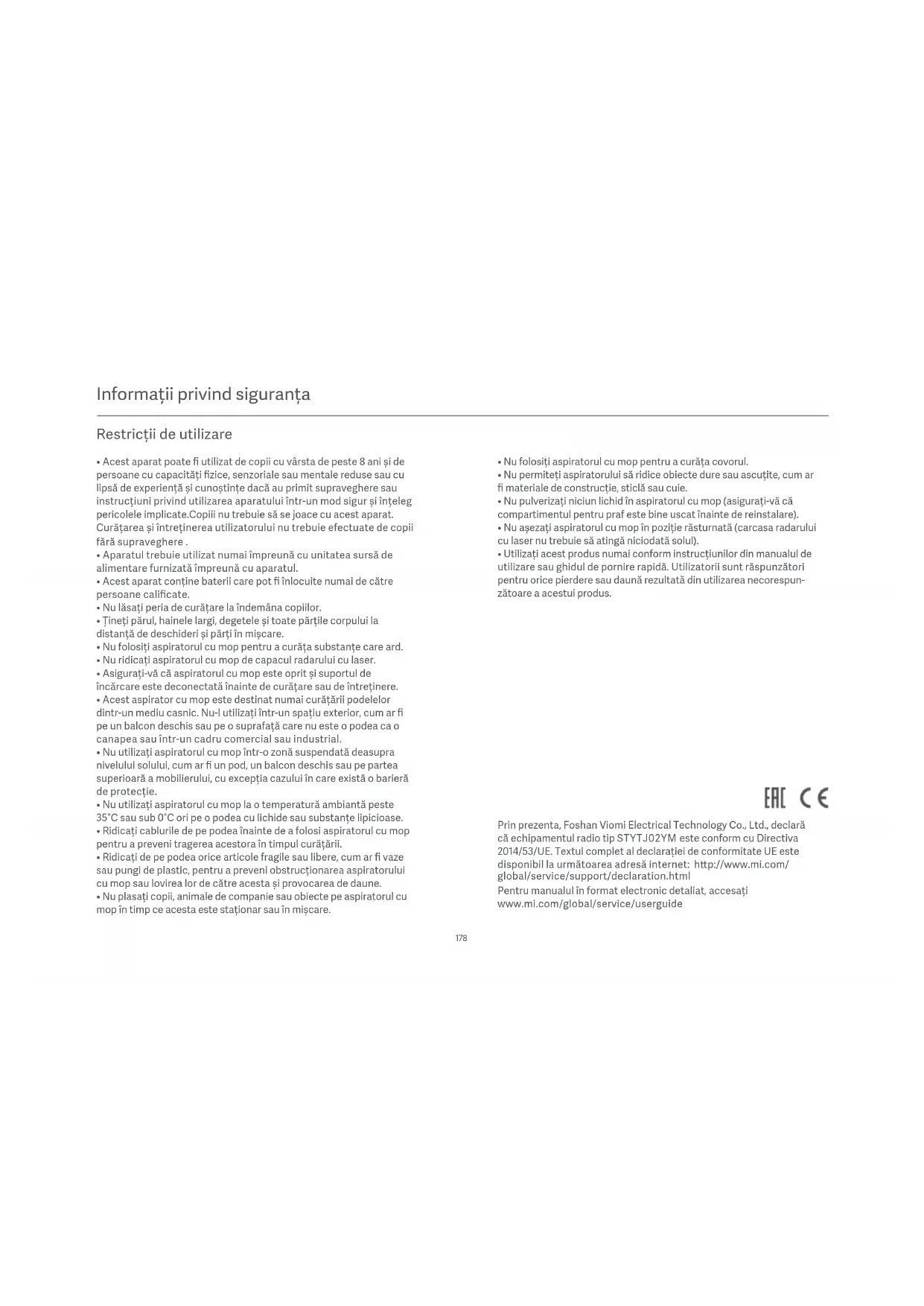 - Utilizați acest produs numai conform instrucțiunilor din manualul de utilizare sau ghidul de pornire rapidă. Utilizatorii sunt răspunzători pentru orice pierdere sau daună rezultată din utilizarea necorespun- zătoare a acestui produs. Prin prezenta, Foshan Viomi Electrical Technology Co., Ltd., declară că echipamentul radio tip STYTJ02YM este conform cu Directiva 2014/53/UE. Textul complet al declarației de conformitate UE este disponibil la următoarea adresă internet: hp://www.mi.com/ Pentru manualul în format electronic detaliat, accesați www.mi.com/global/service/userguide global/service/support/declaration.html179