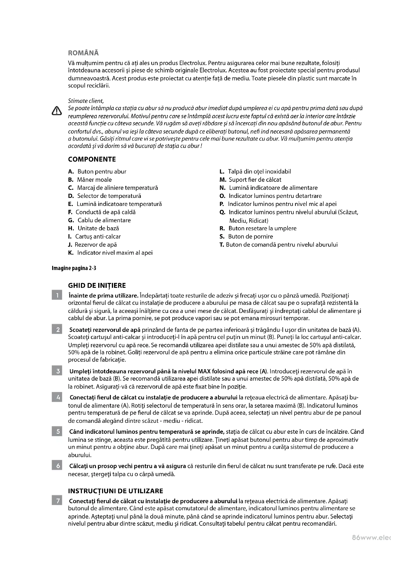 Se poate int'ampla ca staia cu abur sa nu produca abur imediat dupa umplerea ei cu apa pentru prima data sau dupa reumlerea rezervorului. Motivul pentru care se int'ampla acest lucru este faptul ca exista aer la interior care intarzie aceastafunctie cu cateva secunde. Va rugam sa avei rabdare si sa incercati din nou apasand butonul de abur. Pentru confrontul dvs., aburul va iesi la cateva secunde dupa ce eliberati butonul, nefi ind necessara apasarea permanenta a butonului. Gasi ritmul care vi se potriveste pentru cele mai bune rezultate cu abur. Va multurnim pentru atengia cordata si va dorim sa va bucuraşi de staia cu abur!