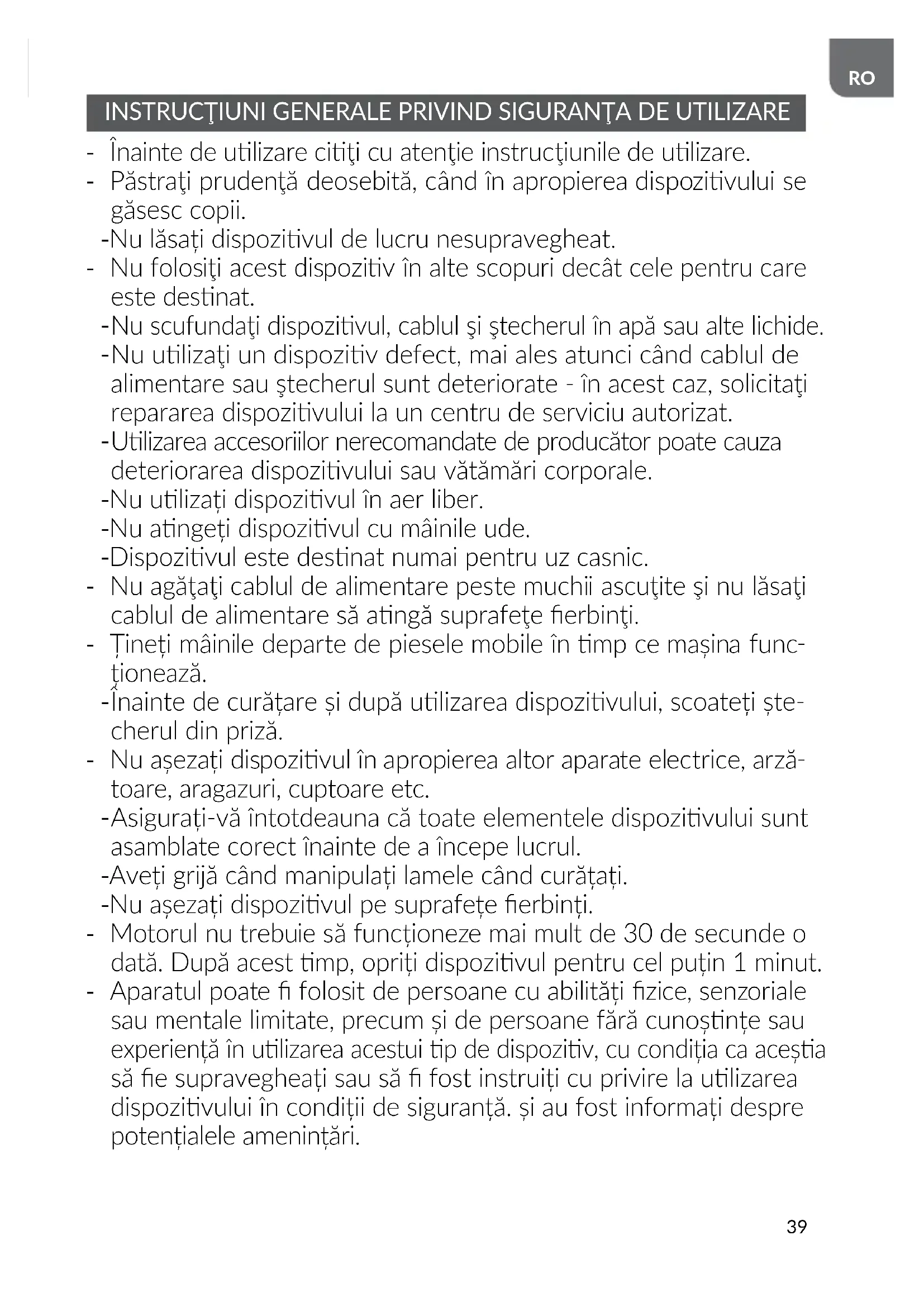 -Nu asezati dispositivul pe suprafete fierbinti. - Motorul nu trebuie să functioneze mai mult de 30 de secunde o data. După acest tamp, opriti dispositivul pentru cel putin 1 minut.
